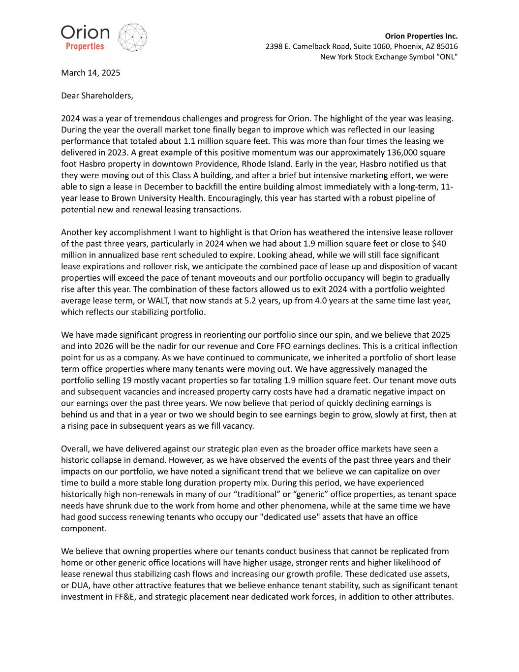 Orion Properties Inc. 2398 E. Camelback Road, Suite 1060, Phoenix, AZ 85016 New York Stock Exchange Symbol "ONL" March 14, 2025 Dear Shareholders, 2024 was a year of tremendous challenges and progress for Orion. The highlight of the year was leasing. During the year the overall market tone finally began to improve which was reflected in our leasing performance that totaled about 1.1 million square feet. This was more than four times the leasing we delivered in 2023. A great example of this positive momentum was our approximately 136,000 square foot Hasbro property in downtown Providence, Rhode Island. Early in the year, Hasbro notified us that they were moving out of this Class A building, and after a brief but intensive marketing effort, we were able to sign a lease in December to backfill the entire building almost immediately with a long-term, 11- year lease to Brown University Health. Encouragingly, this year has started with a robust pipeline of potential new and renewal leasing transactions. Another key accomplishment I want to highlight is that Orion has weathered the intensive lease rollover of the past three years, particularly in 2024 when we had about 1.9 million square feet or close to $40 million in annualized base rent scheduled to expire. Looking ahead, while we will still face significant lease expirations and rollover risk, we anticipate the combined pace of lease up and disposition of vacant properties will exceed the pace of tenant moveouts and our portfolio occupancy will begin to gradually rise after this year. The combination of these factors allowed us to exit 2024 with a portfolio weighted average lease term, or WALT, that now stands at 5.2 years, up from 4.0 years at the same time last year, which reflects our stabilizing portfolio. We have made significant progress in reorienting our portfolio since our spin, and we believe that 2025 and into 2026 will be the nadir for our revenue and Core FFO earnings declines. This is a critical inflection point for us as a company. As we have continued to communicate, we inherited a portfolio of short lease term office properties where many tenants were moving out. We have aggressively managed the portfolio selling 19 mostly vacant properties so far totaling 1.9 million square feet. Our tenant move outs and subsequent vacancies and increased property carry costs have had a dramatic negative impact on our earnings over the past three years. We now believe that period of quickly declining earnings is behind us and that in a year or two we should begin to see earnings begin to grow, slowly at first, then at a rising pace in subsequent years as we fill vacancy. Overall, we have delivered against our strategic plan even as the broader office markets have seen a historic collapse in demand. However, as we have observed the events of the past three years and their impacts on our portfolio, we have noted a significant trend that we believe we can capitalize on over time to build a more stable long duration property mix. During this period, we have experienced historically high non-renewals in many of our “traditional” or “generic” office properties, as tenant space needs have shrunk due to the work from home and other phenomena, while at the same time we have had good success renewing tenants who occupy our "dedicated use" assets that have an office component. We believe that owning properties where our tenants conduct business that cannot be replicated from home or other generic office locations will have higher usage, stronger rents and higher likelihood of lease renewal thus stabilizing cash flows and increasing our growth profile. These dedicated use assets, or DUA, have other attractive features that we believe enhance tenant stability, such as significant tenant investment in FF&E, and strategic placement near dedicated work forces, in addition to other attributes.