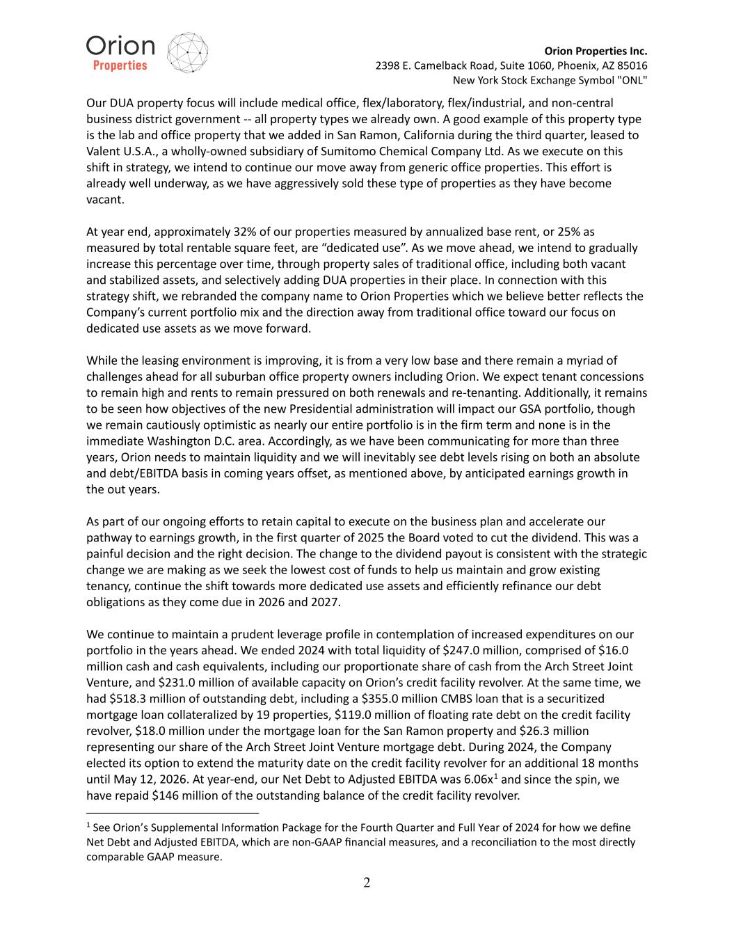 Orion Properties Inc. 2398 E. Camelback Road, Suite 1060, Phoenix, AZ 85016 New York Stock Exchange Symbol "ONL" 2 Our DUA property focus will include medical office, flex/laboratory, flex/industrial, and non-central business district government -- all property types we already own. A good example of this property type is the lab and office property that we added in San Ramon, California during the third quarter, leased to Valent U.S.A., a wholly-owned subsidiary of Sumitomo Chemical Company Ltd. As we execute on this shift in strategy, we intend to continue our move away from generic office properties. This effort is already well underway, as we have aggressively sold these type of properties as they have become vacant. At year end, approximately 32% of our properties measured by annualized base rent, or 25% as measured by total rentable square feet, are “dedicated use”. As we move ahead, we intend to gradually increase this percentage over time, through property sales of traditional office, including both vacant and stabilized assets, and selectively adding DUA properties in their place. In connection with this strategy shift, we rebranded the company name to Orion Properties which we believe better reflects the Company’s current portfolio mix and the direction away from traditional office toward our focus on dedicated use assets as we move forward. While the leasing environment is improving, it is from a very low base and there remain a myriad of challenges ahead for all suburban office property owners including Orion. We expect tenant concessions to remain high and rents to remain pressured on both renewals and re-tenanting. Additionally, it remains to be seen how objectives of the new Presidential administration will impact our GSA portfolio, though we remain cautiously optimistic as nearly our entire portfolio is in the firm term and none is in the immediate Washington D.C. area. Accordingly, as we have been communicating for more than three years, Orion needs to maintain liquidity and we will inevitably see debt levels rising on both an absolute and debt/EBITDA basis in coming years offset, as mentioned above, by anticipated earnings growth in the out years. As part of our ongoing efforts to retain capital to execute on the business plan and accelerate our pathway to earnings growth, in the first quarter of 2025 the Board voted to cut the dividend. This was a painful decision and the right decision. The change to the dividend payout is consistent with the strategic change we are making as we seek the lowest cost of funds to help us maintain and grow existing tenancy, continue the shift towards more dedicated use assets and efficiently refinance our debt obligations as they come due in 2026 and 2027. We continue to maintain a prudent leverage profile in contemplation of increased expenditures on our portfolio in the years ahead. We ended 2024 with total liquidity of $247.0 million, comprised of $16.0 million cash and cash equivalents, including our proportionate share of cash from the Arch Street Joint Venture, and $231.0 million of available capacity on Orion’s credit facility revolver. At the same time, we had $518.3 million of outstanding debt, including a $355.0 million CMBS loan that is a securitized mortgage loan collateralized by 19 properties, $119.0 million of floating rate debt on the credit facility revolver, $18.0 million under the mortgage loan for the San Ramon property and $26.3 million representing our share of the Arch Street Joint Venture mortgage debt. During 2024, the Company elected its option to extend the maturity date on the credit facility revolver for an additional 18 months until May 12, 2026. At year-end, our Net Debt to Adjusted EBITDA was 6.06x1 and since the spin, we have repaid $146 million of the outstanding balance of the credit facility revolver. 1 See Orion’s Supplemental Information Package for the Fourth Quarter and Full Year of 2024 for how we define Net Debt and Adjusted EBITDA, which are non-GAAP financial measures, and a reconciliation to the most directly comparable GAAP measure.