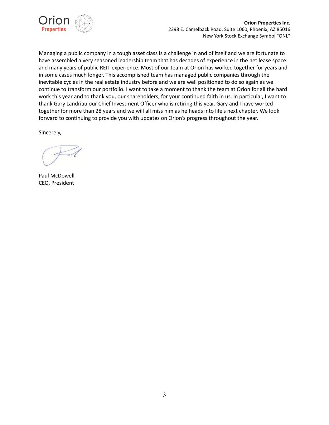 Orion Properties Inc. 2398 E. Camelback Road, Suite 1060, Phoenix, AZ 85016 New York Stock Exchange Symbol "ONL" 3 Managing a public company in a tough asset class is a challenge in and of itself and we are fortunate to have assembled a very seasoned leadership team that has decades of experience in the net lease space and many years of public REIT experience. Most of our team at Orion has worked together for years and in some cases much longer. This accomplished team has managed public companies through the inevitable cycles in the real estate industry before and we are well positioned to do so again as we continue to transform our portfolio. I want to take a moment to thank the team at Orion for all the hard work this year and to thank you, our shareholders, for your continued faith in us. In particular, I want to thank Gary Landriau our Chief Investment Officer who is retiring this year. Gary and I have worked together for more than 28 years and we will all miss him as he heads into life’s next chapter. We look forward to continuing to provide you with updates on Orion’s progress throughout the year. Sincerely, Paul McDowell CEO, President