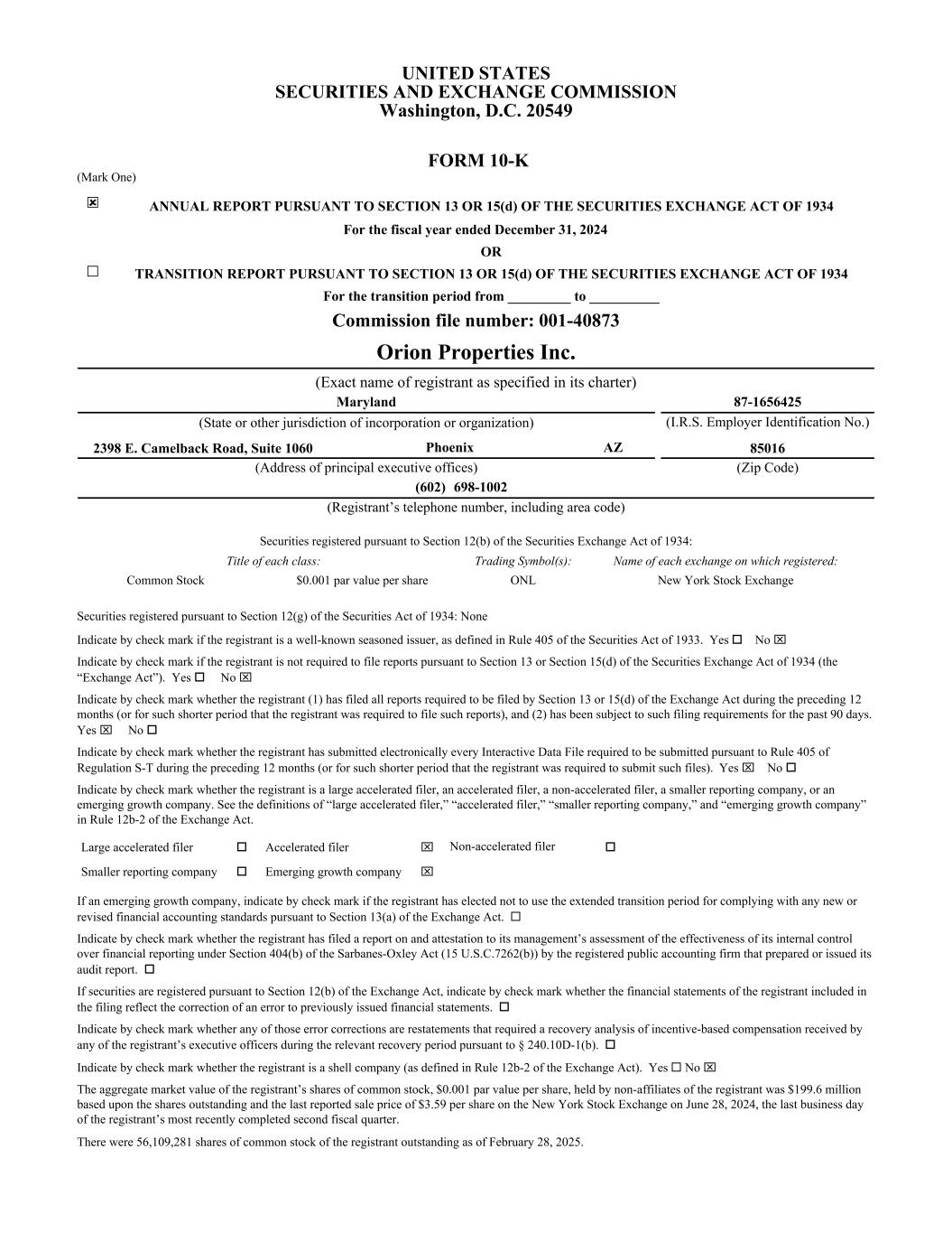 FORM 10-K (Mark One) ☒ ANNUAL REPORT PURSUANT TO SECTION 13 OR 15(d) OF THE SECURITIES EXCHANGE ACT OF 1934 For the fiscal year ended December 31, 2024 OR ☐ TRANSITION REPORT PURSUANT TO SECTION 13 OR 15(d) OF THE SECURITIES EXCHANGE ACT OF 1934 For the transition period from _________ to __________ Commission file number: 001-40873 Orion Properties Inc. (Exact name of registrant as specified in its charter) Maryland 87-1656425 (State or other jurisdiction of incorporation or organization) (I.R.S. Employer Identification No.) 2398 E. Camelback Road, Suite 1060 Phoenix AZ 85016 (Address of principal executive offices) (Zip Code) (602) 698-1002 (Registrant’s telephone number, including area code) Securities registered pursuant to Section 12(b) of the Securities Exchange Act of 1934: Title of each class: Trading Symbol(s): Name of each exchange on which registered: Common Stock $0.001 par value per share ONL New York Stock Exchange Securities registered pursuant to Section 12(g) of the Securities Act of 1934: None Indicate by check mark if the registrant is a well-known seasoned issuer, as defined in Rule 405 of the Securities Act of 1933. Yes o No x Indicate by check mark if the registrant is not required to file reports pursuant to Section 13 or Section 15(d) of the Securities Exchange Act of 1934 (the “Exchange Act”). Yes o No x Indicate by check mark whether the registrant (1) has filed all reports required to be filed by Section 13 or 15(d) of the Exchange Act during the preceding 12 months (or for such shorter period that the registrant was required to file such reports), and (2) has been subject to such filing requirements for the past 90 days. Yes x No o Indicate by check mark whether the registrant has submitted electronically every Interactive Data File required to be submitted pursuant to Rule 405 of Regulation S-T during the preceding 12 months (or for such shorter period that the registrant was required to submit such files). Yes x No o Indicate by check mark whether the registrant is a large accelerated filer, an accelerated filer, a non-accelerated filer, a smaller reporting company, or an emerging growth company. See the definitions of “large accelerated filer,” “accelerated filer,” “smaller reporting company,” and “emerging growth company” in Rule 12b-2 of the Exchange Act. Large accelerated filer o Accelerated filer x Non-accelerated filer o Smaller reporting company o Emerging growth company x If an emerging growth company, indicate by check mark if the registrant has elected not to use the extended transition period for complying with any new or revised financial accounting standards pursuant to Section 13(a) of the Exchange Act. ¨ Indicate by check mark whether the registrant has filed a report on and attestation to its management’s assessment of the effectiveness of its internal control over financial reporting under Section 404(b) of the Sarbanes-Oxley Act (15 U.S.C.7262(b)) by the registered public accounting firm that prepared or issued its audit report. o If securities are registered pursuant to Section 12(b) of the Exchange Act, indicate by check mark whether the financial statements of the registrant included in the filing reflect the correction of an error to previously issued financial statements. o Indicate by check mark whether any of those error corrections are restatements that required a recovery analysis of incentive-based compensation received by any of the registrant’s executive officers during the relevant recovery period pursuant to § 240.10D-1(b). o Indicate by check mark whether the registrant is a shell company (as defined in Rule 12b-2 of the Exchange Act). Yes ¨ No x The aggregate market value of the registrant’s shares of common stock, $0.001 par value per share, held by non-affiliates of the registrant was $199.6 million based upon the shares outstanding and the last reported sale price of $3.59 per share on the New York Stock Exchange on June 28, 2024, the last business day of the registrant’s most recently completed second fiscal quarter. There were 56,109,281 shares of common stock of the registrant outstanding as of February 28, 2025. UNITED STATES SECURITIES AND EXCHANGE COMMISSION Washington, D.C. 20549