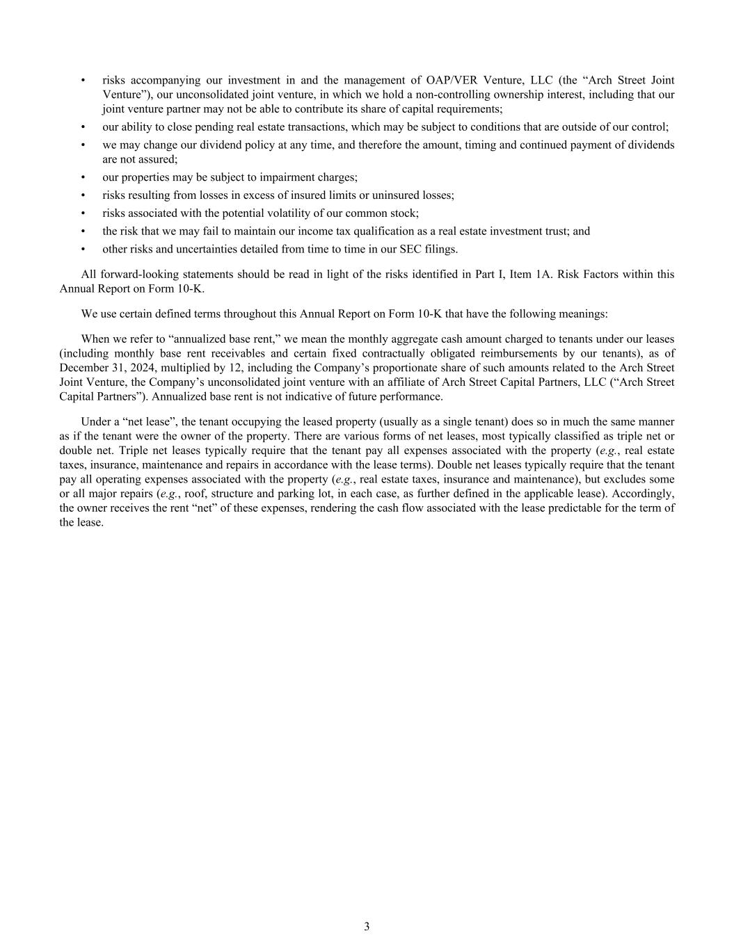 • risks accompanying our investment in and the management of OAP/VER Venture, LLC (the “Arch Street Joint Venture”), our unconsolidated joint venture, in which we hold a non-controlling ownership interest, including that our joint venture partner may not be able to contribute its share of capital requirements; • our ability to close pending real estate transactions, which may be subject to conditions that are outside of our control; • we may change our dividend policy at any time, and therefore the amount, timing and continued payment of dividends are not assured; • our properties may be subject to impairment charges; • risks resulting from losses in excess of insured limits or uninsured losses; • risks associated with the potential volatility of our common stock; • the risk that we may fail to maintain our income tax qualification as a real estate investment trust; and • other risks and uncertainties detailed from time to time in our SEC filings. All forward-looking statements should be read in light of the risks identified in Part I, Item 1A. Risk Factors within this Annual Report on Form 10-K. We use certain defined terms throughout this Annual Report on Form 10-K that have the following meanings: When we refer to “annualized base rent,” we mean the monthly aggregate cash amount charged to tenants under our leases (including monthly base rent receivables and certain fixed contractually obligated reimbursements by our tenants), as of December 31, 2024, multiplied by 12, including the Company’s proportionate share of such amounts related to the Arch Street Joint Venture, the Company’s unconsolidated joint venture with an affiliate of Arch Street Capital Partners, LLC (“Arch Street Capital Partners”). Annualized base rent is not indicative of future performance. Under a “net lease”, the tenant occupying the leased property (usually as a single tenant) does so in much the same manner as if the tenant were the owner of the property. There are various forms of net leases, most typically classified as triple net or double net. Triple net leases typically require that the tenant pay all expenses associated with the property (e.g., real estate taxes, insurance, maintenance and repairs in accordance with the lease terms). Double net leases typically require that the tenant pay all operating expenses associated with the property (e.g., real estate taxes, insurance and maintenance), but excludes some or all major repairs (e.g., roof, structure and parking lot, in each case, as further defined in the applicable lease). Accordingly, the owner receives the rent “net” of these expenses, rendering the cash flow associated with the lease predictable for the term of the lease. 3
