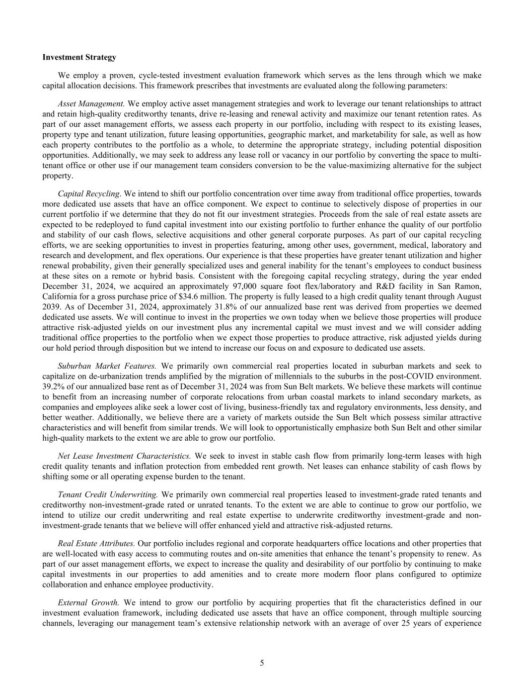 Investment Strategy We employ a proven, cycle-tested investment evaluation framework which serves as the lens through which we make capital allocation decisions. This framework prescribes that investments are evaluated along the following parameters: Asset Management. We employ active asset management strategies and work to leverage our tenant relationships to attract and retain high-quality creditworthy tenants, drive re-leasing and renewal activity and maximize our tenant retention rates. As part of our asset management efforts, we assess each property in our portfolio, including with respect to its existing leases, property type and tenant utilization, future leasing opportunities, geographic market, and marketability for sale, as well as how each property contributes to the portfolio as a whole, to determine the appropriate strategy, including potential disposition opportunities. Additionally, we may seek to address any lease roll or vacancy in our portfolio by converting the space to multi- tenant office or other use if our management team considers conversion to be the value-maximizing alternative for the subject property. Capital Recycling. We intend to shift our portfolio concentration over time away from traditional office properties, towards more dedicated use assets that have an office component. We expect to continue to selectively dispose of properties in our current portfolio if we determine that they do not fit our investment strategies. Proceeds from the sale of real estate assets are expected to be redeployed to fund capital investment into our existing portfolio to further enhance the quality of our portfolio and stability of our cash flows, selective acquisitions and other general corporate purposes. As part of our capital recycling efforts, we are seeking opportunities to invest in properties featuring, among other uses, government, medical, laboratory and research and development, and flex operations. Our experience is that these properties have greater tenant utilization and higher renewal probability, given their generally specialized uses and general inability for the tenant’s employees to conduct business at these sites on a remote or hybrid basis. Consistent with the foregoing capital recycling strategy, during the year ended December 31, 2024, we acquired an approximately 97,000 square foot flex/laboratory and R&D facility in San Ramon, California for a gross purchase price of $34.6 million. The property is fully leased to a high credit quality tenant through August 2039. As of December 31, 2024, approximately 31.8% of our annualized base rent was derived from properties we deemed dedicated use assets. We will continue to invest in the properties we own today when we believe those properties will produce attractive risk-adjusted yields on our investment plus any incremental capital we must invest and we will consider adding traditional office properties to the portfolio when we expect those properties to produce attractive, risk adjusted yields during our hold period through disposition but we intend to increase our focus on and exposure to dedicated use assets. Suburban Market Features. We primarily own commercial real properties located in suburban markets and seek to capitalize on de-urbanization trends amplified by the migration of millennials to the suburbs in the post-COVID environment. 39.2% of our annualized base rent as of December 31, 2024 was from Sun Belt markets. We believe these markets will continue to benefit from an increasing number of corporate relocations from urban coastal markets to inland secondary markets, as companies and employees alike seek a lower cost of living, business-friendly tax and regulatory environments, less density, and better weather. Additionally, we believe there are a variety of markets outside the Sun Belt which possess similar attractive characteristics and will benefit from similar trends. We will look to opportunistically emphasize both Sun Belt and other similar high-quality markets to the extent we are able to grow our portfolio. Net Lease Investment Characteristics. We seek to invest in stable cash flow from primarily long-term leases with high credit quality tenants and inflation protection from embedded rent growth. Net leases can enhance stability of cash flows by shifting some or all operating expense burden to the tenant. Tenant Credit Underwriting. We primarily own commercial real properties leased to investment-grade rated tenants and creditworthy non-investment-grade rated or unrated tenants. To the extent we are able to continue to grow our portfolio, we intend to utilize our credit underwriting and real estate expertise to underwrite creditworthy investment-grade and non- investment-grade tenants that we believe will offer enhanced yield and attractive risk-adjusted returns. Real Estate Attributes. Our portfolio includes regional and corporate headquarters office locations and other properties that are well-located with easy access to commuting routes and on-site amenities that enhance the tenant’s propensity to renew. As part of our asset management efforts, we expect to increase the quality and desirability of our portfolio by continuing to make capital investments in our properties to add amenities and to create more modern floor plans configured to optimize collaboration and enhance employee productivity. External Growth. We intend to grow our portfolio by acquiring properties that fit the characteristics defined in our investment evaluation framework, including dedicated use assets that have an office component, through multiple sourcing channels, leveraging our management team’s extensive relationship network with an average of over 25 years of experience 5