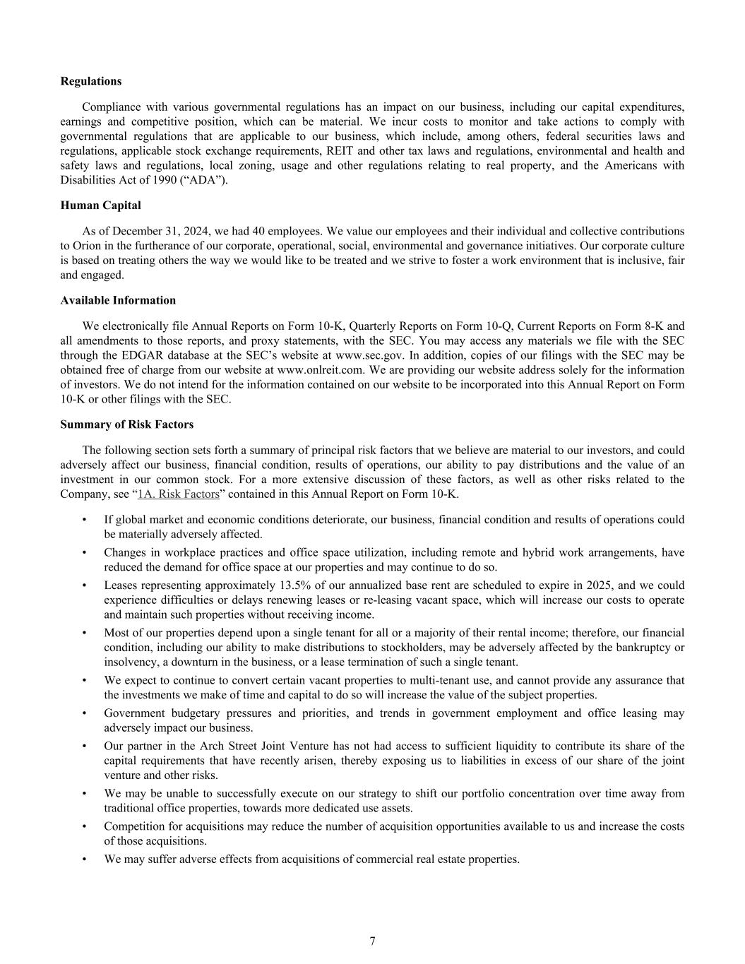 Regulations Compliance with various governmental regulations has an impact on our business, including our capital expenditures, earnings and competitive position, which can be material. We incur costs to monitor and take actions to comply with governmental regulations that are applicable to our business, which include, among others, federal securities laws and regulations, applicable stock exchange requirements, REIT and other tax laws and regulations, environmental and health and safety laws and regulations, local zoning, usage and other regulations relating to real property, and the Americans with Disabilities Act of 1990 (“ADA”). Human Capital As of December 31, 2024, we had 40 employees. We value our employees and their individual and collective contributions to Orion in the furtherance of our corporate, operational, social, environmental and governance initiatives. Our corporate culture is based on treating others the way we would like to be treated and we strive to foster a work environment that is inclusive, fair and engaged. Available Information We electronically file Annual Reports on Form 10-K, Quarterly Reports on Form 10-Q, Current Reports on Form 8-K and all amendments to those reports, and proxy statements, with the SEC. You may access any materials we file with the SEC through the EDGAR database at the SEC’s website at www.sec.gov. In addition, copies of our filings with the SEC may be obtained free of charge from our website at www.onlreit.com. We are providing our website address solely for the information of investors. We do not intend for the information contained on our website to be incorporated into this Annual Report on Form 10-K or other filings with the SEC. Summary of Risk Factors The following section sets forth a summary of principal risk factors that we believe are material to our investors, and could adversely affect our business, financial condition, results of operations, our ability to pay distributions and the value of an investment in our common stock. For a more extensive discussion of these factors, as well as other risks related to the Company, see “1A. Risk Factors” contained in this Annual Report on Form 10-K. • If global market and economic conditions deteriorate, our business, financial condition and results of operations could be materially adversely affected. • Changes in workplace practices and office space utilization, including remote and hybrid work arrangements, have reduced the demand for office space at our properties and may continue to do so. • Leases representing approximately 13.5% of our annualized base rent are scheduled to expire in 2025, and we could experience difficulties or delays renewing leases or re-leasing vacant space, which will increase our costs to operate and maintain such properties without receiving income. • Most of our properties depend upon a single tenant for all or a majority of their rental income; therefore, our financial condition, including our ability to make distributions to stockholders, may be adversely affected by the bankruptcy or insolvency, a downturn in the business, or a lease termination of such a single tenant. • We expect to continue to convert certain vacant properties to multi-tenant use, and cannot provide any assurance that the investments we make of time and capital to do so will increase the value of the subject properties. • Government budgetary pressures and priorities, and trends in government employment and office leasing may adversely impact our business. • Our partner in the Arch Street Joint Venture has not had access to sufficient liquidity to contribute its share of the capital requirements that have recently arisen, thereby exposing us to liabilities in excess of our share of the joint venture and other risks. • We may be unable to successfully execute on our strategy to shift our portfolio concentration over time away from traditional office properties, towards more dedicated use assets. • Competition for acquisitions may reduce the number of acquisition opportunities available to us and increase the costs of those acquisitions. • We may suffer adverse effects from acquisitions of commercial real estate properties. 7