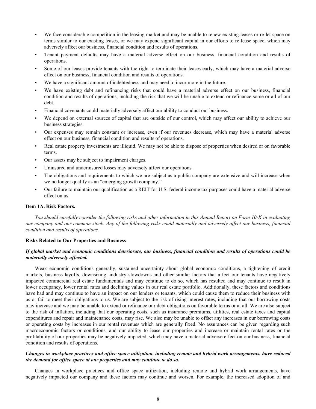 • We face considerable competition in the leasing market and may be unable to renew existing leases or re-let space on terms similar to our existing leases, or we may expend significant capital in our efforts to re-lease space, which may adversely affect our business, financial condition and results of operations. • Tenant payment defaults may have a material adverse effect on our business, financial condition and results of operations. • Some of our leases provide tenants with the right to terminate their leases early, which may have a material adverse effect on our business, financial condition and results of operations. • We have a significant amount of indebtedness and may need to incur more in the future. • We have existing debt and refinancing risks that could have a material adverse effect on our business, financial condition and results of operations, including the risk that we will be unable to extend or refinance some or all of our debt. • Financial covenants could materially adversely affect our ability to conduct our business. • We depend on external sources of capital that are outside of our control, which may affect our ability to achieve our business strategies. • Our expenses may remain constant or increase, even if our revenues decrease, which may have a material adverse effect on our business, financial condition and results of operations. • Real estate property investments are illiquid. We may not be able to dispose of properties when desired or on favorable terms. • Our assets may be subject to impairment charges. • Uninsured and underinsured losses may adversely affect our operations. • The obligations and requirements to which we are subject as a public company are extensive and will increase when we no longer qualify as an “emerging growth company.” • Our failure to maintain our qualification as a REIT for U.S. federal income tax purposes could have a material adverse effect on us. Item 1A. Risk Factors. You should carefully consider the following risks and other information in this Annual Report on Form 10-K in evaluating our company and our common stock. Any of the following risks could materially and adversely affect our business, financial condition and results of operations. Risks Related to Our Properties and Business If global market and economic conditions deteriorate, our business, financial condition and results of operations could be materially adversely affected. Weak economic conditions generally, sustained uncertainty about global economic conditions, a tightening of credit markets, business layoffs, downsizing, industry slowdowns and other similar factors that affect our tenants have negatively impacted commercial real estate fundamentals and may continue to do so, which has resulted and may continue to result in lower occupancy, lower rental rates and declining values in our real estate portfolio. Additionally, these factors and conditions have had and may continue to have an impact on our lenders or tenants, which could cause them to reduce their business with us or fail to meet their obligations to us. We are subject to the risk of rising interest rates, including that our borrowing costs may increase and we may be unable to extend or refinance our debt obligations on favorable terms or at all. We are also subject to the risk of inflation, including that our operating costs, such as insurance premiums, utilities, real estate taxes and capital expenditures and repair and maintenance costs, may rise. We also may be unable to offset any increases in our borrowing costs or operating costs by increases in our rental revenues which are generally fixed. No assurances can be given regarding such macroeconomic factors or conditions, and our ability to lease our properties and increase or maintain rental rates or the profitability of our properties may be negatively impacted, which may have a material adverse effect on our business, financial condition and results of operations. Changes in workplace practices and office space utilization, including remote and hybrid work arrangements, have reduced the demand for office space at our properties and may continue to do so. Changes in workplace practices and office space utilization, including remote and hybrid work arrangements, have negatively impacted our company and these factors may continue and worsen. For example, the increased adoption of and 8