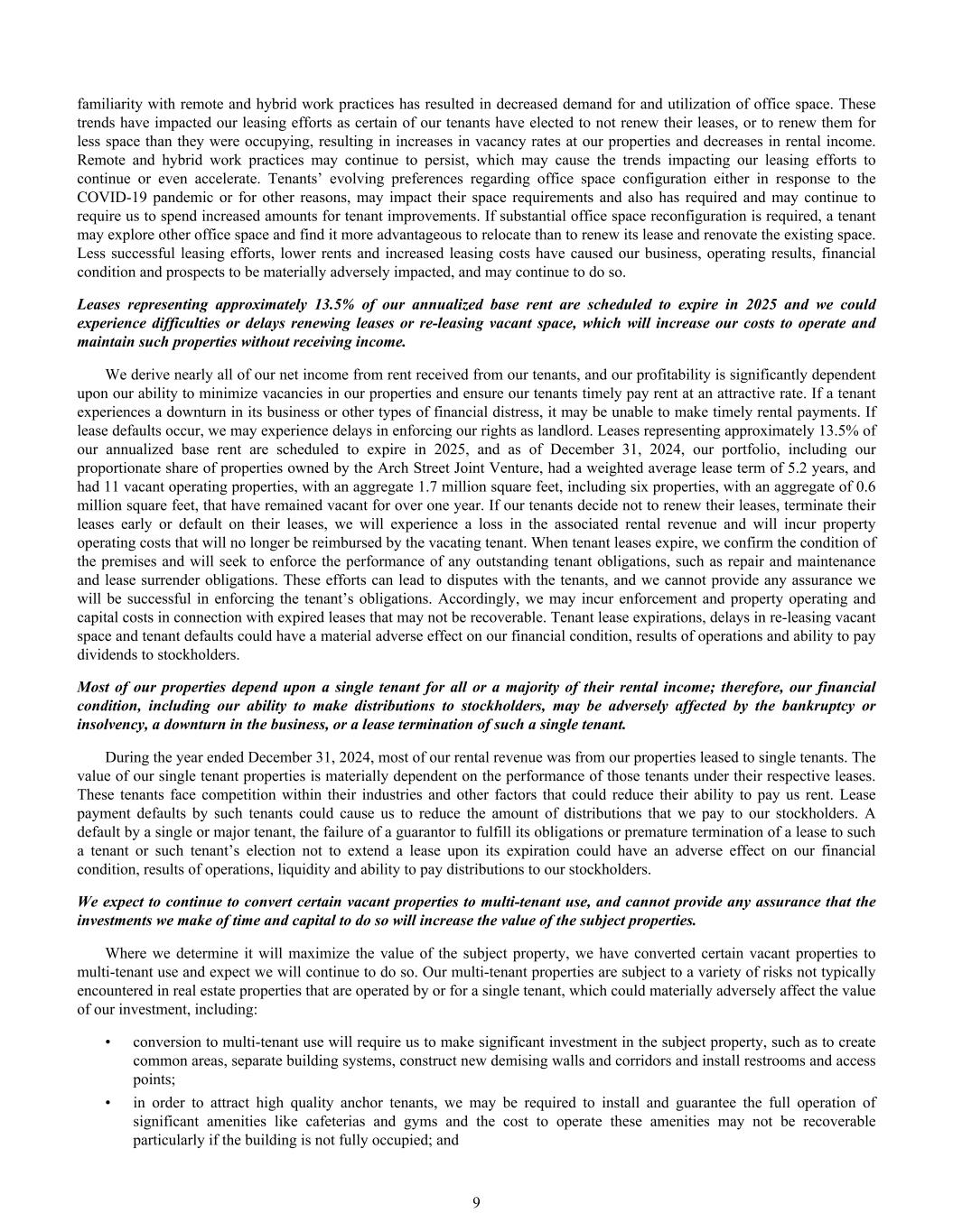 familiarity with remote and hybrid work practices has resulted in decreased demand for and utilization of office space. These trends have impacted our leasing efforts as certain of our tenants have elected to not renew their leases, or to renew them for less space than they were occupying, resulting in increases in vacancy rates at our properties and decreases in rental income. Remote and hybrid work practices may continue to persist, which may cause the trends impacting our leasing efforts to continue or even accelerate. Tenants’ evolving preferences regarding office space configuration either in response to the COVID-19 pandemic or for other reasons, may impact their space requirements and also has required and may continue to require us to spend increased amounts for tenant improvements. If substantial office space reconfiguration is required, a tenant may explore other office space and find it more advantageous to relocate than to renew its lease and renovate the existing space. Less successful leasing efforts, lower rents and increased leasing costs have caused our business, operating results, financial condition and prospects to be materially adversely impacted, and may continue to do so. Leases representing approximately 13.5% of our annualized base rent are scheduled to expire in 2025 and we could experience difficulties or delays renewing leases or re-leasing vacant space, which will increase our costs to operate and maintain such properties without receiving income. We derive nearly all of our net income from rent received from our tenants, and our profitability is significantly dependent upon our ability to minimize vacancies in our properties and ensure our tenants timely pay rent at an attractive rate. If a tenant experiences a downturn in its business or other types of financial distress, it may be unable to make timely rental payments. If lease defaults occur, we may experience delays in enforcing our rights as landlord. Leases representing approximately 13.5% of our annualized base rent are scheduled to expire in 2025, and as of December 31, 2024, our portfolio, including our proportionate share of properties owned by the Arch Street Joint Venture, had a weighted average lease term of 5.2 years, and had 11 vacant operating properties, with an aggregate 1.7 million square feet, including six properties, with an aggregate of 0.6 million square feet, that have remained vacant for over one year. If our tenants decide not to renew their leases, terminate their leases early or default on their leases, we will experience a loss in the associated rental revenue and will incur property operating costs that will no longer be reimbursed by the vacating tenant. When tenant leases expire, we confirm the condition of the premises and will seek to enforce the performance of any outstanding tenant obligations, such as repair and maintenance and lease surrender obligations. These efforts can lead to disputes with the tenants, and we cannot provide any assurance we will be successful in enforcing the tenant’s obligations. Accordingly, we may incur enforcement and property operating and capital costs in connection with expired leases that may not be recoverable. Tenant lease expirations, delays in re-leasing vacant space and tenant defaults could have a material adverse effect on our financial condition, results of operations and ability to pay dividends to stockholders. Most of our properties depend upon a single tenant for all or a majority of their rental income; therefore, our financial condition, including our ability to make distributions to stockholders, may be adversely affected by the bankruptcy or insolvency, a downturn in the business, or a lease termination of such a single tenant. During the year ended December 31, 2024, most of our rental revenue was from our properties leased to single tenants. The value of our single tenant properties is materially dependent on the performance of those tenants under their respective leases. These tenants face competition within their industries and other factors that could reduce their ability to pay us rent. Lease payment defaults by such tenants could cause us to reduce the amount of distributions that we pay to our stockholders. A default by a single or major tenant, the failure of a guarantor to fulfill its obligations or premature termination of a lease to such a tenant or such tenant’s election not to extend a lease upon its expiration could have an adverse effect on our financial condition, results of operations, liquidity and ability to pay distributions to our stockholders. We expect to continue to convert certain vacant properties to multi-tenant use, and cannot provide any assurance that the investments we make of time and capital to do so will increase the value of the subject properties. Where we determine it will maximize the value of the subject property, we have converted certain vacant properties to multi-tenant use and expect we will continue to do so. Our multi-tenant properties are subject to a variety of risks not typically encountered in real estate properties that are operated by or for a single tenant, which could materially adversely affect the value of our investment, including: • conversion to multi-tenant use will require us to make significant investment in the subject property, such as to create common areas, separate building systems, construct new demising walls and corridors and install restrooms and access points; • in order to attract high quality anchor tenants, we may be required to install and guarantee the full operation of significant amenities like cafeterias and gyms and the cost to operate these amenities may not be recoverable particularly if the building is not fully occupied; and 9
