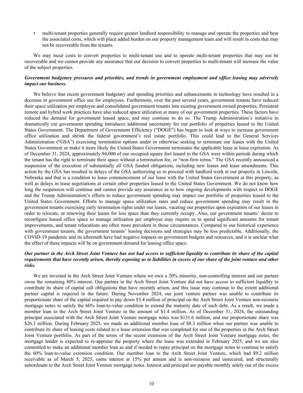 • multi-tenant properties generally require greater landlord responsibility to manage and operate the properties and bear the associated costs, which will place added burden on our property management team and will result in costs that may not be recoverable from the tenants. We may incur costs to convert properties to multi-tenant use and to operate multi-tenant properties that may not be recoverable and we cannot provide any assurance that our decision to convert properties to multi-tenant will increase the value of the subject properties. Government budgetary pressures and priorities, and trends in government employment and office leasing may adversely impact our business. We believe that recent government budgetary and spending priorities and enhancements in technology have resulted in a decrease in government office use for employees. Furthermore, over the past several years, government tenants have reduced their space utilization per employee and consolidated government tenants into existing government owned properties. Persistent remote and hybrid work practices have also reduced space utilization at many of our government properties. These factors have reduced the demand for government leased space, and may continue to do so. The Trump Administration’s initiative to dramatically cut government spending introduces additional uncertainty for our portfolio of properties leased to the United States Government. The Department of Government Efficiency (“DOGE”) has begun to look at ways to increase government office utilization and shrink the federal government’s real estate portfolio. This could lead to the General Services Administration (“GSA”) exercising termination options under or otherwise seeking to terminate our leases with the United States Government or make it more likely the United States Government terminates the applicable lease at lease expiration. As of December 31, 2024, approximately 94,000 of our occupied square feet leased to the GSA were within periods during which the tenant has the right to terminate their space without a termination fee, or “non-firm terms.” The GSA recently announced a suspension of the execution of substantially all GSA funded obligations, including new leases and lease amendments. This action by the GSA has resulted in delays of the GSA authorizing us to proceed with landlord work at our property in Lincoln, Nebraska and that is a condition to lease commencement of our lease with the United States Government at this property, as well as delays in lease negotiations at certain other properties leased to the United States Government. We do not know how long the suspension will continue and cannot provide any assurance as to how ongoing developments with respect to DOGE and the Trump Administration’s efforts to reduce government spending may impact our portfolio of properties leased to the United States Government. Efforts to manage space utilization rates and reduce government spending may result in the government tenants exercising early termination rights under our leases, vacating our properties upon expiration of our leases in order to relocate, or renewing their leases for less space than they currently occupy. Also, our government tenants’ desire to reconfigure leased office space to manage utilization per employee may require us to spend significant amounts for tenant improvements, and tenant relocations are often more prevalent in those circumstances. Compared to our historical experience with government tenants, the government tenants’ leasing decisions and strategies may be less predictable. Additionally, the COVID-19 pandemic and its aftermath have had negative impacts on government budgets and resources, and it is unclear what the effect of these impacts will be on government demand for leasing office space. Our partner in the Arch Street Joint Venture has not had access to sufficient liquidity to contribute its share of the capital requirements that have recently arisen, thereby exposing us to liabilities in excess of our share of the joint venture and other risks. We are invested in the Arch Street Joint Venture where we own a 20% minority, non-controlling interest and our partner owns the remaining 80% interest. Our partner in the Arch Street Joint Venture did not have access to sufficient liquidity to contribute its share of capital call obligations that have recently arisen, and this issue may continue to the extent additional partner capital is required in the future. During November 2024, our joint venture partner was unable to contribute its proportionate share of the capital required to pay down $3.4 million of principal on the Arch Street Joint Venture non-recourse mortgage notes to satisfy the 60% loan-to-value condition to extend the maturity date of such debt. As a result, we made a member loan to the Arch Street Joint Venture in the amount of $1.4 million. As of December 31, 2024, the outstanding principal associated with the Arch Street Joint Venture mortgage notes was $131.6 million, and our proportionate share was $26.3 million. During February 2025, we made an additional member loan of $8.3 million when our partner was unable to contribute its share of leasing costs related to a lease extension that was completed for one of the properties in the Arch Street Joint Venture portfolio. As part of the terms of the recent extension of the Arch Street Joint Venture mortgage notes, the mortgage lender is expected to re-appraise the property where the lease was extended in February 2025, and we are also committed to make an additional member loan as and if needed to repay principal on the mortgage notes to continue to satisfy the 60% loan-to-value extension condition. Our member loan to the Arch Street Joint Venture, which had $9.2 million receivable as of March 5, 2025, earns interest at 15% per annum and is non-recourse and unsecured, and structurally subordinate to the Arch Street Joint Venture mo