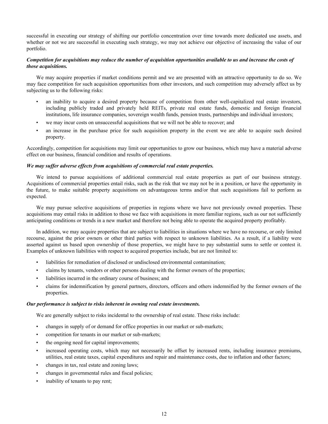 successful in executing our strategy of shifting our portfolio concentration over time towards more dedicated use assets, and whether or not we are successful in executing such strategy, we may not achieve our objective of increasing the value of our portfolio. Competition for acquisitions may reduce the number of acquisition opportunities available to us and increase the costs of those acquisitions. We may acquire properties if market conditions permit and we are presented with an attractive opportunity to do so. We may face competition for such acquisition opportunities from other investors, and such competition may adversely affect us by subjecting us to the following risks: • an inability to acquire a desired property because of competition from other well-capitalized real estate investors, including publicly traded and privately held REITs, private real estate funds, domestic and foreign financial institutions, life insurance companies, sovereign wealth funds, pension trusts, partnerships and individual investors; • we may incur costs on unsuccessful acquisitions that we will not be able to recover; and • an increase in the purchase price for such acquisition property in the event we are able to acquire such desired property. Accordingly, competition for acquisitions may limit our opportunities to grow our business, which may have a material adverse effect on our business, financial condition and results of operations. We may suffer adverse effects from acquisitions of commercial real estate properties. We intend to pursue acquisitions of additional commercial real estate properties as part of our business strategy. Acquisitions of commercial properties entail risks, such as the risk that we may not be in a position, or have the opportunity in the future, to make suitable property acquisitions on advantageous terms and/or that such acquisitions fail to perform as expected. We may pursue selective acquisitions of properties in regions where we have not previously owned properties. These acquisitions may entail risks in addition to those we face with acquisitions in more familiar regions, such as our not sufficiently anticipating conditions or trends in a new market and therefore not being able to operate the acquired property profitably. In addition, we may acquire properties that are subject to liabilities in situations where we have no recourse, or only limited recourse, against the prior owners or other third parties with respect to unknown liabilities. As a result, if a liability were asserted against us based upon ownership of those properties, we might have to pay substantial sums to settle or contest it. Examples of unknown liabilities with respect to acquired properties include, but are not limited to: • liabilities for remediation of disclosed or undisclosed environmental contamination; • claims by tenants, vendors or other persons dealing with the former owners of the properties; • liabilities incurred in the ordinary course of business; and • claims for indemnification by general partners, directors, officers and others indemnified by the former owners of the properties. Our performance is subject to risks inherent in owning real estate investments. We are generally subject to risks incidental to the ownership of real estate. These risks include: • changes in supply of or demand for office properties in our market or sub-markets; • competition for tenants in our market or sub-markets; • the ongoing need for capital improvements; • increased operating costs, which may not necessarily be offset by increased rents, including insurance premiums, utilities, real estate taxes, capital expenditures and repair and maintenance costs, due to inflation and other factors; • changes in tax, real estate and zoning laws; • changes in governmental rules and fiscal policies; • inability of tenants to pay rent; 12