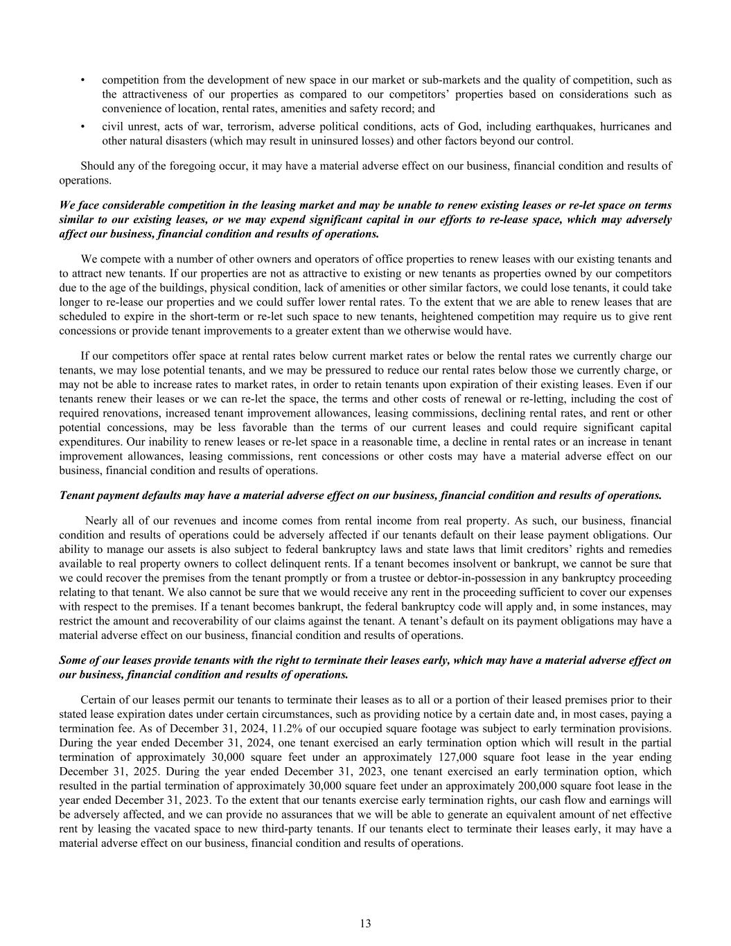 • competition from the development of new space in our market or sub-markets and the quality of competition, such as the attractiveness of our properties as compared to our competitors’ properties based on considerations such as convenience of location, rental rates, amenities and safety record; and • civil unrest, acts of war, terrorism, adverse political conditions, acts of God, including earthquakes, hurricanes and other natural disasters (which may result in uninsured losses) and other factors beyond our control. Should any of the foregoing occur, it may have a material adverse effect on our business, financial condition and results of operations. We face considerable competition in the leasing market and may be unable to renew existing leases or re-let space on terms similar to our existing leases, or we may expend significant capital in our efforts to re-lease space, which may adversely affect our business, financial condition and results of operations. We compete with a number of other owners and operators of office properties to renew leases with our existing tenants and to attract new tenants. If our properties are not as attractive to existing or new tenants as properties owned by our competitors due to the age of the buildings, physical condition, lack of amenities or other similar factors, we could lose tenants, it could take longer to re-lease our properties and we could suffer lower rental rates. To the extent that we are able to renew leases that are scheduled to expire in the short-term or re-let such space to new tenants, heightened competition may require us to give rent concessions or provide tenant improvements to a greater extent than we otherwise would have. If our competitors offer space at rental rates below current market rates or below the rental rates we currently charge our tenants, we may lose potential tenants, and we may be pressured to reduce our rental rates below those we currently charge, or may not be able to increase rates to market rates, in order to retain tenants upon expiration of their existing leases. Even if our tenants renew their leases or we can re-let the space, the terms and other costs of renewal or re-letting, including the cost of required renovations, increased tenant improvement allowances, leasing commissions, declining rental rates, and rent or other potential concessions, may be less favorable than the terms of our current leases and could require significant capital expenditures. Our inability to renew leases or re-let space in a reasonable time, a decline in rental rates or an increase in tenant improvement allowances, leasing commissions, rent concessions or other costs may have a material adverse effect on our business, financial condition and results of operations. Tenant payment defaults may have a material adverse effect on our business, financial condition and results of operations. Nearly all of our revenues and income comes from rental income from real property. As such, our business, financial condition and results of operations could be adversely affected if our tenants default on their lease payment obligations. Our ability to manage our assets is also subject to federal bankruptcy laws and state laws that limit creditors’ rights and remedies available to real property owners to collect delinquent rents. If a tenant becomes insolvent or bankrupt, we cannot be sure that we could recover the premises from the tenant promptly or from a trustee or debtor-in-possession in any bankruptcy proceeding relating to that tenant. We also cannot be sure that we would receive any rent in the proceeding sufficient to cover our expenses with respect to the premises. If a tenant becomes bankrupt, the federal bankruptcy code will apply and, in some instances, may restrict the amount and recoverability of our claims against the tenant. A tenant’s default on its payment obligations may have a material adverse effect on our business, financial condition and results of operations. Some of our leases provide tenants with the right to terminate their leases early, which may have a material adverse effect on our business, financial condition and results of operations. Certain of our leases permit our tenants to terminate their leases as to all or a portion of their leased premises prior to their stated lease expiration dates under certain circumstances, such as providing notice by a certain date and, in most cases, paying a termination fee. As of December 31, 2024, 11.2% of our occupied square footage was subject to early termination provisions. During the year ended December 31, 2024, one tenant exercised an early termination option which will result in the partial termination of approximately 30,000 square feet under an approximately 127,000 square foot lease in the year ending December 31, 2025. During the year ended December 31, 2023, one tenant exercised an early termination option, which resulted in the partial termination of approximately 30,000 square feet under an approximately 200,000 square foot lease in the year ended December 31, 2023. To the extent that our tenants exercise early termination rights, our cash flow and earnings will be adversely affected, and we can provide no assurances that we will be able to generate an equivalent amount of net effective rent by leasing the vacated space to new third-party tenants. If our tenants elect to terminate their leases early, it may have a material adverse effect on our business, financial condition and results of operations. 13
