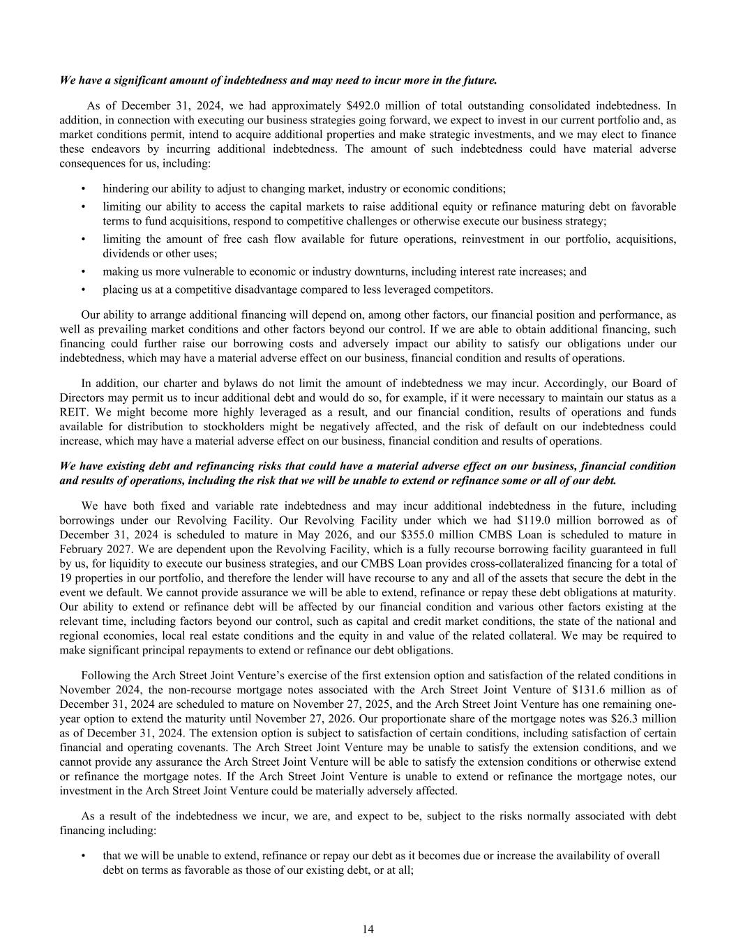 We have a significant amount of indebtedness and may need to incur more in the future. As of December 31, 2024, we had approximately $492.0 million of total outstanding consolidated indebtedness. In addition, in connection with executing our business strategies going forward, we expect to invest in our current portfolio and, as market conditions permit, intend to acquire additional properties and make strategic investments, and we may elect to finance these endeavors by incurring additional indebtedness. The amount of such indebtedness could have material adverse consequences for us, including: • hindering our ability to adjust to changing market, industry or economic conditions; • limiting our ability to access the capital markets to raise additional equity or refinance maturing debt on favorable terms to fund acquisitions, respond to competitive challenges or otherwise execute our business strategy; • limiting the amount of free cash flow available for future operations, reinvestment in our portfolio, acquisitions, dividends or other uses; • making us more vulnerable to economic or industry downturns, including interest rate increases; and • placing us at a competitive disadvantage compared to less leveraged competitors. Our ability to arrange additional financing will depend on, among other factors, our financial position and performance, as well as prevailing market conditions and other factors beyond our control. If we are able to obtain additional financing, such financing could further raise our borrowing costs and adversely impact our ability to satisfy our obligations under our indebtedness, which may have a material adverse effect on our business, financial condition and results of operations. In addition, our charter and bylaws do not limit the amount of indebtedness we may incur. Accordingly, our Board of Directors may permit us to incur additional debt and would do so, for example, if it were necessary to maintain our status as a REIT. We might become more highly leveraged as a result, and our financial condition, results of operations and funds available for distribution to stockholders might be negatively affected, and the risk of default on our indebtedness could increase, which may have a material adverse effect on our business, financial condition and results of operations. We have existing debt and refinancing risks that could have a material adverse effect on our business, financial condition and results of operations, including the risk that we will be unable to extend or refinance some or all of our debt. We have both fixed and variable rate indebtedness and may incur additional indebtedness in the future, including borrowings under our Revolving Facility. Our Revolving Facility under which we had $119.0 million borrowed as of December 31, 2024 is scheduled to mature in May 2026, and our $355.0 million CMBS Loan is scheduled to mature in February 2027. We are dependent upon the Revolving Facility, which is a fully recourse borrowing facility guaranteed in full by us, for liquidity to execute our business strategies, and our CMBS Loan provides cross-collateralized financing for a total of 19 properties in our portfolio, and therefore the lender will have recourse to any and all of the assets that secure the debt in the event we default. We cannot provide assurance we will be able to extend, refinance or repay these debt obligations at maturity. Our ability to extend or refinance debt will be affected by our financial condition and various other factors existing at the relevant time, including factors beyond our control, such as capital and credit market conditions, the state of the national and regional economies, local real estate conditions and the equity in and value of the related collateral. We may be required to make significant principal repayments to extend or refinance our debt obligations. Following the Arch Street Joint Venture’s exercise of the first extension option and satisfaction of the related conditions in November 2024, the non-recourse mortgage notes associated with the Arch Street Joint Venture of $131.6 million as of December 31, 2024 are scheduled to mature on November 27, 2025, and the Arch Street Joint Venture has one remaining one- year option to extend the maturity until November 27, 2026. Our proportionate share of the mortgage notes was $26.3 million as of December 31, 2024. The extension option is subject to satisfaction of certain conditions, including satisfaction of certain financial and operating covenants. The Arch Street Joint Venture may be unable to satisfy the extension conditions, and we cannot provide any assurance the Arch Street Joint Venture will be able to satisfy the extension conditions or otherwise extend or refinance the mortgage notes. If the Arch Street Joint Venture is unable to extend or refinance the mortgage notes, our investment in the Arch Street Joint Venture could be materially adversely affected. As a result of the indebtedness we incur, we are, and expect to be, subject to the risks normally associated with debt financing including: • that we will be unable to extend, refinance or repay our debt as it becomes due or increase the availability of overall debt on terms as favorable as those of our existing debt, or at all; 14
