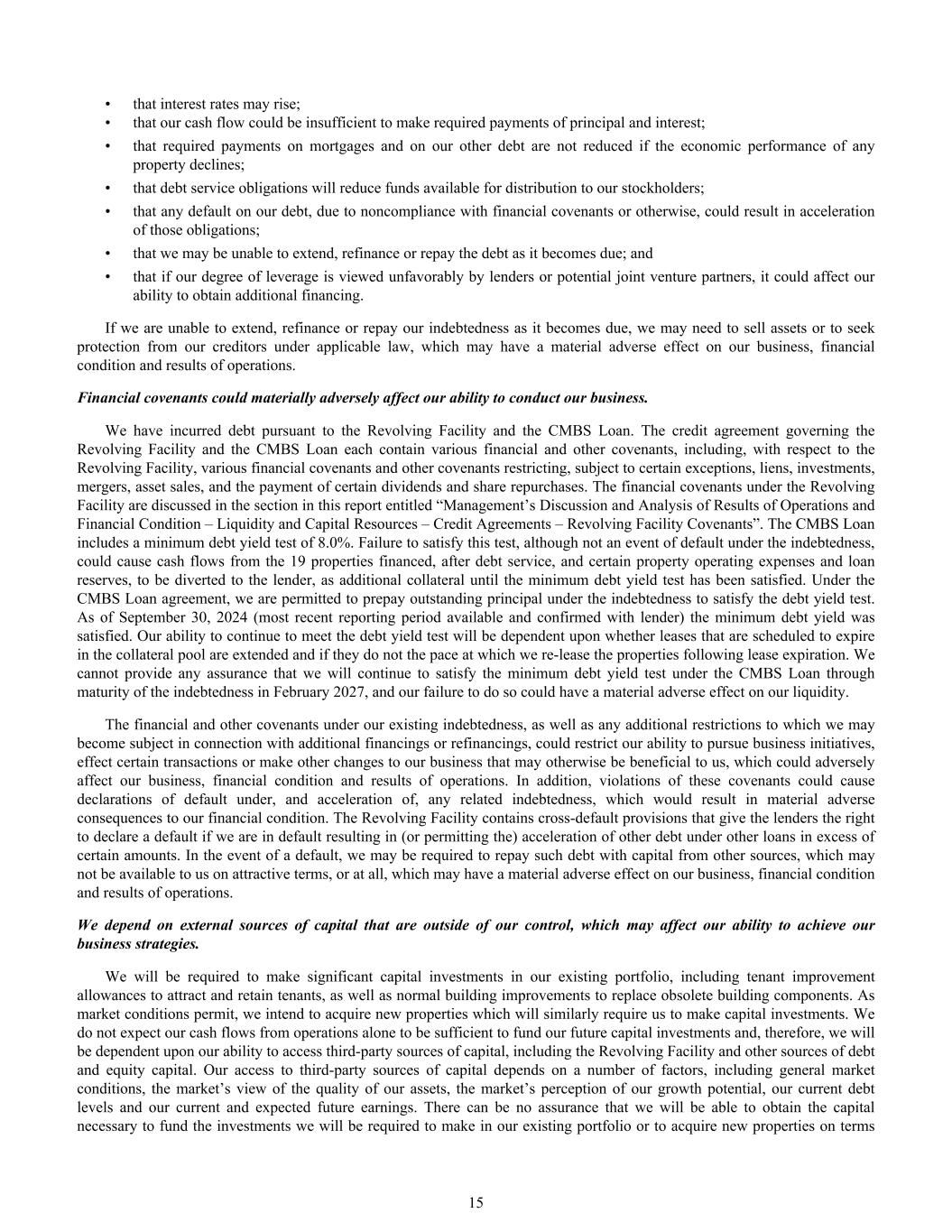 • that interest rates may rise; • that our cash flow could be insufficient to make required payments of principal and interest; • that required payments on mortgages and on our other debt are not reduced if the economic performance of any property declines; • that debt service obligations will reduce funds available for distribution to our stockholders; • that any default on our debt, due to noncompliance with financial covenants or otherwise, could result in acceleration of those obligations; • that we may be unable to extend, refinance or repay the debt as it becomes due; and • that if our degree of leverage is viewed unfavorably by lenders or potential joint venture partners, it could affect our ability to obtain additional financing. If we are unable to extend, refinance or repay our indebtedness as it becomes due, we may need to sell assets or to seek protection from our creditors under applicable law, which may have a material adverse effect on our business, financial condition and results of operations. Financial covenants could materially adversely affect our ability to conduct our business. We have incurred debt pursuant to the Revolving Facility and the CMBS Loan. The credit agreement governing the Revolving Facility and the CMBS Loan each contain various financial and other covenants, including, with respect to the Revolving Facility, various financial covenants and other covenants restricting, subject to certain exceptions, liens, investments, mergers, asset sales, and the payment of certain dividends and share repurchases. The financial covenants under the Revolving Facility are discussed in the section in this report entitled “Management’s Discussion and Analysis of Results of Operations and Financial Condition – Liquidity and Capital Resources – Credit Agreements – Revolving Facility Covenants”. The CMBS Loan includes a minimum debt yield test of 8.0%. Failure to satisfy this test, although not an event of default under the indebtedness, could cause cash flows from the 19 properties financed, after debt service, and certain property operating expenses and loan reserves, to be diverted to the lender, as additional collateral until the minimum debt yield test has been satisfied. Under the CMBS Loan agreement, we are permitted to prepay outstanding principal under the indebtedness to satisfy the debt yield test. As of September 30, 2024 (most recent reporting period available and confirmed with lender) the minimum debt yield was satisfied. Our ability to continue to meet the debt yield test will be dependent upon whether leases that are scheduled to expire in the collateral pool are extended and if they do not the pace at which we re-lease the properties following lease expiration. We cannot provide any assurance that we will continue to satisfy the minimum debt yield test under the CMBS Loan through maturity of the indebtedness in February 2027, and our failure to do so could have a material adverse effect on our liquidity. The financial and other covenants under our existing indebtedness, as well as any additional restrictions to which we may become subject in connection with additional financings or refinancings, could restrict our ability to pursue business initiatives, effect certain transactions or make other changes to our business that may otherwise be beneficial to us, which could adversely affect our business, financial condition and results of operations. In addition, violations of these covenants could cause declarations of default under, and acceleration of, any related indebtedness, which would result in material adverse consequences to our financial condition. The Revolving Facility contains cross-default provisions that give the lenders the right to declare a default if we are in default resulting in (or permitting the) acceleration of other debt under other loans in excess of certain amounts. In the event of a default, we may be required to repay such debt with capital from other sources, which may not be available to us on attractive terms, or at all, which may have a material adverse effect on our business, financial condition and results of operations. We depend on external sources of capital that are outside of our control, which may affect our ability to achieve our business strategies. We will be required to make significant capital investments in our existing portfolio, including tenant improvement allowances to attract and retain tenants, as well as normal building improvements to replace obsolete building components. As market conditions permit, we intend to acquire new properties which will similarly require us to make capital investments. We do not expect our cash flows from operations alone to be sufficient to fund our future capital investments and, therefore, we will be dependent upon our ability to access third-party sources of capital, including the Revolving Facility and other sources of debt and equity capital. Our access to third-party sources of capital depends on a number of factors, including general market conditions, the market’s view of the quality of our assets, the market’s perception of our growth potential, our current debt levels and our current and expected future earnings. There can be no assurance that we will be able to obtain the capital necessary to fund the investments we will be required to make in our existing portfolio or to acquire new properties on terms 15