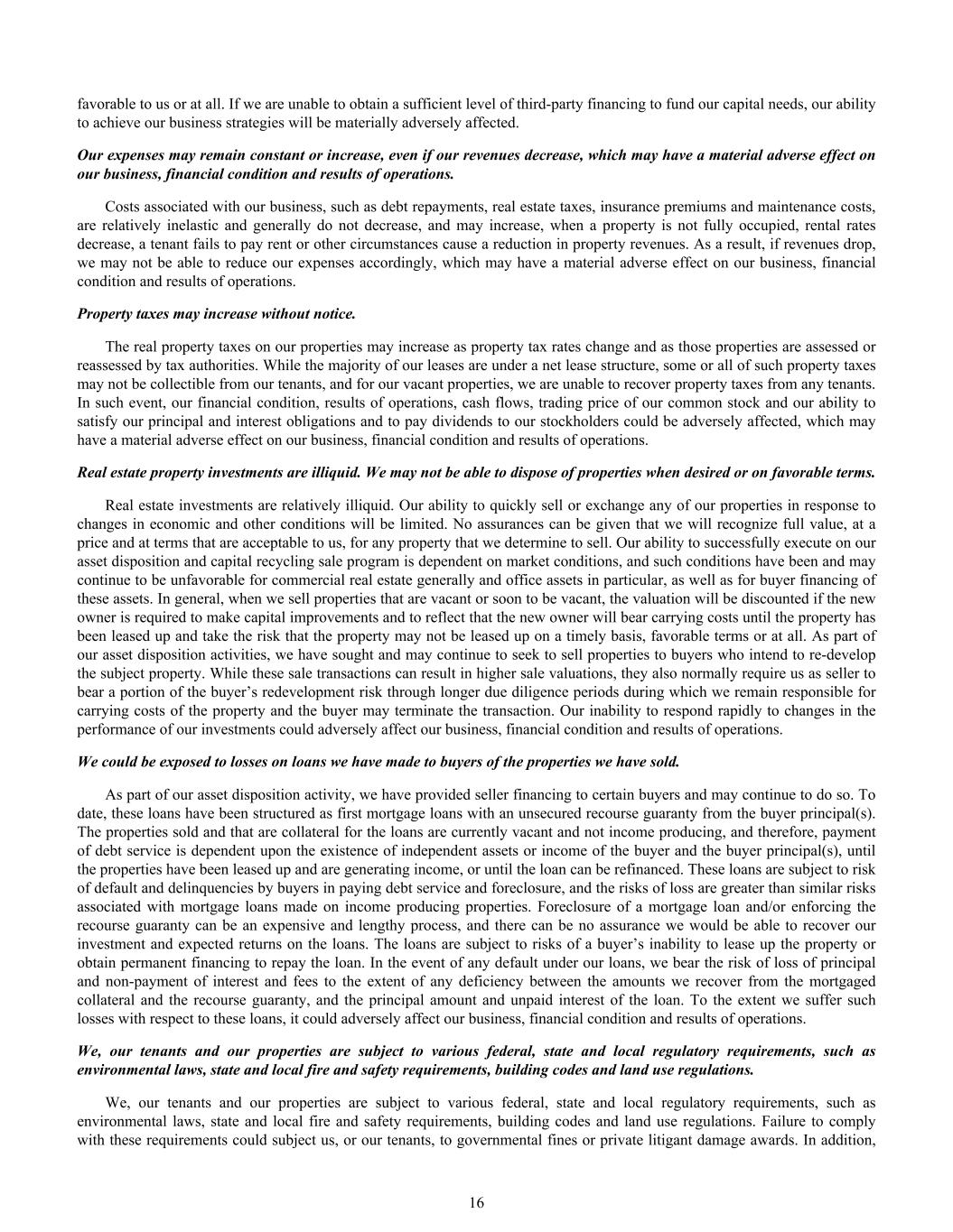 favorable to us or at all. If we are unable to obtain a sufficient level of third-party financing to fund our capital needs, our ability to achieve our business strategies will be materially adversely affected. Our expenses may remain constant or increase, even if our revenues decrease, which may have a material adverse effect on our business, financial condition and results of operations. Costs associated with our business, such as debt repayments, real estate taxes, insurance premiums and maintenance costs, are relatively inelastic and generally do not decrease, and may increase, when a property is not fully occupied, rental rates decrease, a tenant fails to pay rent or other circumstances cause a reduction in property revenues. As a result, if revenues drop, we may not be able to reduce our expenses accordingly, which may have a material adverse effect on our business, financial condition and results of operations. Property taxes may increase without notice. The real property taxes on our properties may increase as property tax rates change and as those properties are assessed or reassessed by tax authorities. While the majority of our leases are under a net lease structure, some or all of such property taxes may not be collectible from our tenants, and for our vacant properties, we are unable to recover property taxes from any tenants. In such event, our financial condition, results of operations, cash flows, trading price of our common stock and our ability to satisfy our principal and interest obligations and to pay dividends to our stockholders could be adversely affected, which may have a material adverse effect on our business, financial condition and results of operations. Real estate property investments are illiquid. We may not be able to dispose of properties when desired or on favorable terms. Real estate investments are relatively illiquid. Our ability to quickly sell or exchange any of our properties in response to changes in economic and other conditions will be limited. No assurances can be given that we will recognize full value, at a price and at terms that are acceptable to us, for any property that we determine to sell. Our ability to successfully execute on our asset disposition and capital recycling sale program is dependent on market conditions, and such conditions have been and may continue to be unfavorable for commercial real estate generally and office assets in particular, as well as for buyer financing of these assets. In general, when we sell properties that are vacant or soon to be vacant, the valuation will be discounted if the new owner is required to make capital improvements and to reflect that the new owner will bear carrying costs until the property has been leased up and take the risk that the property may not be leased up on a timely basis, favorable terms or at all. As part of our asset disposition activities, we have sought and may continue to seek to sell properties to buyers who intend to re-develop the subject property. While these sale transactions can result in higher sale valuations, they also normally require us as seller to bear a portion of the buyer’s redevelopment risk through longer due diligence periods during which we remain responsible for carrying costs of the property and the buyer may terminate the transaction. Our inability to respond rapidly to changes in the performance of our investments could adversely affect our business, financial condition and results of operations. We could be exposed to losses on loans we have made to buyers of the properties we have sold. As part of our asset disposition activity, we have provided seller financing to certain buyers and may continue to do so. To date, these loans have been structured as first mortgage loans with an unsecured recourse guaranty from the buyer principal(s). The properties sold and that are collateral for the loans are currently vacant and not income producing, and therefore, payment of debt service is dependent upon the existence of independent assets or income of the buyer and the buyer principal(s), until the properties have been leased up and are generating income, or until the loan can be refinanced. These loans are subject to risk of default and delinquencies by buyers in paying debt service and foreclosure, and the risks of loss are greater than similar risks associated with mortgage loans made on income producing properties. Foreclosure of a mortgage loan and/or enforcing the recourse guaranty can be an expensive and lengthy process, and there can be no assurance we would be able to recover our investment and expected returns on the loans. The loans are subject to risks of a buyer’s inability to lease up the property or obtain permanent financing to repay the loan. In the event of any default under our loans, we bear the risk of loss of principal and non-payment of interest and fees to the extent of any deficiency between the amounts we recover from the mortgaged collateral and the recourse guaranty, and the principal amount and unpaid interest of the loan. To the extent we suffer such losses with respect to these loans, it could adversely affect our business, financial condition and results of operations. We, our tenants and our properties are subject to various federal, state and local regulatory requirements, such as environmental laws, state and local fire and safety requirements, building codes and land use regulations. We, our tenants and our properties are subject to various federal, state and local regulatory requirements, such as environmental laws, state and local fire and safety requirements, building codes and land use regulations. Failure to comply with these requirements could subject us, or our tenants, to governmental fines or private litigant damage awards. In addition, 16