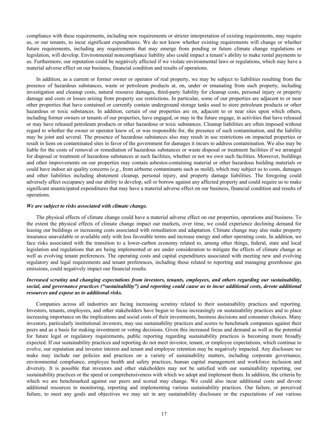 compliance with these requirements, including new requirements or stricter interpretation of existing requirements, may require us, or our tenants, to incur significant expenditures. We do not know whether existing requirements will change or whether future requirements, including any requirements that may emerge from pending or future climate change regulations or legislation, will develop. Environmental noncompliance liability also could impact a tenant’s ability to make rental payments to us. Furthermore, our reputation could be negatively affected if we violate environmental laws or regulations, which may have a material adverse effect on our business, financial condition and results of operations. In addition, as a current or former owner or operator of real property, we may be subject to liabilities resulting from the presence of hazardous substances, waste or petroleum products at, on, under or emanating from such property, including investigation and cleanup costs, natural resource damages, third-party liability for cleanup costs, personal injury or property damage and costs or losses arising from property use restrictions. In particular, some of our properties are adjacent to or near other properties that have contained or currently contain underground storage tanks used to store petroleum products or other hazardous or toxic substances. In addition, certain of our properties are on, adjacent to or near sites upon which others, including former owners or tenants of our properties, have engaged, or may in the future engage, in activities that have released or may have released petroleum products or other hazardous or toxic substances. Cleanup liabilities are often imposed without regard to whether the owner or operator knew of, or was responsible for, the presence of such contamination, and the liability may be joint and several. The presence of hazardous substances also may result in use restrictions on impacted properties or result in liens on contaminated sites in favor of the government for damages it incurs to address contamination. We also may be liable for the costs of removal or remediation of hazardous substances or waste disposal or treatment facilities if we arranged for disposal or treatment of hazardous substances at such facilities, whether or not we own such facilities. Moreover, buildings and other improvements on our properties may contain asbestos-containing material or other hazardous building materials or could have indoor air quality concerns (e.g., from airborne contaminants such as mold), which may subject us to costs, damages and other liabilities including abatement cleanup, personal injury, and property damage liabilities. The foregoing could adversely affect occupancy and our ability to develop, sell or borrow against any affected property and could require us to make significant unanticipated expenditures that may have a material adverse effect on our business, financial condition and results of operations. We are subject to risks associated with climate change. The physical effects of climate change could have a material adverse effect on our properties, operations and business. To the extent the physical effects of climate change impact our markets, over time, we could experience declining demand for leasing our buildings or increasing costs associated with remediation and adaptation. Climate change may also make property insurance unavailable or available only with less favorable terms and increase energy and other operating costs. In addition, we face risks associated with the transition to a lower-carbon economy related to, among other things, federal, state and local legislation and regulations that are being implemented or are under consideration to mitigate the effects of climate change as well as evolving tenant preferences. The operating costs and capital expenditures associated with meeting new and evolving regulatory and legal requirements and tenant preferences, including those related to reporting and managing greenhouse gas emissions, could negatively impact our financial results. Increased scrutiny and changing expectations from investors, tenants, employees, and others regarding our sustainability, social, and governance practices (“sustainability”) and reporting could cause us to incur additional costs, devote additional resources and expose us to additional risks. Companies across all industries are facing increasing scrutiny related to their sustainability practices and reporting. Investors, tenants, employees, and other stakeholders have begun to focus increasingly on sustainability practices and to place increasing importance on the implications and social costs of their investments, business decisions and consumer choices. Many investors, particularly institutional investors, may use sustainability practices and scores to benchmark companies against their peers and as a basis for making investment or voting decisions. Given this increased focus and demand as well as the potential for future legal or regulatory requirements, public reporting regarding sustainability practices is becoming more broadly expected. If our sustainability practices and reporting do not meet investor, tenant, or employee expectations, which continue to evolve, our reputation and investor interest and tenant and employee retention may be negatively impacted. Any disclosure we make may include our policies and practices on a variety of sustainability matters, including corporate governance, environmental compliance, employee health and safety practices, human capital management and workforce inclusion and diversity. It is possible that investors and other stakeholders may not be satisfied with our sustainability reporting, our sustainability practices or the speed or comprehensiveness with which we adopt and implement them. In addition, the criteria by which we are benchmarked against our peers and scored may change. We could also incur additional cos
