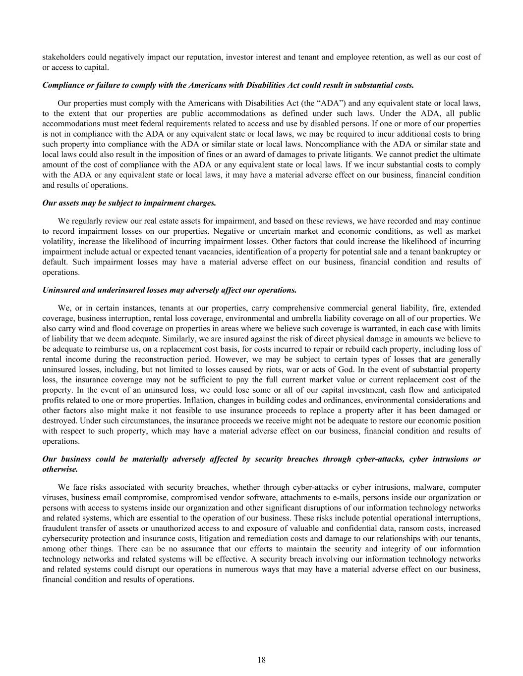 stakeholders could negatively impact our reputation, investor interest and tenant and employee retention, as well as our cost of or access to capital. Compliance or failure to comply with the Americans with Disabilities Act could result in substantial costs. Our properties must comply with the Americans with Disabilities Act (the “ADA”) and any equivalent state or local laws, to the extent that our properties are public accommodations as defined under such laws. Under the ADA, all public accommodations must meet federal requirements related to access and use by disabled persons. If one or more of our properties is not in compliance with the ADA or any equivalent state or local laws, we may be required to incur additional costs to bring such property into compliance with the ADA or similar state or local laws. Noncompliance with the ADA or similar state and local laws could also result in the imposition of fines or an award of damages to private litigants. We cannot predict the ultimate amount of the cost of compliance with the ADA or any equivalent state or local laws. If we incur substantial costs to comply with the ADA or any equivalent state or local laws, it may have a material adverse effect on our business, financial condition and results of operations. Our assets may be subject to impairment charges. We regularly review our real estate assets for impairment, and based on these reviews, we have recorded and may continue to record impairment losses on our properties. Negative or uncertain market and economic conditions, as well as market volatility, increase the likelihood of incurring impairment losses. Other factors that could increase the likelihood of incurring impairment include actual or expected tenant vacancies, identification of a property for potential sale and a tenant bankruptcy or default. Such impairment losses may have a material adverse effect on our business, financial condition and results of operations. Uninsured and underinsured losses may adversely affect our operations. We, or in certain instances, tenants at our properties, carry comprehensive commercial general liability, fire, extended coverage, business interruption, rental loss coverage, environmental and umbrella liability coverage on all of our properties. We also carry wind and flood coverage on properties in areas where we believe such coverage is warranted, in each case with limits of liability that we deem adequate. Similarly, we are insured against the risk of direct physical damage in amounts we believe to be adequate to reimburse us, on a replacement cost basis, for costs incurred to repair or rebuild each property, including loss of rental income during the reconstruction period. However, we may be subject to certain types of losses that are generally uninsured losses, including, but not limited to losses caused by riots, war or acts of God. In the event of substantial property loss, the insurance coverage may not be sufficient to pay the full current market value or current replacement cost of the property. In the event of an uninsured loss, we could lose some or all of our capital investment, cash flow and anticipated profits related to one or more properties. Inflation, changes in building codes and ordinances, environmental considerations and other factors also might make it not feasible to use insurance proceeds to replace a property after it has been damaged or destroyed. Under such circumstances, the insurance proceeds we receive might not be adequate to restore our economic position with respect to such property, which may have a material adverse effect on our business, financial condition and results of operations. Our business could be materially adversely affected by security breaches through cyber-attacks, cyber intrusions or otherwise. We face risks associated with security breaches, whether through cyber-attacks or cyber intrusions, malware, computer viruses, business email compromise, compromised vendor software, attachments to e-mails, persons inside our organization or persons with access to systems inside our organization and other significant disruptions of our information technology networks and related systems, which are essential to the operation of our business. These risks include potential operational interruptions, fraudulent transfer of assets or unauthorized access to and exposure of valuable and confidential data, ransom costs, increased cybersecurity protection and insurance costs, litigation and remediation costs and damage to our relationships with our tenants, among other things. There can be no assurance that our efforts to maintain the security and integrity of our information technology networks and related systems will be effective. A security breach involving our information technology networks and related systems could disrupt our operations in numerous ways that may have a material adverse effect on our business, financial condition and results of operations. 18