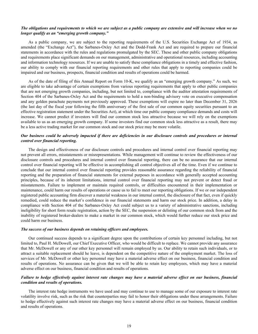 The obligations and requirements to which we are subject as a public company are extensive and will increase when we no longer qualify as an “emerging growth company.” As a public company, we are subject to the reporting requirements of the U.S. Securities Exchange Act of 1934, as amended (the “Exchange Act”), the Sarbanes-Oxley Act and the Dodd-Frank Act and are required to prepare our financial statements in accordance with the rules and regulations promulgated by the SEC. These and other public company obligations and requirements place significant demands on our management, administrative and operational resources, including accounting and information technology resources. If we are unable to satisfy these compliance obligations in a timely and effective fashion, our ability to comply with our financial reporting requirements and other rules that apply to reporting companies could be impaired and our business, prospects, financial condition and results of operations could be harmed. As of the date of filing of this Annual Report on Form 10-K, we qualify as an “emerging growth company.” As such, we are eligible to take advantage of certain exemptions from various reporting requirements that apply to other public companies that are not emerging growth companies, including, but not limited to, compliance with the auditor attestation requirements of Section 404 of the Sarbanes-Oxley Act and the requirements to hold a non-binding advisory vote on executive compensation and any golden parachute payments not previously approved. These exemptions will expire no later than December 31, 2026 (the last day of the fiscal year following the fifth anniversary of the first sale of our common equity securities pursuant to an effective registration statement under the Securities Act), at which time our public company compliance demands and costs will increase. We cannot predict if investors will find our common stock less attractive because we will rely on the exemptions available to us as an emerging growth company. If some investors find our common stock less attractive as a result, there may be a less active trading market for our common stock and our stock price may be more volatile. Our business could be adversely impacted if there are deficiencies in our disclosure controls and procedures or internal control over financial reporting. The design and effectiveness of our disclosure controls and procedures and internal control over financial reporting may not prevent all errors, misstatements or misrepresentations. While management will continue to review the effectiveness of our disclosure controls and procedures and internal control over financial reporting, there can be no assurance that our internal control over financial reporting will be effective in accomplishing all control objectives all of the time. Even if we continue to conclude that our internal control over financial reporting provides reasonable assurance regarding the reliability of financial reporting and the preparation of financial statements for external purposes in accordance with generally accepted accounting principles, because of its inherent limitations, internal control over financial reporting may not prevent or detect fraud or misstatements. Failure to implement or maintain required controls, or difficulties encountered in their implementation or maintenance, could harm our results of operations or cause us to fail to meet our reporting obligations. If we or our independent registered public accounting firm discover a material weakness in our internal control, the disclosure of that fact, even if quickly remedied, could reduce the market’s confidence in our financial statements and harm our stock price. In addition, a delay in compliance with Section 404 of the Sarbanes-Oxley Act could subject us to a variety of administrative sanctions, including ineligibility for short form resale registration, action by the SEC, the suspension or delisting of our common stock from and the inability of registered broker-dealers to make a market in our common stock, which would further reduce our stock price and could harm our business. The success of our business depends on retaining officers and employees. Our continued success depends to a significant degree upon the contributions of certain key personnel including, but not limited to, Paul H. McDowell, our Chief Executive Officer, who would be difficult to replace. We cannot provide any assurance that Mr. McDowell or any of our other key personnel will remain employed by us. Our ability to retain such individuals, or to attract a suitable replacement should he leave, is dependent on the competitive nature of the employment market. The loss of services of Mr. McDowell or other key personnel may have a material adverse effect on our business, financial condition and results of operations. No assurance can be given that we will be able to retain key employees, which may have a material adverse effect on our business, financial condition and results of operations. Failure to hedge effectively against interest rate changes may have a material adverse effect on our business, financial condition and results of operations. The interest rate hedge instruments we have used and may continue to use to manage some of our exposure to interest rate volatility involve risk, such as the risk that counterparties may fail to honor their obligations under these arrangements. Failure to hedge effectively against such interest rate changes may have a material adverse effect on our business, financial condition and results of operations. 19