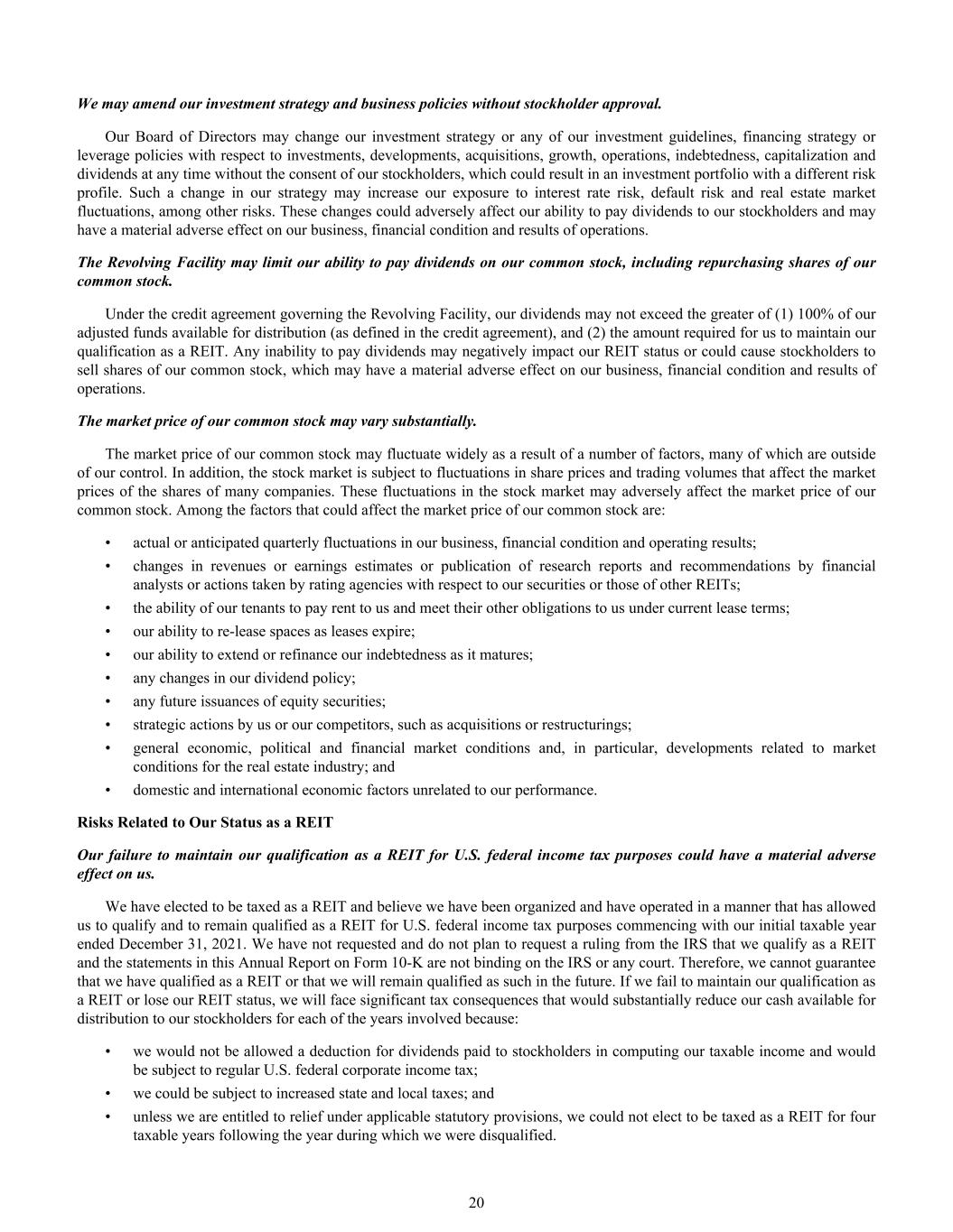 We may amend our investment strategy and business policies without stockholder approval. Our Board of Directors may change our investment strategy or any of our investment guidelines, financing strategy or leverage policies with respect to investments, developments, acquisitions, growth, operations, indebtedness, capitalization and dividends at any time without the consent of our stockholders, which could result in an investment portfolio with a different risk profile. Such a change in our strategy may increase our exposure to interest rate risk, default risk and real estate market fluctuations, among other risks. These changes could adversely affect our ability to pay dividends to our stockholders and may have a material adverse effect on our business, financial condition and results of operations. The Revolving Facility may limit our ability to pay dividends on our common stock, including repurchasing shares of our common stock. Under the credit agreement governing the Revolving Facility, our dividends may not exceed the greater of (1) 100% of our adjusted funds available for distribution (as defined in the credit agreement), and (2) the amount required for us to maintain our qualification as a REIT. Any inability to pay dividends may negatively impact our REIT status or could cause stockholders to sell shares of our common stock, which may have a material adverse effect on our business, financial condition and results of operations. The market price of our common stock may vary substantially. The market price of our common stock may fluctuate widely as a result of a number of factors, many of which are outside of our control. In addition, the stock market is subject to fluctuations in share prices and trading volumes that affect the market prices of the shares of many companies. These fluctuations in the stock market may adversely affect the market price of our common stock. Among the factors that could affect the market price of our common stock are: • actual or anticipated quarterly fluctuations in our business, financial condition and operating results; • changes in revenues or earnings estimates or publication of research reports and recommendations by financial analysts or actions taken by rating agencies with respect to our securities or those of other REITs; • the ability of our tenants to pay rent to us and meet their other obligations to us under current lease terms; • our ability to re-lease spaces as leases expire; • our ability to extend or refinance our indebtedness as it matures; • any changes in our dividend policy; • any future issuances of equity securities; • strategic actions by us or our competitors, such as acquisitions or restructurings; • general economic, political and financial market conditions and, in particular, developments related to market conditions for the real estate industry; and • domestic and international economic factors unrelated to our performance. Risks Related to Our Status as a REIT Our failure to maintain our qualification as a REIT for U.S. federal income tax purposes could have a material adverse effect on us. We have elected to be taxed as a REIT and believe we have been organized and have operated in a manner that has allowed us to qualify and to remain qualified as a REIT for U.S. federal income tax purposes commencing with our initial taxable year ended December 31, 2021. We have not requested and do not plan to request a ruling from the IRS that we qualify as a REIT and the statements in this Annual Report on Form 10-K are not binding on the IRS or any court. Therefore, we cannot guarantee that we have qualified as a REIT or that we will remain qualified as such in the future. If we fail to maintain our qualification as a REIT or lose our REIT status, we will face significant tax consequences that would substantially reduce our cash available for distribution to our stockholders for each of the years involved because: • we would not be allowed a deduction for dividends paid to stockholders in computing our taxable income and would be subject to regular U.S. federal corporate income tax; • we could be subject to increased state and local taxes; and • unless we are entitled to relief under applicable statutory provisions, we could not elect to be taxed as a REIT for four taxable years following the year during which we were disqualified. 20