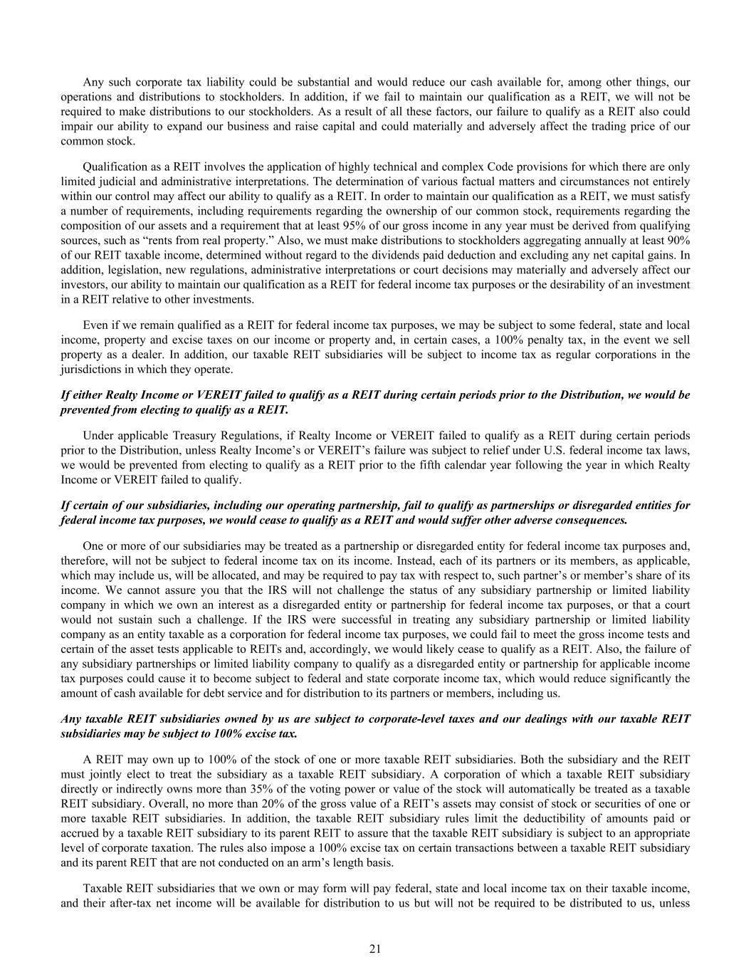 Any such corporate tax liability could be substantial and would reduce our cash available for, among other things, our operations and distributions to stockholders. In addition, if we fail to maintain our qualification as a REIT, we will not be required to make distributions to our stockholders. As a result of all these factors, our failure to qualify as a REIT also could impair our ability to expand our business and raise capital and could materially and adversely affect the trading price of our common stock. Qualification as a REIT involves the application of highly technical and complex Code provisions for which there are only limited judicial and administrative interpretations. The determination of various factual matters and circumstances not entirely within our control may affect our ability to qualify as a REIT. In order to maintain our qualification as a REIT, we must satisfy a number of requirements, including requirements regarding the ownership of our common stock, requirements regarding the composition of our assets and a requirement that at least 95% of our gross income in any year must be derived from qualifying sources, such as “rents from real property.” Also, we must make distributions to stockholders aggregating annually at least 90% of our REIT taxable income, determined without regard to the dividends paid deduction and excluding any net capital gains. In addition, legislation, new regulations, administrative interpretations or court decisions may materially and adversely affect our investors, our ability to maintain our qualification as a REIT for federal income tax purposes or the desirability of an investment in a REIT relative to other investments. Even if we remain qualified as a REIT for federal income tax purposes, we may be subject to some federal, state and local income, property and excise taxes on our income or property and, in certain cases, a 100% penalty tax, in the event we sell property as a dealer. In addition, our taxable REIT subsidiaries will be subject to income tax as regular corporations in the jurisdictions in which they operate. If either Realty Income or VEREIT failed to qualify as a REIT during certain periods prior to the Distribution, we would be prevented from electing to qualify as a REIT. Under applicable Treasury Regulations, if Realty Income or VEREIT failed to qualify as a REIT during certain periods prior to the Distribution, unless Realty Income’s or VEREIT’s failure was subject to relief under U.S. federal income tax laws, we would be prevented from electing to qualify as a REIT prior to the fifth calendar year following the year in which Realty Income or VEREIT failed to qualify. If certain of our subsidiaries, including our operating partnership, fail to qualify as partnerships or disregarded entities for federal income tax purposes, we would cease to qualify as a REIT and would suffer other adverse consequences. One or more of our subsidiaries may be treated as a partnership or disregarded entity for federal income tax purposes and, therefore, will not be subject to federal income tax on its income. Instead, each of its partners or its members, as applicable, which may include us, will be allocated, and may be required to pay tax with respect to, such partner’s or member’s share of its income. We cannot assure you that the IRS will not challenge the status of any subsidiary partnership or limited liability company in which we own an interest as a disregarded entity or partnership for federal income tax purposes, or that a court would not sustain such a challenge. If the IRS were successful in treating any subsidiary partnership or limited liability company as an entity taxable as a corporation for federal income tax purposes, we could fail to meet the gross income tests and certain of the asset tests applicable to REITs and, accordingly, we would likely cease to qualify as a REIT. Also, the failure of any subsidiary partnerships or limited liability company to qualify as a disregarded entity or partnership for applicable income tax purposes could cause it to become subject to federal and state corporate income tax, which would reduce significantly the amount of cash available for debt service and for distribution to its partners or members, including us. Any taxable REIT subsidiaries owned by us are subject to corporate-level taxes and our dealings with our taxable REIT subsidiaries may be subject to 100% excise tax. A REIT may own up to 100% of the stock of one or more taxable REIT subsidiaries. Both the subsidiary and the REIT must jointly elect to treat the subsidiary as a taxable REIT subsidiary. A corporation of which a taxable REIT subsidiary directly or indirectly owns more than 35% of the voting power or value of the stock will automatically be treated as a taxable REIT subsidiary. Overall, no more than 20% of the gross value of a REIT’s assets may consist of stock or securities of one or more taxable REIT subsidiaries. In addition, the taxable REIT subsidiary rules limit the deductibility of amounts paid or accrued by a taxable REIT subsidiary to its parent REIT to assure that the taxable REIT subsidiary is subject to an appropriate level of corporate taxation. The rules also impose a 100% excise tax on certain transactions between a taxable REIT subsidiary and its parent REIT that are not conducted on an arm’s length basis. Taxable REIT subsidiaries that we own or may form will pay federal, state and local income tax on their taxable income, and their after-tax net income will be available for distribution to us but will not be required to be distributed to us, unless 21