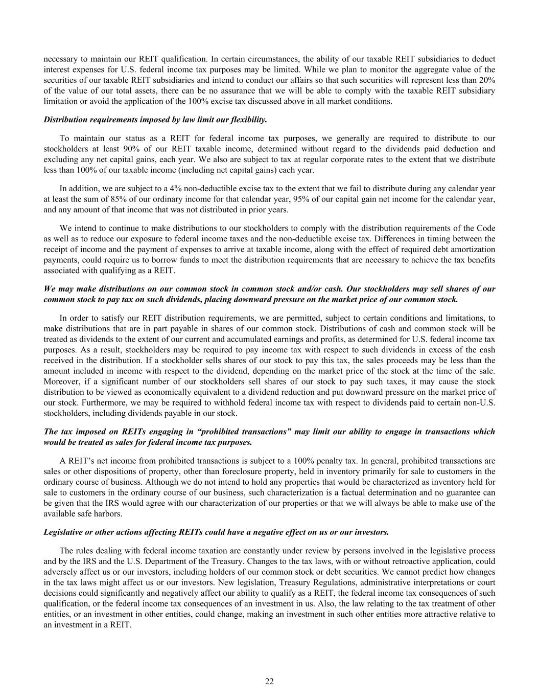 necessary to maintain our REIT qualification. In certain circumstances, the ability of our taxable REIT subsidiaries to deduct interest expenses for U.S. federal income tax purposes may be limited. While we plan to monitor the aggregate value of the securities of our taxable REIT subsidiaries and intend to conduct our affairs so that such securities will represent less than 20% of the value of our total assets, there can be no assurance that we will be able to comply with the taxable REIT subsidiary limitation or avoid the application of the 100% excise tax discussed above in all market conditions. Distribution requirements imposed by law limit our flexibility. To maintain our status as a REIT for federal income tax purposes, we generally are required to distribute to our stockholders at least 90% of our REIT taxable income, determined without regard to the dividends paid deduction and excluding any net capital gains, each year. We also are subject to tax at regular corporate rates to the extent that we distribute less than 100% of our taxable income (including net capital gains) each year. In addition, we are subject to a 4% non-deductible excise tax to the extent that we fail to distribute during any calendar year at least the sum of 85% of our ordinary income for that calendar year, 95% of our capital gain net income for the calendar year, and any amount of that income that was not distributed in prior years. We intend to continue to make distributions to our stockholders to comply with the distribution requirements of the Code as well as to reduce our exposure to federal income taxes and the non-deductible excise tax. Differences in timing between the receipt of income and the payment of expenses to arrive at taxable income, along with the effect of required debt amortization payments, could require us to borrow funds to meet the distribution requirements that are necessary to achieve the tax benefits associated with qualifying as a REIT. We may make distributions on our common stock in common stock and/or cash. Our stockholders may sell shares of our common stock to pay tax on such dividends, placing downward pressure on the market price of our common stock. In order to satisfy our REIT distribution requirements, we are permitted, subject to certain conditions and limitations, to make distributions that are in part payable in shares of our common stock. Distributions of cash and common stock will be treated as dividends to the extent of our current and accumulated earnings and profits, as determined for U.S. federal income tax purposes. As a result, stockholders may be required to pay income tax with respect to such dividends in excess of the cash received in the distribution. If a stockholder sells shares of our stock to pay this tax, the sales proceeds may be less than the amount included in income with respect to the dividend, depending on the market price of the stock at the time of the sale. Moreover, if a significant number of our stockholders sell shares of our stock to pay such taxes, it may cause the stock distribution to be viewed as economically equivalent to a dividend reduction and put downward pressure on the market price of our stock. Furthermore, we may be required to withhold federal income tax with respect to dividends paid to certain non-U.S. stockholders, including dividends payable in our stock. The tax imposed on REITs engaging in “prohibited transactions” may limit our ability to engage in transactions which would be treated as sales for federal income tax purposes. A REIT’s net income from prohibited transactions is subject to a 100% penalty tax. In general, prohibited transactions are sales or other dispositions of property, other than foreclosure property, held in inventory primarily for sale to customers in the ordinary course of business. Although we do not intend to hold any properties that would be characterized as inventory held for sale to customers in the ordinary course of our business, such characterization is a factual determination and no guarantee can be given that the IRS would agree with our characterization of our properties or that we will always be able to make use of the available safe harbors. Legislative or other actions affecting REITs could have a negative effect on us or our investors. The rules dealing with federal income taxation are constantly under review by persons involved in the legislative process and by the IRS and the U.S. Department of the Treasury. Changes to the tax laws, with or without retroactive application, could adversely affect us or our investors, including holders of our common stock or debt securities. We cannot predict how changes in the tax laws might affect us or our investors. New legislation, Treasury Regulations, administrative interpretations or court decisions could significantly and negatively affect our ability to qualify as a REIT, the federal income tax consequences of such qualification, or the federal income tax consequences of an investment in us. Also, the law relating to the tax treatment of other entities, or an investment in other entities, could change, making an investment in such other entities more attractive relative to an investment in a REIT. 22