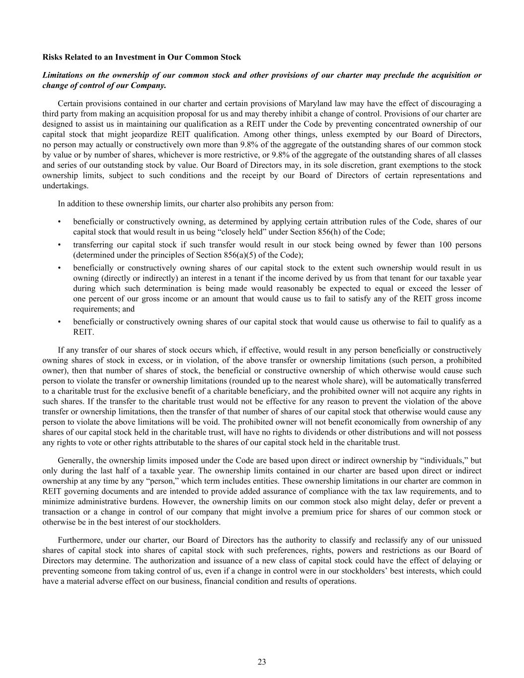 Risks Related to an Investment in Our Common Stock Limitations on the ownership of our common stock and other provisions of our charter may preclude the acquisition or change of control of our Company. Certain provisions contained in our charter and certain provisions of Maryland law may have the effect of discouraging a third party from making an acquisition proposal for us and may thereby inhibit a change of control. Provisions of our charter are designed to assist us in maintaining our qualification as a REIT under the Code by preventing concentrated ownership of our capital stock that might jeopardize REIT qualification. Among other things, unless exempted by our Board of Directors, no person may actually or constructively own more than 9.8% of the aggregate of the outstanding shares of our common stock by value or by number of shares, whichever is more restrictive, or 9.8% of the aggregate of the outstanding shares of all classes and series of our outstanding stock by value. Our Board of Directors may, in its sole discretion, grant exemptions to the stock ownership limits, subject to such conditions and the receipt by our Board of Directors of certain representations and undertakings. In addition to these ownership limits, our charter also prohibits any person from: • beneficially or constructively owning, as determined by applying certain attribution rules of the Code, shares of our capital stock that would result in us being “closely held” under Section 856(h) of the Code; • transferring our capital stock if such transfer would result in our stock being owned by fewer than 100 persons (determined under the principles of Section 856(a)(5) of the Code); • beneficially or constructively owning shares of our capital stock to the extent such ownership would result in us owning (directly or indirectly) an interest in a tenant if the income derived by us from that tenant for our taxable year during which such determination is being made would reasonably be expected to equal or exceed the lesser of one percent of our gross income or an amount that would cause us to fail to satisfy any of the REIT gross income requirements; and • beneficially or constructively owning shares of our capital stock that would cause us otherwise to fail to qualify as a REIT. If any transfer of our shares of stock occurs which, if effective, would result in any person beneficially or constructively owning shares of stock in excess, or in violation, of the above transfer or ownership limitations (such person, a prohibited owner), then that number of shares of stock, the beneficial or constructive ownership of which otherwise would cause such person to violate the transfer or ownership limitations (rounded up to the nearest whole share), will be automatically transferred to a charitable trust for the exclusive benefit of a charitable beneficiary, and the prohibited owner will not acquire any rights in such shares. If the transfer to the charitable trust would not be effective for any reason to prevent the violation of the above transfer or ownership limitations, then the transfer of that number of shares of our capital stock that otherwise would cause any person to violate the above limitations will be void. The prohibited owner will not benefit economically from ownership of any shares of our capital stock held in the charitable trust, will have no rights to dividends or other distributions and will not possess any rights to vote or other rights attributable to the shares of our capital stock held in the charitable trust. Generally, the ownership limits imposed under the Code are based upon direct or indirect ownership by “individuals,” but only during the last half of a taxable year. The ownership limits contained in our charter are based upon direct or indirect ownership at any time by any “person,” which term includes entities. These ownership limitations in our charter are common in REIT governing documents and are intended to provide added assurance of compliance with the tax law requirements, and to minimize administrative burdens. However, the ownership limits on our common stock also might delay, defer or prevent a transaction or a change in control of our company that might involve a premium price for shares of our common stock or otherwise be in the best interest of our stockholders. Furthermore, under our charter, our Board of Directors has the authority to classify and reclassify any of our unissued shares of capital stock into shares of capital stock with such preferences, rights, powers and restrictions as our Board of Directors may determine. The authorization and issuance of a new class of capital stock could have the effect of delaying or preventing someone from taking control of us, even if a change in control were in our stockholders’ best interests, which could have a material adverse effect on our business, financial condition and results of operations. 23