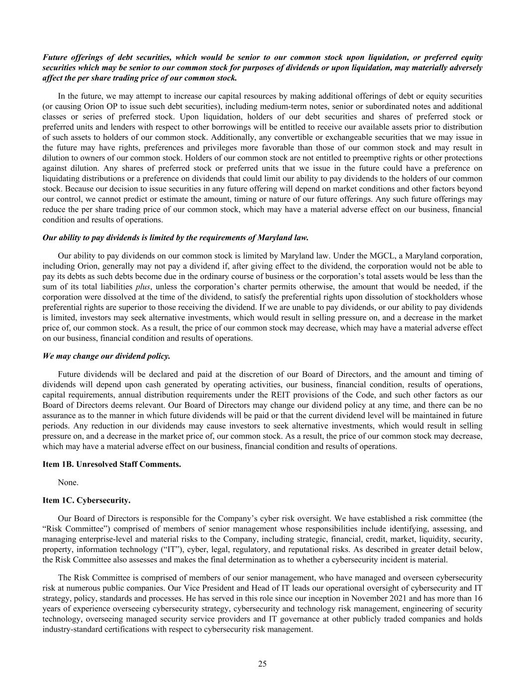 Future offerings of debt securities, which would be senior to our common stock upon liquidation, or preferred equity securities which may be senior to our common stock for purposes of dividends or upon liquidation, may materially adversely affect the per share trading price of our common stock. In the future, we may attempt to increase our capital resources by making additional offerings of debt or equity securities (or causing Orion OP to issue such debt securities), including medium-term notes, senior or subordinated notes and additional classes or series of preferred stock. Upon liquidation, holders of our debt securities and shares of preferred stock or preferred units and lenders with respect to other borrowings will be entitled to receive our available assets prior to distribution of such assets to holders of our common stock. Additionally, any convertible or exchangeable securities that we may issue in the future may have rights, preferences and privileges more favorable than those of our common stock and may result in dilution to owners of our common stock. Holders of our common stock are not entitled to preemptive rights or other protections against dilution. Any shares of preferred stock or preferred units that we issue in the future could have a preference on liquidating distributions or a preference on dividends that could limit our ability to pay dividends to the holders of our common stock. Because our decision to issue securities in any future offering will depend on market conditions and other factors beyond our control, we cannot predict or estimate the amount, timing or nature of our future offerings. Any such future offerings may reduce the per share trading price of our common stock, which may have a material adverse effect on our business, financial condition and results of operations. Our ability to pay dividends is limited by the requirements of Maryland law. Our ability to pay dividends on our common stock is limited by Maryland law. Under the MGCL, a Maryland corporation, including Orion, generally may not pay a dividend if, after giving effect to the dividend, the corporation would not be able to pay its debts as such debts become due in the ordinary course of business or the corporation’s total assets would be less than the sum of its total liabilities plus, unless the corporation’s charter permits otherwise, the amount that would be needed, if the corporation were dissolved at the time of the dividend, to satisfy the preferential rights upon dissolution of stockholders whose preferential rights are superior to those receiving the dividend. If we are unable to pay dividends, or our ability to pay dividends is limited, investors may seek alternative investments, which would result in selling pressure on, and a decrease in the market price of, our common stock. As a result, the price of our common stock may decrease, which may have a material adverse effect on our business, financial condition and results of operations. We may change our dividend policy. Future dividends will be declared and paid at the discretion of our Board of Directors, and the amount and timing of dividends will depend upon cash generated by operating activities, our business, financial condition, results of operations, capital requirements, annual distribution requirements under the REIT provisions of the Code, and such other factors as our Board of Directors deems relevant. Our Board of Directors may change our dividend policy at any time, and there can be no assurance as to the manner in which future dividends will be paid or that the current dividend level will be maintained in future periods. Any reduction in our dividends may cause investors to seek alternative investments, which would result in selling pressure on, and a decrease in the market price of, our common stock. As a result, the price of our common stock may decrease, which may have a material adverse effect on our business, financial condition and results of operations. Item 1B. Unresolved Staff Comments. None. Item 1C. Cybersecurity. Our Board of Directors is responsible for the Company’s cyber risk oversight. We have established a risk committee (the “Risk Committee”) comprised of members of senior management whose responsibilities include identifying, assessing, and managing enterprise-level and material risks to the Company, including strategic, financial, credit, market, liquidity, security, property, information technology (“IT”), cyber, legal, regulatory, and reputational risks. As described in greater detail below, the Risk Committee also assesses and makes the final determination as to whether a cybersecurity incident is material. The Risk Committee is comprised of members of our senior management, who have managed and overseen cybersecurity risk at numerous public companies. Our Vice President and Head of IT leads our operational oversight of cybersecurity and IT strategy, policy, standards and processes. He has served in this role since our inception in November 2021 and has more than 16 years of experience overseeing cybersecurity strategy, cybersecurity and technology risk management, engineering of security technology, overseeing managed security service providers and IT governance at other publicly traded companies and holds industry-standard certifications with respect to cybersecurity risk management. 25
