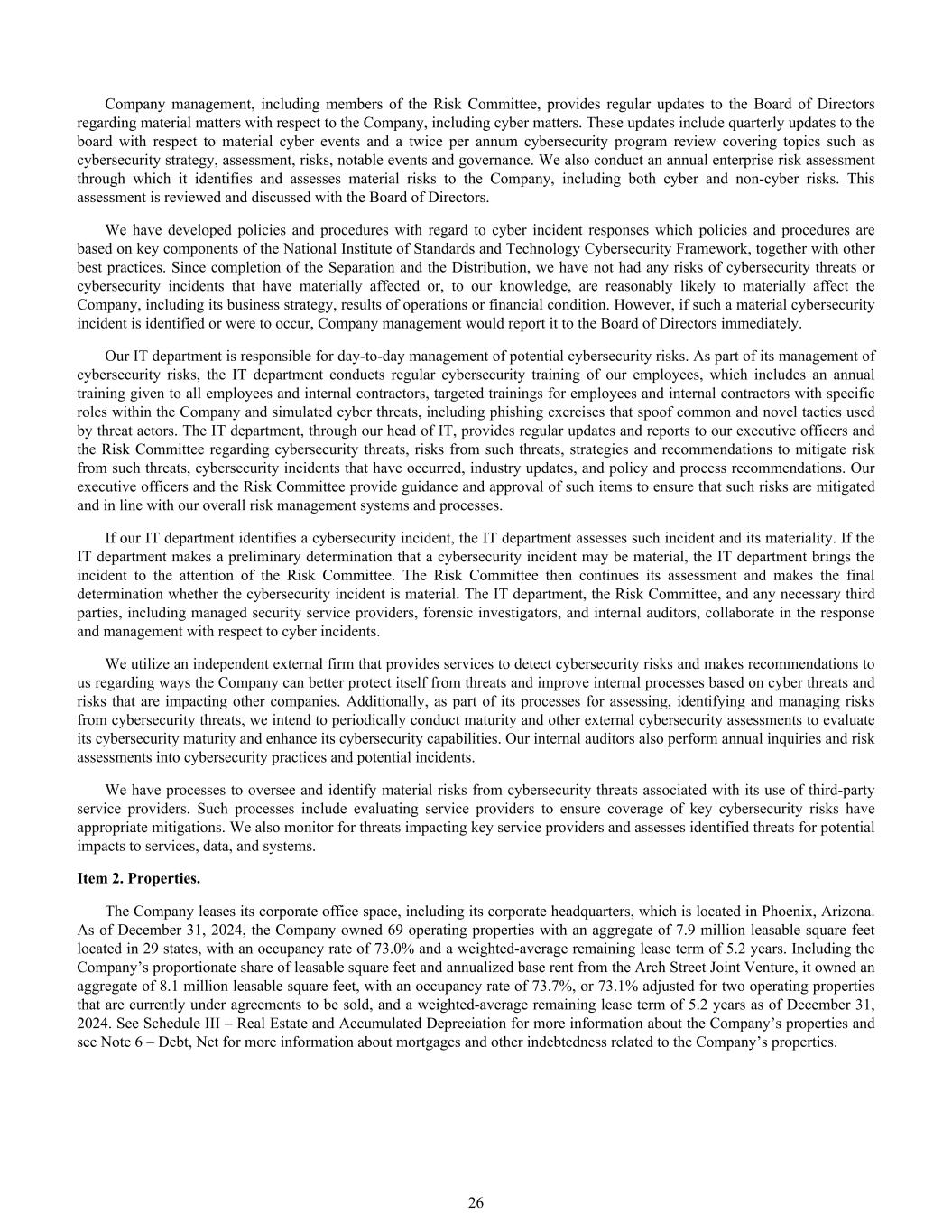 Company management, including members of the Risk Committee, provides regular updates to the Board of Directors regarding material matters with respect to the Company, including cyber matters. These updates include quarterly updates to the board with respect to material cyber events and a twice per annum cybersecurity program review covering topics such as cybersecurity strategy, assessment, risks, notable events and governance. We also conduct an annual enterprise risk assessment through which it identifies and assesses material risks to the Company, including both cyber and non-cyber risks. This assessment is reviewed and discussed with the Board of Directors. We have developed policies and procedures with regard to cyber incident responses which policies and procedures are based on key components of the National Institute of Standards and Technology Cybersecurity Framework, together with other best practices. Since completion of the Separation and the Distribution, we have not had any risks of cybersecurity threats or cybersecurity incidents that have materially affected or, to our knowledge, are reasonably likely to materially affect the Company, including its business strategy, results of operations or financial condition. However, if such a material cybersecurity incident is identified or were to occur, Company management would report it to the Board of Directors immediately. Our IT department is responsible for day-to-day management of potential cybersecurity risks. As part of its management of cybersecurity risks, the IT department conducts regular cybersecurity training of our employees, which includes an annual training given to all employees and internal contractors, targeted trainings for employees and internal contractors with specific roles within the Company and simulated cyber threats, including phishing exercises that spoof common and novel tactics used by threat actors. The IT department, through our head of IT, provides regular updates and reports to our executive officers and the Risk Committee regarding cybersecurity threats, risks from such threats, strategies and recommendations to mitigate risk from such threats, cybersecurity incidents that have occurred, industry updates, and policy and process recommendations. Our executive officers and the Risk Committee provide guidance and approval of such items to ensure that such risks are mitigated and in line with our overall risk management systems and processes. If our IT department identifies a cybersecurity incident, the IT department assesses such incident and its materiality. If the IT department makes a preliminary determination that a cybersecurity incident may be material, the IT department brings the incident to the attention of the Risk Committee. The Risk Committee then continues its assessment and makes the final determination whether the cybersecurity incident is material. The IT department, the Risk Committee, and any necessary third parties, including managed security service providers, forensic investigators, and internal auditors, collaborate in the response and management with respect to cyber incidents. We utilize an independent external firm that provides services to detect cybersecurity risks and makes recommendations to us regarding ways the Company can better protect itself from threats and improve internal processes based on cyber threats and risks that are impacting other companies. Additionally, as part of its processes for assessing, identifying and managing risks from cybersecurity threats, we intend to periodically conduct maturity and other external cybersecurity assessments to evaluate its cybersecurity maturity and enhance its cybersecurity capabilities. Our internal auditors also perform annual inquiries and risk assessments into cybersecurity practices and potential incidents. We have processes to oversee and identify material risks from cybersecurity threats associated with its use of third-party service providers. Such processes include evaluating service providers to ensure coverage of key cybersecurity risks have appropriate mitigations. We also monitor for threats impacting key service providers and assesses identified threats for potential impacts to services, data, and systems. Item 2. Properties. The Company leases its corporate office space, including its corporate headquarters, which is located in Phoenix, Arizona. As of December 31, 2024, the Company owned 69 operating properties with an aggregate of 7.9 million leasable square feet located in 29 states, with an occupancy rate of 73.0% and a weighted-average remaining lease term of 5.2 years. Including the Company’s proportionate share of leasable square feet and annualized base rent from the Arch Street Joint Venture, it owned an aggregate of 8.1 million leasable square feet, with an occupancy rate of 73.7%, or 73.1% adjusted for two operating properties that are currently under agreements to be sold, and a weighted-average remaining lease term of 5.2 years as of December 31, 2024. See Schedule III – Real Estate and Accumulated Depreciation for more information about the Company’s properties and see Note 6 – Debt, Net for more information about mortgages and other indebtedness related to the Company’s properties. 26