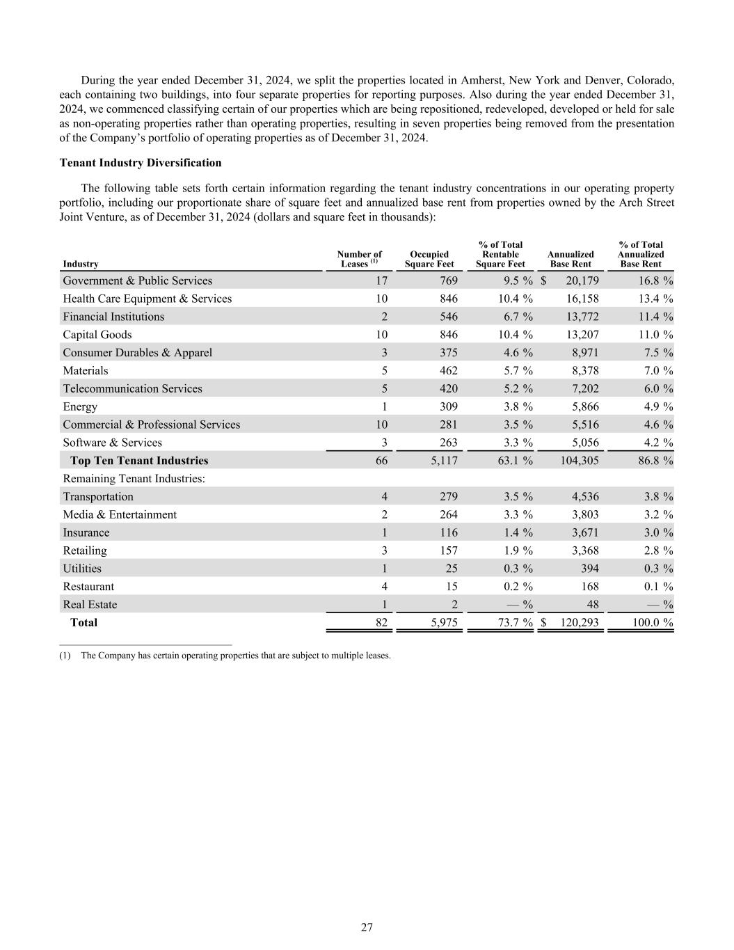 During the year ended December 31, 2024, we split the properties located in Amherst, New York and Denver, Colorado, each containing two buildings, into four separate properties for reporting purposes. Also during the year ended December 31, 2024, we commenced classifying certain of our properties which are being repositioned, redeveloped, developed or held for sale as non-operating properties rather than operating properties, resulting in seven properties being removed from the presentation of the Company’s portfolio of operating properties as of December 31, 2024. Tenant Industry Diversification The following table sets forth certain information regarding the tenant industry concentrations in our operating property portfolio, including our proportionate share of square feet and annualized base rent from properties owned by the Arch Street Joint Venture, as of December 31, 2024 (dollars and square feet in thousands): Government & Public Services 17 769 9.5 % $ 20,179 16.8 % Health Care Equipment & Services 10 846 10.4 % 16,158 13.4 % Financial Institutions 2 546 6.7 % 13,772 11.4 % Capital Goods 10 846 10.4 % 13,207 11.0 % Consumer Durables & Apparel 3 375 4.6 % 8,971 7.5 % Materials 5 462 5.7 % 8,378 7.0 % Telecommunication Services 5 420 5.2 % 7,202 6.0 % Energy 1 309 3.8 % 5,866 4.9 % Commercial & Professional Services 10 281 3.5 % 5,516 4.6 % Software & Services 3 263 3.3 % 5,056 4.2 % Top Ten Tenant Industries 66 5,117 63.1 % 104,305 86.8 % Remaining Tenant Industries: Transportation 4 279 3.5 % 4,536 3.8 % Media & Entertainment 2 264 3.3 % 3,803 3.2 % Insurance 1 116 1.4 % 3,671 3.0 % Retailing 3 157 1.9 % 3,368 2.8 % Utilities 1 25 0.3 % 394 0.3 % Restaurant 4 15 0.2 % 168 0.1 % Real Estate 1 2 — % 48 — % Total 82 5,975 73.7 % $ 120,293 100.0 % Industry Number of Leases (1) Occupied Square Feet % of Total Rentable Square Feet Annualized Base Rent % of Total Annualized Base Rent ____________________________________ (1) The Company has certain operating properties that are subject to multiple leases. 27