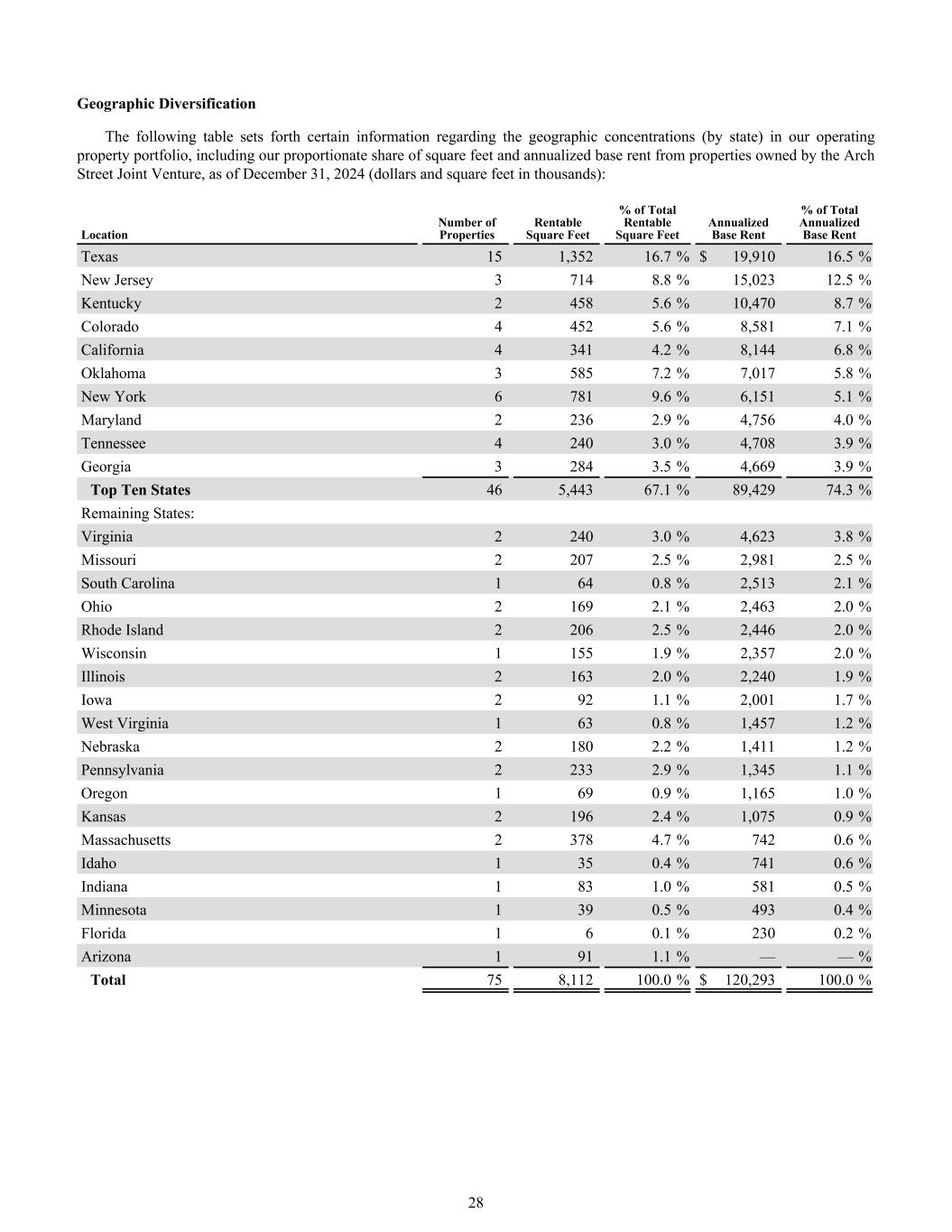 Geographic Diversification The following table sets forth certain information regarding the geographic concentrations (by state) in our operating property portfolio, including our proportionate share of square feet and annualized base rent from properties owned by the Arch Street Joint Venture, as of December 31, 2024 (dollars and square feet in thousands): Texas 15 1,352 16.7 % $ 19,910 16.5 % New Jersey 3 714 8.8 % 15,023 12.5 % Kentucky 2 458 5.6 % 10,470 8.7 % Colorado 4 452 5.6 % 8,581 7.1 % California 4 341 4.2 % 8,144 6.8 % Oklahoma 3 585 7.2 % 7,017 5.8 % New York 6 781 9.6 % 6,151 5.1 % Maryland 2 236 2.9 % 4,756 4.0 % Tennessee 4 240 3.0 % 4,708 3.9 % Georgia 3 284 3.5 % 4,669 3.9 % Top Ten States 46 5,443 67.1 % 89,429 74.3 % Remaining States: Virginia 2 240 3.0 % 4,623 3.8 % Missouri 2 207 2.5 % 2,981 2.5 % South Carolina 1 64 0.8 % 2,513 2.1 % Ohio 2 169 2.1 % 2,463 2.0 % Rhode Island 2 206 2.5 % 2,446 2.0 % Wisconsin 1 155 1.9 % 2,357 2.0 % Illinois 2 163 2.0 % 2,240 1.9 % Iowa 2 92 1.1 % 2,001 1.7 % West Virginia 1 63 0.8 % 1,457 1.2 % Nebraska 2 180 2.2 % 1,411 1.2 % Pennsylvania 2 233 2.9 % 1,345 1.1 % Oregon 1 69 0.9 % 1,165 1.0 % Kansas 2 196 2.4 % 1,075 0.9 % Massachusetts 2 378 4.7 % 742 0.6 % Idaho 1 35 0.4 % 741 0.6 % Indiana 1 83 1.0 % 581 0.5 % Minnesota 1 39 0.5 % 493 0.4 % Florida 1 6 0.1 % 230 0.2 % Arizona 1 91 1.1 % — — % Total 75 8,112 100.0 % $ 120,293 100.0 % Location Number of Properties Rentable Square Feet % of Total Rentable Square Feet Annualized Base Rent % of Total Annualized Base Rent 28
