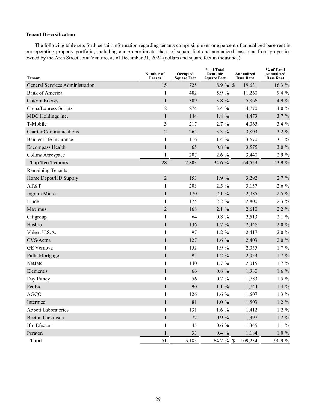 Tenant Diversification The following table sets forth certain information regarding tenants comprising over one percent of annualized base rent in our operating property portfolio, including our proportionate share of square feet and annualized base rent from properties owned by the Arch Street Joint Venture, as of December 31, 2024 (dollars and square feet in thousands): Tenant Number of Leases Occupied Square Feet % of Total Rentable Square Feet Annualized Base Rent % of Total Annualized Base Rent General Services Administration 15 725 8.9 % $ 19,631 16.3 % Bank of America 1 482 5.9 % 11,260 9.4 % Coterra Energy 1 309 3.8 % 5,866 4.9 % Cigna/Express Scripts 2 274 3.4 % 4,770 4.0 % MDC Holdings Inc. 1 144 1.8 % 4,473 3.7 % T-Mobile 3 217 2.7 % 4,065 3.4 % Charter Communications 2 264 3.3 % 3,803 3.2 % Banner Life Insurance 1 116 1.4 % 3,670 3.1 % Encompass Health 1 65 0.8 % 3,575 3.0 % Collins Aerospace 1 207 2.6 % 3,440 2.9 % Top Ten Tenants 28 2,803 34.6 % 64,553 53.9 % Remaining Tenants: Home Depot/HD Supply 2 153 1.9 % 3,292 2.7 % AT&T 1 203 2.5 % 3,137 2.6 % Ingram Micro 1 170 2.1 % 2,985 2.5 % Linde 1 175 2.2 % 2,800 2.3 % Maximus 2 168 2.1 % 2,610 2.2 % Citigroup 1 64 0.8 % 2,513 2.1 % Hasbro 1 136 1.7 % 2,446 2.0 % Valent U.S.A. 1 97 1.2 % 2,417 2.0 % CVS/Aetna 1 127 1.6 % 2,403 2.0 % GE Vernova 1 152 1.9 % 2,055 1.7 % Pulte Mortgage 1 95 1.2 % 2,053 1.7 % NetJets 1 140 1.7 % 2,015 1.7 % Elementis 1 66 0.8 % 1,980 1.6 % Day Pitney 1 56 0.7 % 1,783 1.5 % FedEx 1 90 1.1 % 1,744 1.4 % AGCO 1 126 1.6 % 1,607 1.3 % Intermec 1 81 1.0 % 1,503 1.2 % Abbott Laboratories 1 131 1.6 % 1,412 1.2 % Becton Dickinson 1 72 0.9 % 1,397 1.2 % Ifm Efector 1 45 0.6 % 1,345 1.1 % Peraton 1 33 0.4 % 1,184 1.0 % Total 51 5,183 64.2 % $ 109,234 90.9 % 29