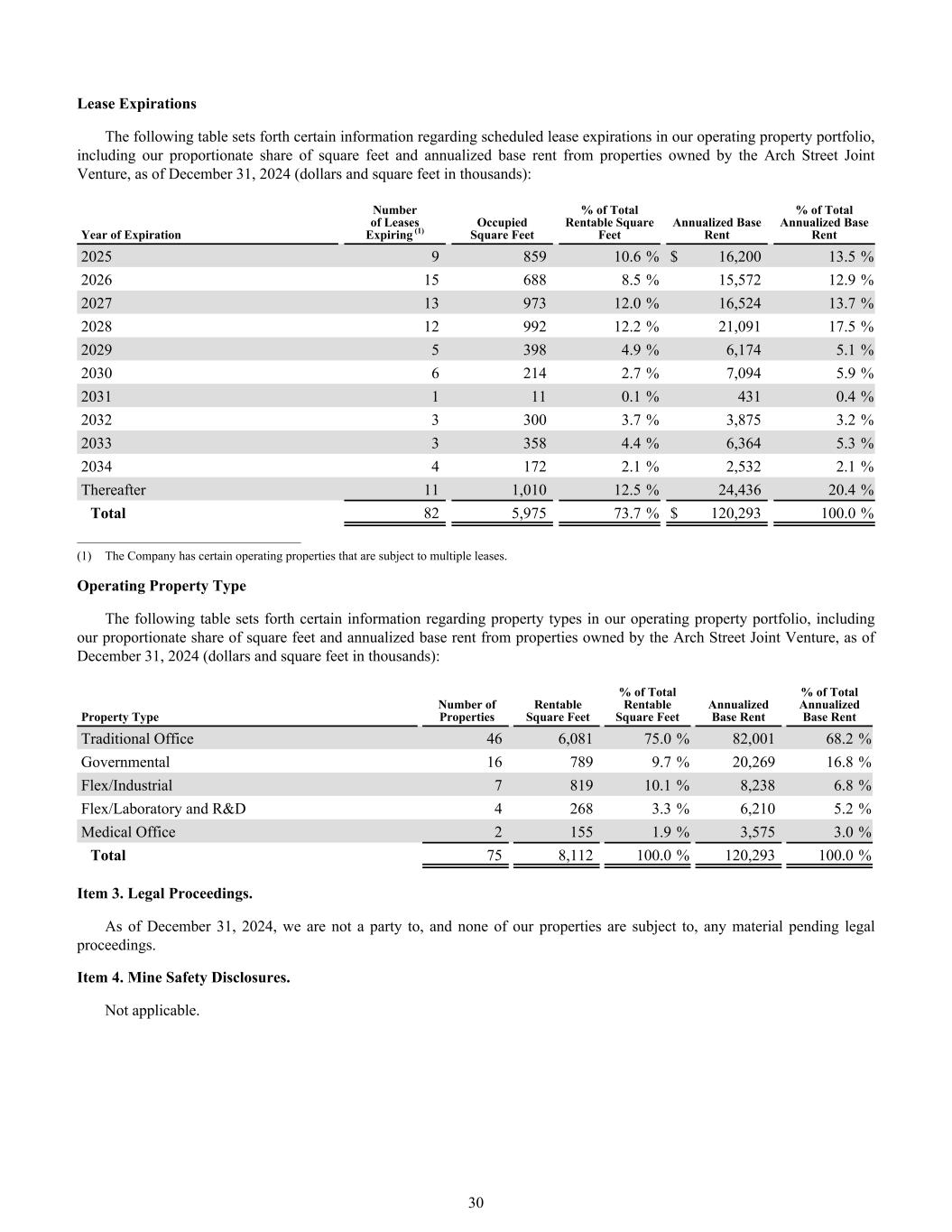 Lease Expirations The following table sets forth certain information regarding scheduled lease expirations in our operating property portfolio, including our proportionate share of square feet and annualized base rent from properties owned by the Arch Street Joint Venture, as of December 31, 2024 (dollars and square feet in thousands): Year of Expiration Number of Leases Expiring (1) Occupied Square Feet % of Total Rentable Square Feet Annualized Base Rent % of Total Annualized Base Rent 2025 9 859 10.6 % $ 16,200 13.5 % 2026 15 688 8.5 % 15,572 12.9 % 2027 13 973 12.0 % 16,524 13.7 % 2028 12 992 12.2 % 21,091 17.5 % 2029 5 398 4.9 % 6,174 5.1 % 2030 6 214 2.7 % 7,094 5.9 % 2031 1 11 0.1 % 431 0.4 % 2032 3 300 3.7 % 3,875 3.2 % 2033 3 358 4.4 % 6,364 5.3 % 2034 4 172 2.1 % 2,532 2.1 % Thereafter 11 1,010 12.5 % 24,436 20.4 % Total 82 5,975 73.7 % $ 120,293 100.0 % ____________________________________ (1) The Company has certain operating properties that are subject to multiple leases. Operating Property Type The following table sets forth certain information regarding property types in our operating property portfolio, including our proportionate share of square feet and annualized base rent from properties owned by the Arch Street Joint Venture, as of December 31, 2024 (dollars and square feet in thousands): Property Type Number of Properties Rentable Square Feet % of Total Rentable Square Feet Annualized Base Rent % of Total Annualized Base Rent Traditional Office 46 6,081 75.0 % 82,001 68.2 % Governmental 16 789 9.7 % 20,269 16.8 % Flex/Industrial 7 819 10.1 % 8,238 6.8 % Flex/Laboratory and R&D 4 268 3.3 % 6,210 5.2 % Medical Office 2 155 1.9 % 3,575 3.0 % Total 75 8,112 100.0 % 120,293 100.0 % Item 3. Legal Proceedings. As of December 31, 2024, we are not a party to, and none of our properties are subject to, any material pending legal proceedings. Item 4. Mine Safety Disclosures. Not applicable. 30