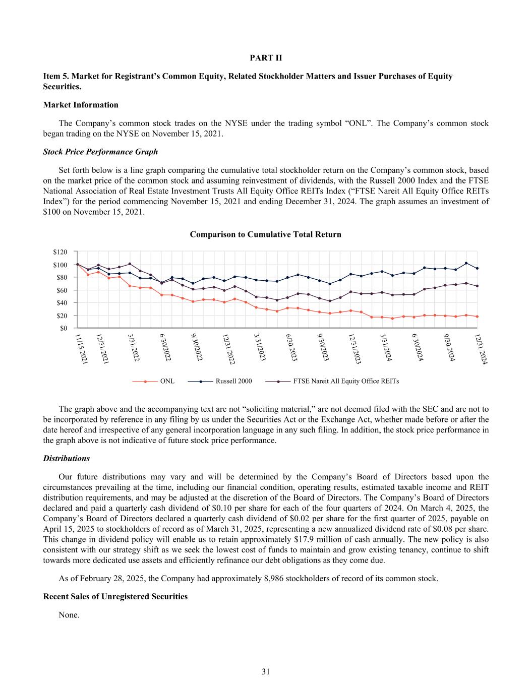 PART II Item 5. Market for Registrant’s Common Equity, Related Stockholder Matters and Issuer Purchases of Equity Securities. Market Information The Company’s common stock trades on the NYSE under the trading symbol “ONL”. The Company’s common stock began trading on the NYSE on November 15, 2021. Stock Price Performance Graph Set forth below is a line graph comparing the cumulative total stockholder return on the Company’s common stock, based on the market price of the common stock and assuming reinvestment of dividends, with the Russell 2000 Index and the FTSE National Association of Real Estate Investment Trusts All Equity Office REITs Index (“FTSE Nareit All Equity Office REITs Index”) for the period commencing November 15, 2021 and ending December 31, 2024. The graph assumes an investment of $100 on November 15, 2021. The graph above and the accompanying text are not “soliciting material,” are not deemed filed with the SEC and are not to be incorporated by reference in any filing by us under the Securities Act or the Exchange Act, whether made before or after the date hereof and irrespective of any general incorporation language in any such filing. In addition, the stock price performance in the graph above is not indicative of future stock price performance. Distributions Our future distributions may vary and will be determined by the Company’s Board of Directors based upon the circumstances prevailing at the time, including our financial condition, operating results, estimated taxable income and REIT distribution requirements, and may be adjusted at the discretion of the Board of Directors. The Company’s Board of Directors declared and paid a quarterly cash dividend of $0.10 per share for each of the four quarters of 2024. On March 4, 2025, the Company’s Board of Directors declared a quarterly cash dividend of $0.02 per share for the first quarter of 2025, payable on April 15, 2025 to stockholders of record as of March 31, 2025, representing a new annualized dividend rate of $0.08 per share. This change in dividend policy will enable us to retain approximately $17.9 million of cash annually. The new policy is also consistent with our strategy shift as we seek the lowest cost of funds to maintain and grow existing tenancy, continue to shift towards more dedicated use assets and efficiently refinance our debt obligations as they come due. As of February 28, 2025, the Company had approximately 8,986 stockholders of record of its common stock. Recent Sales of Unregistered Securities None. 31 Comparison to Cumulative Total Return ONL Russell 2000 FTSE Nareit All Equity Office REITs 11/15/2021 12/31/2021 3/31/2022 6/30/2022 9/30/2022 12/31/2022 3/31/2023 6/30/2023 9/30/2023 12/31/2023 3/31/2024 6/30/2024 9/30/2024 12/31/2024 $0 $20 $40 $60 $80 $100 $120