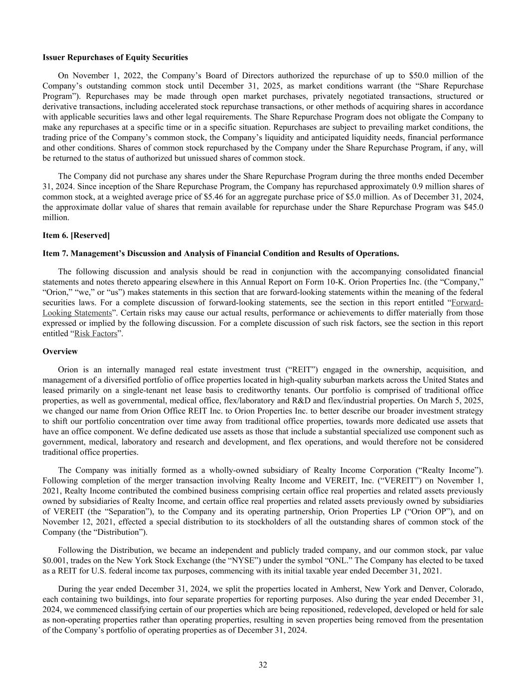 Issuer Repurchases of Equity Securities On November 1, 2022, the Company’s Board of Directors authorized the repurchase of up to $50.0 million of the Company’s outstanding common stock until December 31, 2025, as market conditions warrant (the “Share Repurchase Program”). Repurchases may be made through open market purchases, privately negotiated transactions, structured or derivative transactions, including accelerated stock repurchase transactions, or other methods of acquiring shares in accordance with applicable securities laws and other legal requirements. The Share Repurchase Program does not obligate the Company to make any repurchases at a specific time or in a specific situation. Repurchases are subject to prevailing market conditions, the trading price of the Company’s common stock, the Company’s liquidity and anticipated liquidity needs, financial performance and other conditions. Shares of common stock repurchased by the Company under the Share Repurchase Program, if any, will be returned to the status of authorized but unissued shares of common stock. The Company did not purchase any shares under the Share Repurchase Program during the three months ended December 31, 2024. Since inception of the Share Repurchase Program, the Company has repurchased approximately 0.9 million shares of common stock, at a weighted average price of $5.46 for an aggregate purchase price of $5.0 million. As of December 31, 2024, the approximate dollar value of shares that remain available for repurchase under the Share Repurchase Program was $45.0 million. Item 6. [Reserved] Item 7. Management’s Discussion and Analysis of Financial Condition and Results of Operations. The following discussion and analysis should be read in conjunction with the accompanying consolidated financial statements and notes thereto appearing elsewhere in this Annual Report on Form 10-K. Orion Properties Inc. (the “Company,” “Orion,” “we,” or “us”) makes statements in this section that are forward-looking statements within the meaning of the federal securities laws. For a complete discussion of forward-looking statements, see the section in this report entitled “Forward- Looking Statements”. Certain risks may cause our actual results, performance or achievements to differ materially from those expressed or implied by the following discussion. For a complete discussion of such risk factors, see the section in this report entitled “Risk Factors”. Overview Orion is an internally managed real estate investment trust (“REIT”) engaged in the ownership, acquisition, and management of a diversified portfolio of office properties located in high-quality suburban markets across the United States and leased primarily on a single-tenant net lease basis to creditworthy tenants. Our portfolio is comprised of traditional office properties, as well as governmental, medical office, flex/laboratory and R&D and flex/industrial properties. On March 5, 2025, we changed our name from Orion Office REIT Inc. to Orion Properties Inc. to better describe our broader investment strategy to shift our portfolio concentration over time away from traditional office properties, towards more dedicated use assets that have an office component. We define dedicated use assets as those that include a substantial specialized use component such as government, medical, laboratory and research and development, and flex operations, and would therefore not be considered traditional office properties. The Company was initially formed as a wholly-owned subsidiary of Realty Income Corporation (“Realty Income”). Following completion of the merger transaction involving Realty Income and VEREIT, Inc. (“VEREIT”) on November 1, 2021, Realty Income contributed the combined business comprising certain office real properties and related assets previously owned by subsidiaries of Realty Income, and certain office real properties and related assets previously owned by subsidiaries of VEREIT (the “Separation”), to the Company and its operating partnership, Orion Properties LP (“Orion OP”), and on November 12, 2021, effected a special distribution to its stockholders of all the outstanding shares of common stock of the Company (the “Distribution”). Following the Distribution, we became an independent and publicly traded company, and our common stock, par value $0.001, trades on the New York Stock Exchange (the “NYSE”) under the symbol “ONL.” The Company has elected to be taxed as a REIT for U.S. federal income tax purposes, commencing with its initial taxable year ended December 31, 2021. During the year ended December 31, 2024, we split the properties located in Amherst, New York and Denver, Colorado, each containing two buildings, into four separate properties for reporting purposes. Also during the year ended December 31, 2024, we commenced classifying certain of our properties which are being repositioned, redeveloped, developed or held for sale as non-operating properties rather than operating properties, resulting in seven properties being removed from the presentation of the Company’s portfolio of operating properties as of December 31, 2024. 32
