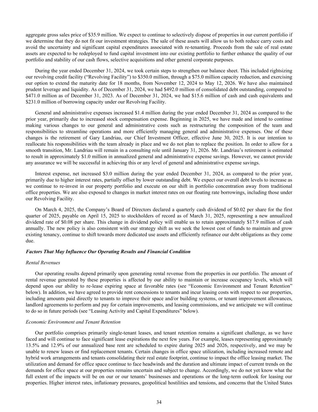 aggregate gross sales price of $35.9 million. We expect to continue to selectively dispose of properties in our current portfolio if we determine that they do not fit our investment strategies. The sale of these assets will allow us to both reduce carry costs and avoid the uncertainty and significant capital expenditures associated with re-tenanting. Proceeds from the sale of real estate assets are expected to be redeployed to fund capital investment into our existing portfolio to further enhance the quality of our portfolio and stability of our cash flows, selective acquisitions and other general corporate purposes. During the year ended December 31, 2024, we took certain steps to strengthen our balance sheet. This included rightsizing our revolving credit facility (“Revolving Facility”) to $350.0 million, through a $75.0 million capacity reduction, and exercising our option to extend the maturity date for 18 months, from November 12, 2024 to May 12, 2026. We have also maintained prudent leverage and liquidity. As of December 31, 2024, we had $492.0 million of consolidated debt outstanding, compared to $471.0 million as of December 31, 2023. As of December 31, 2024, we had $15.6 million of cash and cash equivalents and $231.0 million of borrowing capacity under our Revolving Facility. General and administrative expenses increased $1.4 million during the year ended December 31, 2024 as compared to the prior year, primarily due to increased stock compensation expense. Beginning in 2025, we have made and intend to continue making various changes to our general and administrative costs such as restructuring the composition of the team and responsibilities to streamline operations and more efficiently managing general and administrative expenses. One of these changes is the retirement of Gary Landriau, our Chief Investment Officer, effective June 30, 2025. It is our intention to reallocate his responsibilities with the team already in place and we do not plan to replace the position. In order to allow for a smooth transition, Mr. Landriau will remain in a consulting role until January 31, 2026. Mr. Landriau’s retirement is estimated to result in approximately $1.0 million in annualized general and administrative expense savings. However, we cannot provide any assurance we will be successful in achieving this or any level of general and administrative expense savings. Interest expense, net increased $3.0 million during the year ended December 31, 2024, as compared to the prior year, primarily due to higher interest rates, partially offset by lower outstanding debt. We expect our overall debt levels to increase as we continue to re-invest in our property portfolio and execute on our shift in portfolio concentration away from traditional office properties. We are also exposed to changes in market interest rates on our floating rate borrowings, including those under our Revolving Facility. On March 4, 2025, the Company’s Board of Directors declared a quarterly cash dividend of $0.02 per share for the first quarter of 2025, payable on April 15, 2025 to stockholders of record as of March 31, 2025, representing a new annualized dividend rate of $0.08 per share. This change in dividend policy will enable us to retain approximately $17.9 million of cash annually. The new policy is also consistent with our strategy shift as we seek the lowest cost of funds to maintain and grow existing tenancy, continue to shift towards more dedicated use assets and efficiently refinance our debt obligations as they come due. Factors That May Influence Our Operating Results and Financial Condition Rental Revenues Our operating results depend primarily upon generating rental revenue from the properties in our portfolio. The amount of rental revenue generated by these properties is affected by our ability to maintain or increase occupancy levels, which will depend upon our ability to re-lease expiring space at favorable rates (see “Economic Environment and Tenant Retention” below). In addition, we have agreed to provide rent concessions to tenants and incur leasing costs with respect to our properties, including amounts paid directly to tenants to improve their space and/or building systems, or tenant improvement allowances, landlord agreements to perform and pay for certain improvements, and leasing commissions, and we anticipate we will continue to do so in future periods (see “Leasing Activity and Capital Expenditures” below). Economic Environment and Tenant Retention Our portfolio comprises primarily single-tenant leases, and tenant retention remains a significant challenge, as we have faced and will continue to face significant lease expirations the next few years. For example, leases representing approximately 13.5% and 12.9% of our annualized base rent are scheduled to expire during 2025 and 2026, respectively, and we may be unable to renew leases or find replacement tenants. Certain changes in office space utilization, including increased remote and hybrid work arrangements and tenants consolidating their real estate footprint, continue to impact the office leasing market. The utilization and demand for office space continue to face headwinds and the duration and ultimate impact of current trends on the demands for office space at our properties remains uncertain and subject to change. Accordingly, we do not yet know what the full extent of the impacts will be on our or our tenants’ businesses and operations or the long-term outlook for leasing our properties. Higher interest rates, inflationary pressures, geopolitical hostilities and tensions, and concerns that the United States 34