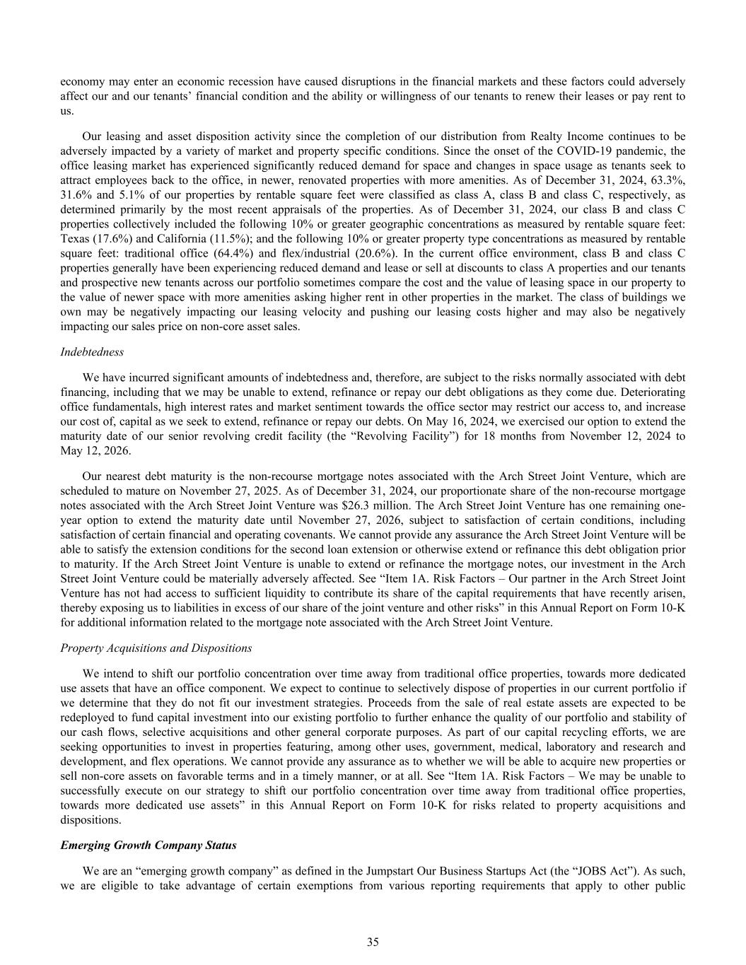 economy may enter an economic recession have caused disruptions in the financial markets and these factors could adversely affect our and our tenants’ financial condition and the ability or willingness of our tenants to renew their leases or pay rent to us. Our leasing and asset disposition activity since the completion of our distribution from Realty Income continues to be adversely impacted by a variety of market and property specific conditions. Since the onset of the COVID-19 pandemic, the office leasing market has experienced significantly reduced demand for space and changes in space usage as tenants seek to attract employees back to the office, in newer, renovated properties with more amenities. As of December 31, 2024, 63.3%, 31.6% and 5.1% of our properties by rentable square feet were classified as class A, class B and class C, respectively, as determined primarily by the most recent appraisals of the properties. As of December 31, 2024, our class B and class C properties collectively included the following 10% or greater geographic concentrations as measured by rentable square feet: Texas (17.6%) and California (11.5%); and the following 10% or greater property type concentrations as measured by rentable square feet: traditional office (64.4%) and flex/industrial (20.6%). In the current office environment, class B and class C properties generally have been experiencing reduced demand and lease or sell at discounts to class A properties and our tenants and prospective new tenants across our portfolio sometimes compare the cost and the value of leasing space in our property to the value of newer space with more amenities asking higher rent in other properties in the market. The class of buildings we own may be negatively impacting our leasing velocity and pushing our leasing costs higher and may also be negatively impacting our sales price on non-core asset sales. Indebtedness We have incurred significant amounts of indebtedness and, therefore, are subject to the risks normally associated with debt financing, including that we may be unable to extend, refinance or repay our debt obligations as they come due. Deteriorating office fundamentals, high interest rates and market sentiment towards the office sector may restrict our access to, and increase our cost of, capital as we seek to extend, refinance or repay our debts. On May 16, 2024, we exercised our option to extend the maturity date of our senior revolving credit facility (the “Revolving Facility”) for 18 months from November 12, 2024 to May 12, 2026. Our nearest debt maturity is the non-recourse mortgage notes associated with the Arch Street Joint Venture, which are scheduled to mature on November 27, 2025. As of December 31, 2024, our proportionate share of the non-recourse mortgage notes associated with the Arch Street Joint Venture was $26.3 million. The Arch Street Joint Venture has one remaining one- year option to extend the maturity date until November 27, 2026, subject to satisfaction of certain conditions, including satisfaction of certain financial and operating covenants. We cannot provide any assurance the Arch Street Joint Venture will be able to satisfy the extension conditions for the second loan extension or otherwise extend or refinance this debt obligation prior to maturity. If the Arch Street Joint Venture is unable to extend or refinance the mortgage notes, our investment in the Arch Street Joint Venture could be materially adversely affected. See “Item 1A. Risk Factors – Our partner in the Arch Street Joint Venture has not had access to sufficient liquidity to contribute its share of the capital requirements that have recently arisen, thereby exposing us to liabilities in excess of our share of the joint venture and other risks” in this Annual Report on Form 10-K for additional information related to the mortgage note associated with the Arch Street Joint Venture. Property Acquisitions and Dispositions We intend to shift our portfolio concentration over time away from traditional office properties, towards more dedicated use assets that have an office component. We expect to continue to selectively dispose of properties in our current portfolio if we determine that they do not fit our investment strategies. Proceeds from the sale of real estate assets are expected to be redeployed to fund capital investment into our existing portfolio to further enhance the quality of our portfolio and stability of our cash flows, selective acquisitions and other general corporate purposes. As part of our capital recycling efforts, we are seeking opportunities to invest in properties featuring, among other uses, government, medical, laboratory and research and development, and flex operations. We cannot provide any assurance as to whether we will be able to acquire new properties or sell non-core assets on favorable terms and in a timely manner, or at all. See “Item 1A. Risk Factors – We may be unable to successfully execute on our strategy to shift our portfolio concentration over time away from traditional office properties, towards more dedicated use assets” in this Annual Report on Form 10-K for risks related to property acquisitions and dispositions. Emerging Growth Company Status We are an “emerging growth company” as defined in the Jumpstart Our Business Startups Act (the “JOBS Act”). As such, we are eligible to take advantage of certain exemptions from various reporting requirements that apply to other public 35