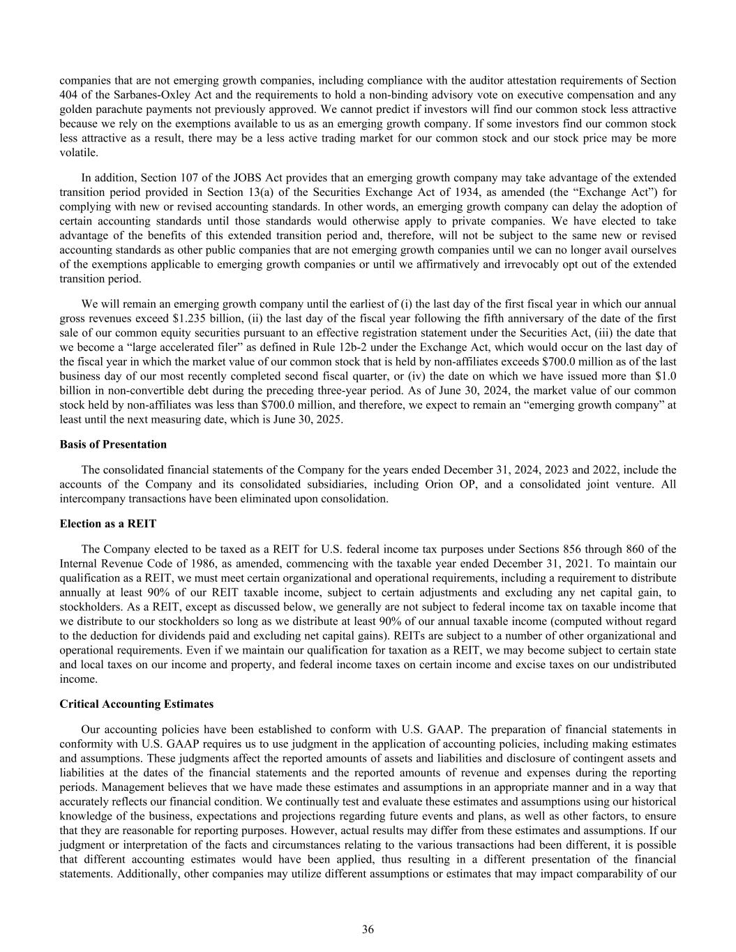 companies that are not emerging growth companies, including compliance with the auditor attestation requirements of Section 404 of the Sarbanes-Oxley Act and the requirements to hold a non-binding advisory vote on executive compensation and any golden parachute payments not previously approved. We cannot predict if investors will find our common stock less attractive because we rely on the exemptions available to us as an emerging growth company. If some investors find our common stock less attractive as a result, there may be a less active trading market for our common stock and our stock price may be more volatile. In addition, Section 107 of the JOBS Act provides that an emerging growth company may take advantage of the extended transition period provided in Section 13(a) of the Securities Exchange Act of 1934, as amended (the “Exchange Act”) for complying with new or revised accounting standards. In other words, an emerging growth company can delay the adoption of certain accounting standards until those standards would otherwise apply to private companies. We have elected to take advantage of the benefits of this extended transition period and, therefore, will not be subject to the same new or revised accounting standards as other public companies that are not emerging growth companies until we can no longer avail ourselves of the exemptions applicable to emerging growth companies or until we affirmatively and irrevocably opt out of the extended transition period. We will remain an emerging growth company until the earliest of (i) the last day of the first fiscal year in which our annual gross revenues exceed $1.235 billion, (ii) the last day of the fiscal year following the fifth anniversary of the date of the first sale of our common equity securities pursuant to an effective registration statement under the Securities Act, (iii) the date that we become a “large accelerated filer” as defined in Rule 12b-2 under the Exchange Act, which would occur on the last day of the fiscal year in which the market value of our common stock that is held by non-affiliates exceeds $700.0 million as of the last business day of our most recently completed second fiscal quarter, or (iv) the date on which we have issued more than $1.0 billion in non-convertible debt during the preceding three-year period. As of June 30, 2024, the market value of our common stock held by non-affiliates was less than $700.0 million, and therefore, we expect to remain an “emerging growth company” at least until the next measuring date, which is June 30, 2025. Basis of Presentation The consolidated financial statements of the Company for the years ended December 31, 2024, 2023 and 2022, include the accounts of the Company and its consolidated subsidiaries, including Orion OP, and a consolidated joint venture. All intercompany transactions have been eliminated upon consolidation. Election as a REIT The Company elected to be taxed as a REIT for U.S. federal income tax purposes under Sections 856 through 860 of the Internal Revenue Code of 1986, as amended, commencing with the taxable year ended December 31, 2021. To maintain our qualification as a REIT, we must meet certain organizational and operational requirements, including a requirement to distribute annually at least 90% of our REIT taxable income, subject to certain adjustments and excluding any net capital gain, to stockholders. As a REIT, except as discussed below, we generally are not subject to federal income tax on taxable income that we distribute to our stockholders so long as we distribute at least 90% of our annual taxable income (computed without regard to the deduction for dividends paid and excluding net capital gains). REITs are subject to a number of other organizational and operational requirements. Even if we maintain our qualification for taxation as a REIT, we may become subject to certain state and local taxes on our income and property, and federal income taxes on certain income and excise taxes on our undistributed income. Critical Accounting Estimates Our accounting policies have been established to conform with U.S. GAAP. The preparation of financial statements in conformity with U.S. GAAP requires us to use judgment in the application of accounting policies, including making estimates and assumptions. These judgments affect the reported amounts of assets and liabilities and disclosure of contingent assets and liabilities at the dates of the financial statements and the reported amounts of revenue and expenses during the reporting periods. Management believes that we have made these estimates and assumptions in an appropriate manner and in a way that accurately reflects our financial condition. We continually test and evaluate these estimates and assumptions using our historical knowledge of the business, expectations and projections regarding future events and plans, as well as other factors, to ensure that they are reasonable for reporting purposes. However, actual results may differ from these estimates and assumptions. If our judgment or interpretation of the facts and circumstances relating to the various transactions had been different, it is possible that different accounting estimates would have been applied, thus resulting in a different presentation of the financial statements. Additionally, other companies may utilize different assumptions or estimates that may impact comparability of our 36