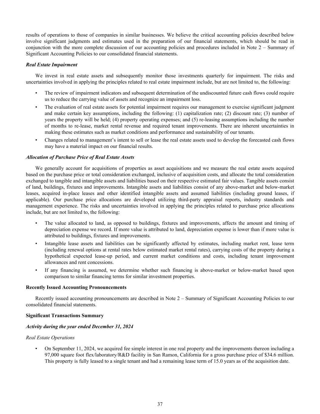 results of operations to those of companies in similar businesses. We believe the critical accounting policies described below involve significant judgments and estimates used in the preparation of our financial statements, which should be read in conjunction with the more complete discussion of our accounting policies and procedures included in Note 2 – Summary of Significant Accounting Policies to our consolidated financial statements. Real Estate Impairment We invest in real estate assets and subsequently monitor those investments quarterly for impairment. The risks and uncertainties involved in applying the principles related to real estate impairment include, but are not limited to, the following: • The review of impairment indicators and subsequent determination of the undiscounted future cash flows could require us to reduce the carrying value of assets and recognize an impairment loss. • The evaluation of real estate assets for potential impairment requires our management to exercise significant judgment and make certain key assumptions, including the following: (1) capitalization rate; (2) discount rate; (3) number of years the property will be held; (4) property operating expenses; and (5) re-leasing assumptions including the number of months to re-lease, market rental revenue and required tenant improvements. There are inherent uncertainties in making these estimates such as market conditions and performance and sustainability of our tenants. • Changes related to management’s intent to sell or lease the real estate assets used to develop the forecasted cash flows may have a material impact on our financial results. Allocation of Purchase Price of Real Estate Assets We generally account for acquisitions of properties as asset acquisitions and we measure the real estate assets acquired based on the purchase price or total consideration exchanged, inclusive of acquisition costs, and allocate the total consideration exchanged to tangible and intangible assets and liabilities based on their respective estimated fair values. Tangible assets consist of land, buildings, fixtures and improvements. Intangible assets and liabilities consist of any above-market and below-market leases, acquired in-place leases and other identified intangible assets and assumed liabilities (including ground leases, if applicable). Our purchase price allocations are developed utilizing third-party appraisal reports, industry standards and management experience. The risks and uncertainties involved in applying the principles related to purchase price allocations include, but are not limited to, the following: • The value allocated to land, as opposed to buildings, fixtures and improvements, affects the amount and timing of depreciation expense we record. If more value is attributed to land, depreciation expense is lower than if more value is attributed to buildings, fixtures and improvements. • Intangible lease assets and liabilities can be significantly affected by estimates, including market rent, lease term (including renewal options at rental rates below estimated market rental rates), carrying costs of the property during a hypothetical expected lease-up period, and current market conditions and costs, including tenant improvement allowances and rent concessions. • If any financing is assumed, we determine whether such financing is above-market or below-market based upon comparison to similar financing terms for similar investment properties. Recently Issued Accounting Pronouncements Recently issued accounting pronouncements are described in Note 2 – Summary of Significant Accounting Policies to our consolidated financial statements. Significant Transactions Summary Activity during the year ended December 31, 2024 Real Estate Operations • On September 11, 2024, we acquired fee simple interest in one real property and the improvements thereon including a 97,000 square foot flex/laboratory/R&D facility in San Ramon, California for a gross purchase price of $34.6 million. This property is fully leased to a single tenant and had a remaining lease term of 15.0 years as of the acquisition date. 37