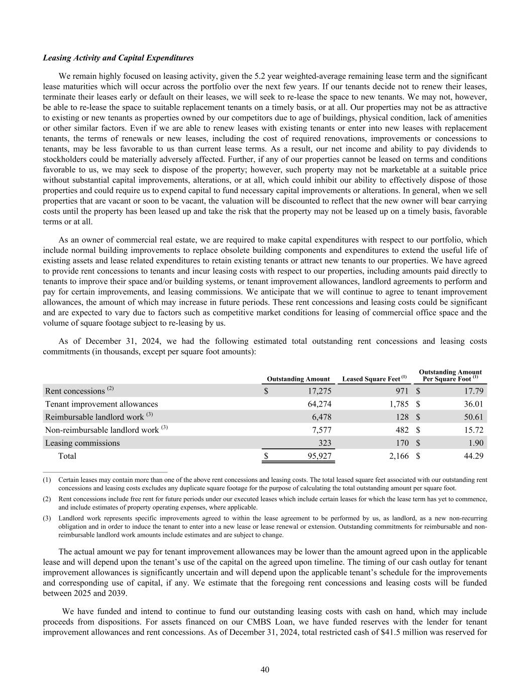 Leasing Activity and Capital Expenditures We remain highly focused on leasing activity, given the 5.2 year weighted-average remaining lease term and the significant lease maturities which will occur across the portfolio over the next few years. If our tenants decide not to renew their leases, terminate their leases early or default on their leases, we will seek to re-lease the space to new tenants. We may not, however, be able to re-lease the space to suitable replacement tenants on a timely basis, or at all. Our properties may not be as attractive to existing or new tenants as properties owned by our competitors due to age of buildings, physical condition, lack of amenities or other similar factors. Even if we are able to renew leases with existing tenants or enter into new leases with replacement tenants, the terms of renewals or new leases, including the cost of required renovations, improvements or concessions to tenants, may be less favorable to us than current lease terms. As a result, our net income and ability to pay dividends to stockholders could be materially adversely affected. Further, if any of our properties cannot be leased on terms and conditions favorable to us, we may seek to dispose of the property; however, such property may not be marketable at a suitable price without substantial capital improvements, alterations, or at all, which could inhibit our ability to effectively dispose of those properties and could require us to expend capital to fund necessary capital improvements or alterations. In general, when we sell properties that are vacant or soon to be vacant, the valuation will be discounted to reflect that the new owner will bear carrying costs until the property has been leased up and take the risk that the property may not be leased up on a timely basis, favorable terms or at all. As an owner of commercial real estate, we are required to make capital expenditures with respect to our portfolio, which include normal building improvements to replace obsolete building components and expenditures to extend the useful life of existing assets and lease related expenditures to retain existing tenants or attract new tenants to our properties. We have agreed to provide rent concessions to tenants and incur leasing costs with respect to our properties, including amounts paid directly to tenants to improve their space and/or building systems, or tenant improvement allowances, landlord agreements to perform and pay for certain improvements, and leasing commissions. We anticipate that we will continue to agree to tenant improvement allowances, the amount of which may increase in future periods. These rent concessions and leasing costs could be significant and are expected to vary due to factors such as competitive market conditions for leasing of commercial office space and the volume of square footage subject to re-leasing by us. As of December 31, 2024, we had the following estimated total outstanding rent concessions and leasing costs commitments (in thousands, except per square foot amounts): Outstanding Amount Leased Square Feet (1) Outstanding Amount Per Square Foot (1) Rent concessions (2) $ 17,275 971 $ 17.79 Tenant improvement allowances 64,274 1,785 $ 36.01 Reimbursable landlord work (3) 6,478 128 $ 50.61 Non-reimbursable landlord work (3) 7,577 482 $ 15.72 Leasing commissions 323 170 $ 1.90 Total $ 95,927 2,166 $ 44.29 ____________________________________ (1) Certain leases may contain more than one of the above rent concessions and leasing costs. The total leased square feet associated with our outstanding rent concessions and leasing costs excludes any duplicate square footage for the purpose of calculating the total outstanding amount per square foot. (2) Rent concessions include free rent for future periods under our executed leases which include certain leases for which the lease term has yet to commence, and include estimates of property operating expenses, where applicable. (3) Landlord work represents specific improvements agreed to within the lease agreement to be performed by us, as landlord, as a new non-recurring obligation and in order to induce the tenant to enter into a new lease or lease renewal or extension. Outstanding commitments for reimbursable and non- reimbursable landlord work amounts include estimates and are subject to change. The actual amount we pay for tenant improvement allowances may be lower than the amount agreed upon in the applicable lease and will depend upon the tenant’s use of the capital on the agreed upon timeline. The timing of our cash outlay for tenant improvement allowances is significantly uncertain and will depend upon the applicable tenant’s schedule for the improvements and corresponding use of capital, if any. We estimate that the foregoing rent concessions and leasing costs will be funded between 2025 and 2039. We have funded and intend to continue to fund our outstanding leasing costs with cash on hand, which may include proceeds from dispositions. For assets financed on our CMBS Loan, we have funded reserves with the lender for tenant improvement allowances and rent concessions. As of December 31, 2024, total restricted cash of $41.5 million was reserved for 40