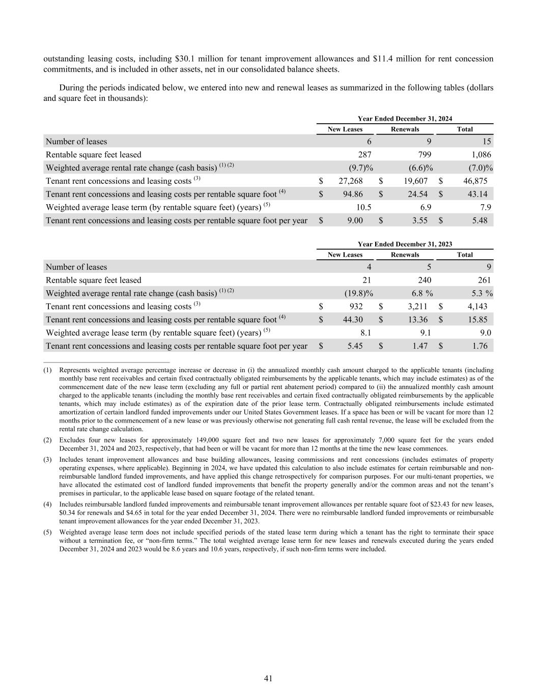 outstanding leasing costs, including $30.1 million for tenant improvement allowances and $11.4 million for rent concession commitments, and is included in other assets, net in our consolidated balance sheets. During the periods indicated below, we entered into new and renewal leases as summarized in the following tables (dollars and square feet in thousands): Year Ended December 31, 2024 New Leases Renewals Total Number of leases 6 9 15 Rentable square feet leased 287 799 1,086 Weighted average rental rate change (cash basis) (1) (2) (9.7) % (6.6) % (7.0) % Tenant rent concessions and leasing costs (3) $ 27,268 $ 19,607 $ 46,875 Tenant rent concessions and leasing costs per rentable square foot (4) $ 94.86 $ 24.54 $ 43.14 Weighted average lease term (by rentable square feet) (years) (5) 10.5 6.9 7.9 Tenant rent concessions and leasing costs per rentable square foot per year $ 9.00 $ 3.55 $ 5.48 Year Ended December 31, 2023 New Leases Renewals Total Number of leases 4 5 9 Rentable square feet leased 21 240 261 Weighted average rental rate change (cash basis) (1) (2) (19.8) % 6.8 % 5.3 % Tenant rent concessions and leasing costs (3) $ 932 $ 3,211 $ 4,143 Tenant rent concessions and leasing costs per rentable square foot (4) $ 44.30 $ 13.36 $ 15.85 Weighted average lease term (by rentable square feet) (years) (5) 8.1 9.1 9.0 Tenant rent concessions and leasing costs per rentable square foot per year $ 5.45 $ 1.47 $ 1.76 ____________________________________ (1) Represents weighted average percentage increase or decrease in (i) the annualized monthly cash amount charged to the applicable tenants (including monthly base rent receivables and certain fixed contractually obligated reimbursements by the applicable tenants, which may include estimates) as of the commencement date of the new lease term (excluding any full or partial rent abatement period) compared to (ii) the annualized monthly cash amount charged to the applicable tenants (including the monthly base rent receivables and certain fixed contractually obligated reimbursements by the applicable tenants, which may include estimates) as of the expiration date of the prior lease term. Contractually obligated reimbursements include estimated amortization of certain landlord funded improvements under our United States Government leases. If a space has been or will be vacant for more than 12 months prior to the commencement of a new lease or was previously otherwise not generating full cash rental revenue, the lease will be excluded from the rental rate change calculation. (2) Excludes four new leases for approximately 149,000 square feet and two new leases for approximately 7,000 square feet for the years ended December 31, 2024 and 2023, respectively, that had been or will be vacant for more than 12 months at the time the new lease commences. (3) Includes tenant improvement allowances and base building allowances, leasing commissions and rent concessions (includes estimates of property operating expenses, where applicable). Beginning in 2024, we have updated this calculation to also include estimates for certain reimbursable and non- reimbursable landlord funded improvements, and have applied this change retrospectively for comparison purposes. For our multi-tenant properties, we have allocated the estimated cost of landlord funded improvements that benefit the property generally and/or the common areas and not the tenant’s premises in particular, to the applicable lease based on square footage of the related tenant. (4) Includes reimbursable landlord funded improvements and reimbursable tenant improvement allowances per rentable square foot of $23.43 for new leases, $0.34 for renewals and $4.65 in total for the year ended December 31, 2024. There were no reimbursable landlord funded improvements or reimbursable tenant improvement allowances for the year ended December 31, 2023. (5) Weighted average lease term does not include specified periods of the stated lease term during which a tenant has the right to terminate their space without a termination fee, or “non-firm terms.” The total weighted average lease term for new leases and renewals executed during the years ended December 31, 2024 and 2023 would be 8.6 years and 10.6 years, respectively, if such non-firm terms were included. 41