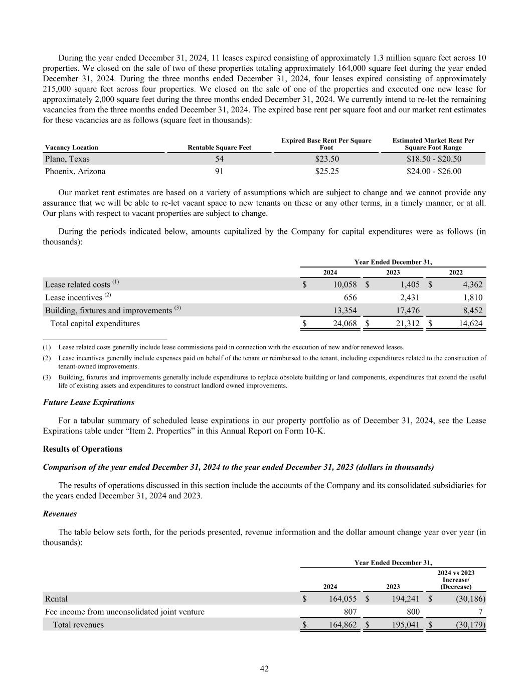 During the year ended December 31, 2024, 11 leases expired consisting of approximately 1.3 million square feet across 10 properties. We closed on the sale of two of these properties totaling approximately 164,000 square feet during the year ended December 31, 2024. During the three months ended December 31, 2024, four leases expired consisting of approximately 215,000 square feet across four properties. We closed on the sale of one of the properties and executed one new lease for approximately 2,000 square feet during the three months ended December 31, 2024. We currently intend to re-let the remaining vacancies from the three months ended December 31, 2024. The expired base rent per square foot and our market rent estimates for these vacancies are as follows (square feet in thousands): Vacancy Location Rentable Square Feet Expired Base Rent Per Square Foot Estimated Market Rent Per Square Foot Range Plano, Texas 54 $23.50 $18.50 - $20.50 Phoenix, Arizona 91 $25.25 $24.00 - $26.00 Our market rent estimates are based on a variety of assumptions which are subject to change and we cannot provide any assurance that we will be able to re-let vacant space to new tenants on these or any other terms, in a timely manner, or at all. Our plans with respect to vacant properties are subject to change. During the periods indicated below, amounts capitalized by the Company for capital expenditures were as follows (in thousands): Year Ended December 31, 2024 2023 2022 Lease related costs (1) $ 10,058 $ 1,405 $ 4,362 Lease incentives (2) 656 2,431 1,810 Building, fixtures and improvements (3) 13,354 17,476 8,452 Total capital expenditures $ 24,068 $ 21,312 $ 14,624 ____________________________________ (1) Lease related costs generally include lease commissions paid in connection with the execution of new and/or renewed leases. (2) Lease incentives generally include expenses paid on behalf of the tenant or reimbursed to the tenant, including expenditures related to the construction of tenant-owned improvements. (3) Building, fixtures and improvements generally include expenditures to replace obsolete building or land components, expenditures that extend the useful life of existing assets and expenditures to construct landlord owned improvements. Future Lease Expirations For a tabular summary of scheduled lease expirations in our property portfolio as of December 31, 2024, see the Lease Expirations table under “Item 2. Properties” in this Annual Report on Form 10-K. Results of Operations Comparison of the year ended December 31, 2024 to the year ended December 31, 2023 (dollars in thousands) The results of operations discussed in this section include the accounts of the Company and its consolidated subsidiaries for the years ended December 31, 2024 and 2023. Revenues The table below sets forth, for the periods presented, revenue information and the dollar amount change year over year (in thousands): 2024 2023 2024 vs 2023 Increase/ (Decrease) Rental $ 164,055 $ 194,241 $ (30,186) Fee income from unconsolidated joint venture 807 800 7 Total revenues $ 164,862 $ 195,041 $ (30,179) Year Ended December 31, 42