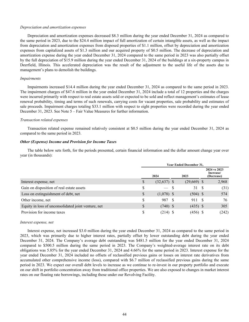 Depreciation and amortization expenses Depreciation and amortization expenses decreased $8.3 million during the year ended December 31, 2024 as compared to the same period in 2023, due to the $24.4 million impact of full amortization of certain intangible assets, as well as the impact from depreciation and amortization expenses from disposed properties of $1.1 million, offset by depreciation and amortization expenses from capitalized assets of $1.3 million and our acquired property of $0.5 million. The decrease of depreciation and amortization expense during the year ended December 31, 2024 compared to the same period in 2023 was also partially offset by the full depreciation of $15.9 million during the year ended December 31, 2024 of the buildings at a six-property campus in Deerfield, Illinois. This accelerated depreciation was the result of the adjustment to the useful life of the assets due to management’s plans to demolish the buildings. Impairments Impairments increased $14.4 million during the year ended December 31, 2024 as compared to the same period in 2023. The impairment charges of $47.6 million in the year ended December 31, 2024 include a total of 12 properties and the charges were incurred primarily with respect to real estate assets sold or expected to be sold and reflect management’s estimates of lease renewal probability, timing and terms of such renewals, carrying costs for vacant properties, sale probability and estimates of sale proceeds. Impairment charges totaling $33.1 million with respect to eight properties were recorded during the year ended December 31, 2023. See Note 5 – Fair Value Measures for further information. Transaction related expenses Transaction related expense remained relatively consistent at $0.5 million during the year ended December 31, 2024 as compared to the same period in 2023. Other (Expense) Income and Provision for Income Taxes The table below sets forth, for the periods presented, certain financial information and the dollar amount change year over year (in thousands): 2024 2023 2024 vs 2023 Increase/ (Decrease) Interest expense, net $ (32,637) $ (29,669) $ 2,968 Gain on disposition of real estate assets $ — $ 31 $ (31) Loss on extinguishment of debt, net $ (1,078) $ (504) $ 574 Other income, net $ 987 $ 911 $ 76 Equity in loss of unconsolidated joint venture, net $ (740) $ (435) $ 305 Provision for income taxes $ (214) $ (456) $ (242) Year Ended December 31, Interest expense, net Interest expense, net increased $3.0 million during the year ended December 31, 2024 as compared to the same period in 2023, which was primarily due to higher interest rates, partially offset by lower outstanding debt during the year ended December 31, 2024. The Company’s average debt outstanding was $481.5 million for the year ended December 31, 2024 compared to $500.5 million during the same period in 2023. The Company’s weighted-average interest rate on its debt obligations was 5.85% for the year ended December 31, 2024 and 4.66% for the same period in 2023. Interest expense for the year ended December 31, 2024 included no offsets of reclassified previous gains or losses on interest rate derivatives from accumulated other comprehensive income (loss), compared with $6.7 million of reclassified previous gains during the same period in 2023. We expect our overall debt levels to increase as we continue to re-invest in our property portfolio and execute on our shift in portfolio concentration away from traditional office properties. We are also exposed to changes in market interest rates on our floating rate borrowings, including those under our Revolving Facility. 44