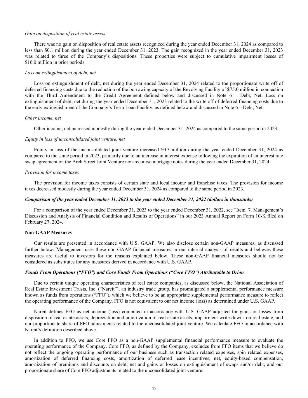 Gain on disposition of real estate assets There was no gain on disposition of real estate assets recognized during the year ended December 31, 2024 as compared to less than $0.1 million during the year ended December 31, 2023. The gain recognized in the year ended December 31, 2023 was related to three of the Company’s dispositions. These properties were subject to cumulative impairment losses of $16.0 million in prior periods. Loss on extinguishment of debt, net Loss on extinguishment of debt, net during the year ended December 31, 2024 related to the proportionate write off of deferred financing costs due to the reduction of the borrowing capacity of the Revolving Facility of $75.0 million in connection with the Third Amendment to the Credit Agreement defined below and discussed in Note 6 – Debt, Net. Loss on extinguishment of debt, net during the year ended December 31, 2023 related to the write off of deferred financing costs due to the early extinguishment of the Company’s Term Loan Facility, as defined below and discussed in Note 6 – Debt, Net. Other income, net Other income, net increased modestly during the year ended December 31, 2024 as compared to the same period in 2023. Equity in loss of unconsolidated joint venture, net Equity in loss of the unconsolidated joint venture increased $0.3 million during the year ended December 31, 2024 as compared to the same period in 2023, primarily due to an increase in interest expense following the expiration of an interest rate swap agreement on the Arch Street Joint Venture non-recourse mortgage notes during the year ended December 31, 2024. Provision for income taxes The provision for income taxes consists of certain state and local income and franchise taxes. The provision for income taxes decreased modestly during the year ended December 31, 2024 as compared to the same period in 2023. Comparison of the year ended December 31, 2023 to the year ended December 31, 2022 (dollars in thousands) For a comparison of the year ended December 31, 2023 to the year ended December 31, 2022, see “Item. 7. Management’s Discussion and Analysis of Financial Condition and Results of Operations” in our 2023 Annual Report on Form 10-K filed on February 27, 2024. Non-GAAP Measures Our results are presented in accordance with U.S. GAAP. We also disclose certain non-GAAP measures, as discussed further below. Management uses these non-GAAP financial measures in our internal analysis of results and believes these measures are useful to investors for the reasons explained below. These non-GAAP financial measures should not be considered as substitutes for any measures derived in accordance with U.S. GAAP. Funds From Operations (“FFO”) and Core Funds From Operations (“Core FFO”) Attributable to Orion Due to certain unique operating characteristics of real estate companies, as discussed below, the National Association of Real Estate Investment Trusts, Inc. (“Nareit”), an industry trade group, has promulgated a supplemental performance measure known as funds from operations (“FFO”), which we believe to be an appropriate supplemental performance measure to reflect the operating performance of the Company. FFO is not equivalent to our net income (loss) as determined under U.S. GAAP. Nareit defines FFO as net income (loss) computed in accordance with U.S. GAAP adjusted for gains or losses from disposition of real estate assets, depreciation and amortization of real estate assets, impairment write-downs on real estate, and our proportionate share of FFO adjustments related to the unconsolidated joint venture. We calculate FFO in accordance with Nareit’s definition described above. In addition to FFO, we use Core FFO as a non-GAAP supplemental financial performance measure to evaluate the operating performance of the Company. Core FFO, as defined by the Company, excludes from FFO items that we believe do not reflect the ongoing operating performance of our business such as transaction related expenses, spin related expenses, amortization of deferred financing costs, amortization of deferred lease incentives, net, equity-based compensation, amortization of premiums and discounts on debt, net and gains or losses on extinguishment of swaps and/or debt, and our proportionate share of Core FFO adjustments related to the unconsolidated joint venture. 45