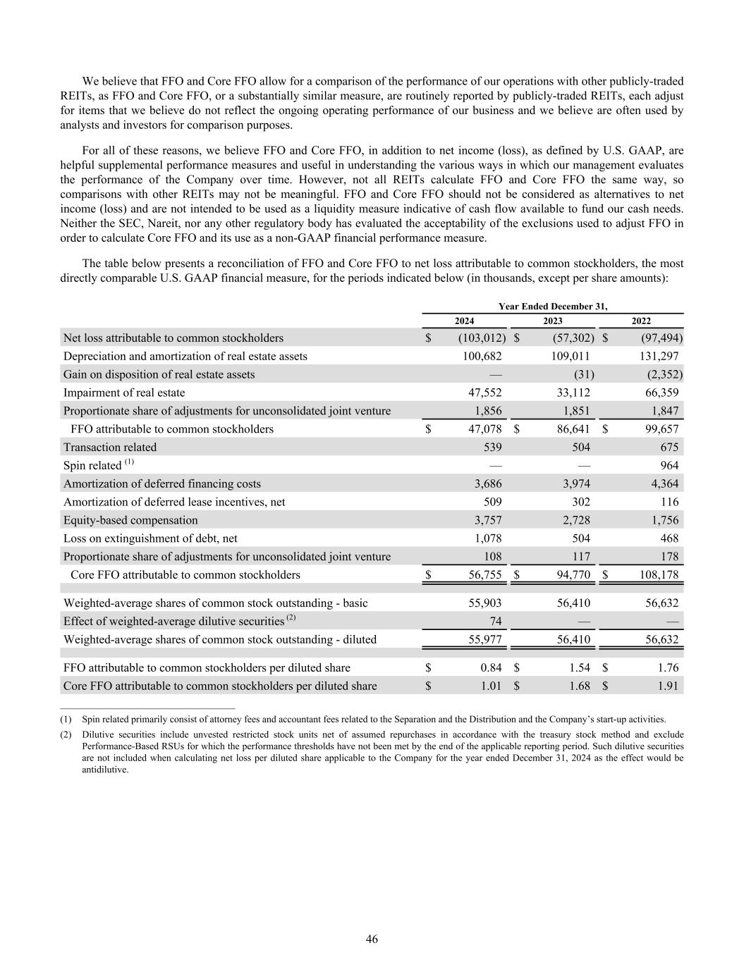 We believe that FFO and Core FFO allow for a comparison of the performance of our operations with other publicly-traded REITs, as FFO and Core FFO, or a substantially similar measure, are routinely reported by publicly-traded REITs, each adjust for items that we believe do not reflect the ongoing operating performance of our business and we believe are often used by analysts and investors for comparison purposes. For all of these reasons, we believe FFO and Core FFO, in addition to net income (loss), as defined by U.S. GAAP, are helpful supplemental performance measures and useful in understanding the various ways in which our management evaluates the performance of the Company over time. However, not all REITs calculate FFO and Core FFO the same way, so comparisons with other REITs may not be meaningful. FFO and Core FFO should not be considered as alternatives to net income (loss) and are not intended to be used as a liquidity measure indicative of cash flow available to fund our cash needs. Neither the SEC, Nareit, nor any other regulatory body has evaluated the acceptability of the exclusions used to adjust FFO in order to calculate Core FFO and its use as a non-GAAP financial performance measure. The table below presents a reconciliation of FFO and Core FFO to net loss attributable to common stockholders, the most directly comparable U.S. GAAP financial measure, for the periods indicated below (in thousands, except per share amounts): Year Ended December 31, 2024 2023 2022 Net loss attributable to common stockholders $ (103,012) $ (57,302) $ (97,494) Depreciation and amortization of real estate assets 100,682 109,011 131,297 Gain on disposition of real estate assets — (31) (2,352) Impairment of real estate 47,552 33,112 66,359 Proportionate share of adjustments for unconsolidated joint venture 1,856 1,851 1,847 FFO attributable to common stockholders $ 47,078 $ 86,641 $ 99,657 Transaction related 539 504 675 Spin related (1) — — 964 Amortization of deferred financing costs 3,686 3,974 4,364 Amortization of deferred lease incentives, net 509 302 116 Equity-based compensation 3,757 2,728 1,756 Loss on extinguishment of debt, net 1,078 504 468 Proportionate share of adjustments for unconsolidated joint venture 108 117 178 Core FFO attributable to common stockholders $ 56,755 $ 94,770 $ 108,178 Weighted-average shares of common stock outstanding - basic 55,903 56,410 56,632 Effect of weighted-average dilutive securities (2) 74 — — Weighted-average shares of common stock outstanding - diluted 55,977 56,410 56,632 FFO attributable to common stockholders per diluted share $ 0.84 $ 1.54 $ 1.76 Core FFO attributable to common stockholders per diluted share $ 1.01 $ 1.68 $ 1.91 ____________________________________ (1) Spin related primarily consist of attorney fees and accountant fees related to the Separation and the Distribution and the Company’s start-up activities. (2) Dilutive securities include unvested restricted stock units net of assumed repurchases in accordance with the treasury stock method and exclude Performance-Based RSUs for which the performance thresholds have not been met by the end of the applicable reporting period. Such dilutive securities are not included when calculating net loss per diluted share applicable to the Company for the year ended December 31, 2024 as the effect would be antidilutive. 46