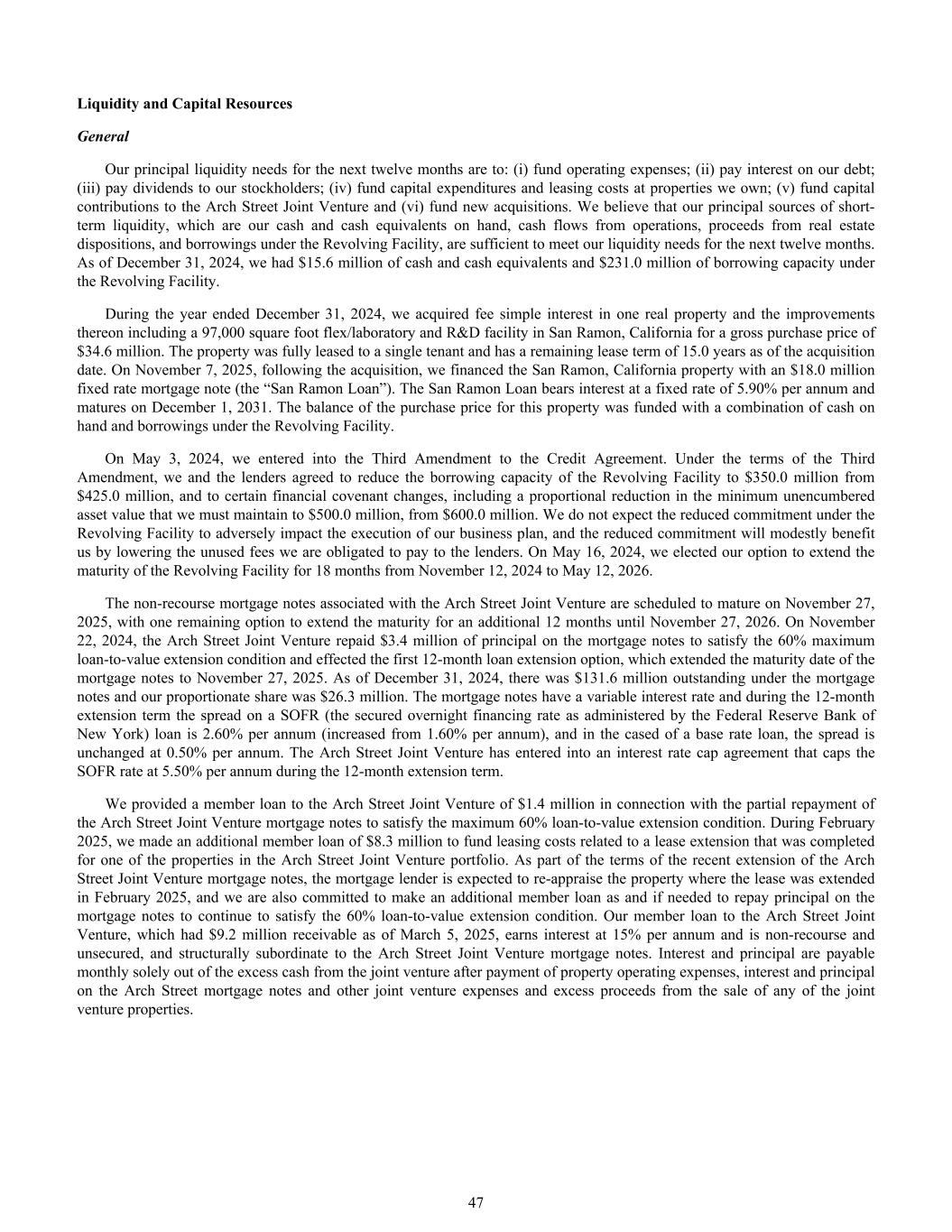 Liquidity and Capital Resources General Our principal liquidity needs for the next twelve months are to: (i) fund operating expenses; (ii) pay interest on our debt; (iii) pay dividends to our stockholders; (iv) fund capital expenditures and leasing costs at properties we own; (v) fund capital contributions to the Arch Street Joint Venture and (vi) fund new acquisitions. We believe that our principal sources of short- term liquidity, which are our cash and cash equivalents on hand, cash flows from operations, proceeds from real estate dispositions, and borrowings under the Revolving Facility, are sufficient to meet our liquidity needs for the next twelve months. As of December 31, 2024, we had $15.6 million of cash and cash equivalents and $231.0 million of borrowing capacity under the Revolving Facility. During the year ended December 31, 2024, we acquired fee simple interest in one real property and the improvements thereon including a 97,000 square foot flex/laboratory and R&D facility in San Ramon, California for a gross purchase price of $34.6 million. The property was fully leased to a single tenant and has a remaining lease term of 15.0 years as of the acquisition date. On November 7, 2025, following the acquisition, we financed the San Ramon, California property with an $18.0 million fixed rate mortgage note (the “San Ramon Loan”). The San Ramon Loan bears interest at a fixed rate of 5.90% per annum and matures on December 1, 2031. The balance of the purchase price for this property was funded with a combination of cash on hand and borrowings under the Revolving Facility. On May 3, 2024, we entered into the Third Amendment to the Credit Agreement. Under the terms of the Third Amendment, we and the lenders agreed to reduce the borrowing capacity of the Revolving Facility to $350.0 million from $425.0 million, and to certain financial covenant changes, including a proportional reduction in the minimum unencumbered asset value that we must maintain to $500.0 million, from $600.0 million. We do not expect the reduced commitment under the Revolving Facility to adversely impact the execution of our business plan, and the reduced commitment will modestly benefit us by lowering the unused fees we are obligated to pay to the lenders. On May 16, 2024, we elected our option to extend the maturity of the Revolving Facility for 18 months from November 12, 2024 to May 12, 2026. The non-recourse mortgage notes associated with the Arch Street Joint Venture are scheduled to mature on November 27, 2025, with one remaining option to extend the maturity for an additional 12 months until November 27, 2026. On November 22, 2024, the Arch Street Joint Venture repaid $3.4 million of principal on the mortgage notes to satisfy the 60% maximum loan-to-value extension condition and effected the first 12-month loan extension option, which extended the maturity date of the mortgage notes to November 27, 2025. As of December 31, 2024, there was $131.6 million outstanding under the mortgage notes and our proportionate share was $26.3 million. The mortgage notes have a variable interest rate and during the 12-month extension term the spread on a SOFR (the secured overnight financing rate as administered by the Federal Reserve Bank of New York) loan is 2.60% per annum (increased from 1.60% per annum), and in the cased of a base rate loan, the spread is unchanged at 0.50% per annum. The Arch Street Joint Venture has entered into an interest rate cap agreement that caps the SOFR rate at 5.50% per annum during the 12-month extension term. We provided a member loan to the Arch Street Joint Venture of $1.4 million in connection with the partial repayment of the Arch Street Joint Venture mortgage notes to satisfy the maximum 60% loan-to-value extension condition. During February 2025, we made an additional member loan of $8.3 million to fund leasing costs related to a lease extension that was completed for one of the properties in the Arch Street Joint Venture portfolio. As part of the terms of the recent extension of the Arch Street Joint Venture mortgage notes, the mortgage lender is expected to re-appraise the property where the lease was extended in February 2025, and we are also committed to make an additional member loan as and if needed to repay principal on the mortgage notes to continue to satisfy the 60% loan-to-value extension condition. Our member loan to the Arch Street Joint Venture, which had $9.2 million receivable as of March 5, 2025, earns interest at 15% per annum and is non-recourse and unsecured, and structurally subordinate to the Arch Street Joint Venture mortgage notes. Interest and principal are payable monthly solely out of the excess cash from the joint venture after payment of property operating expenses, interest and principal on the Arch Street mortgage notes and other joint venture expenses and excess proceeds from the sale of any of the joint venture properties. 47