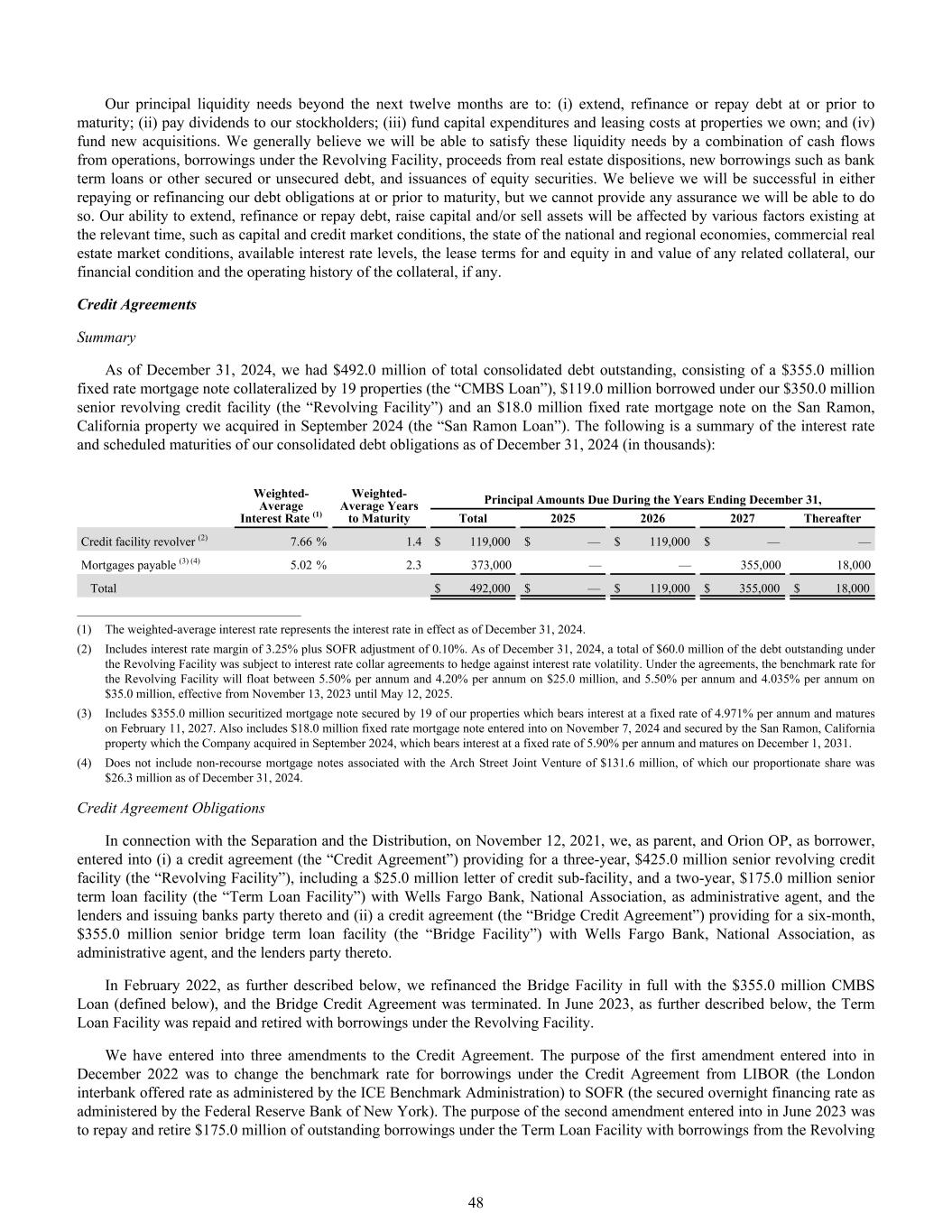 Our principal liquidity needs beyond the next twelve months are to: (i) extend, refinance or repay debt at or prior to maturity; (ii) pay dividends to our stockholders; (iii) fund capital expenditures and leasing costs at properties we own; and (iv) fund new acquisitions. We generally believe we will be able to satisfy these liquidity needs by a combination of cash flows from operations, borrowings under the Revolving Facility, proceeds from real estate dispositions, new borrowings such as bank term loans or other secured or unsecured debt, and issuances of equity securities. We believe we will be successful in either repaying or refinancing our debt obligations at or prior to maturity, but we cannot provide any assurance we will be able to do so. Our ability to extend, refinance or repay debt, raise capital and/or sell assets will be affected by various factors existing at the relevant time, such as capital and credit market conditions, the state of the national and regional economies, commercial real estate market conditions, available interest rate levels, the lease terms for and equity in and value of any related collateral, our financial condition and the operating history of the collateral, if any. Credit Agreements Summary As of December 31, 2024, we had $492.0 million of total consolidated debt outstanding, consisting of a $355.0 million fixed rate mortgage note collateralized by 19 properties (the “CMBS Loan”), $119.0 million borrowed under our $350.0 million senior revolving credit facility (the “Revolving Facility”) and an $18.0 million fixed rate mortgage note on the San Ramon, California property we acquired in September 2024 (the “San Ramon Loan”). The following is a summary of the interest rate and scheduled maturities of our consolidated debt obligations as of December 31, 2024 (in thousands): Weighted- Average Interest Rate (1) Weighted- Average Years to Maturity Principal Amounts Due During the Years Ending December 31, Total 2025 2026 2027 Thereafter Credit facility revolver (2) 7.66 % 1.4 $ 119,000 $ — $ 119,000 $ — — Mortgages payable (3) (4) 5.02 % 2.3 373,000 — — 355,000 18,000 Total $ 492,000 $ — $ 119,000 $ 355,000 $ 18,000 ____________________________________ (1) The weighted-average interest rate represents the interest rate in effect as of December 31, 2024. (2) Includes interest rate margin of 3.25% plus SOFR adjustment of 0.10%. As of December 31, 2024, a total of $60.0 million of the debt outstanding under the Revolving Facility was subject to interest rate collar agreements to hedge against interest rate volatility. Under the agreements, the benchmark rate for the Revolving Facility will float between 5.50% per annum and 4.20% per annum on $25.0 million, and 5.50% per annum and 4.035% per annum on $35.0 million, effective from November 13, 2023 until May 12, 2025. (3) Includes $355.0 million securitized mortgage note secured by 19 of our properties which bears interest at a fixed rate of 4.971% per annum and matures on February 11, 2027. Also includes $18.0 million fixed rate mortgage note entered into on November 7, 2024 and secured by the San Ramon, California property which the Company acquired in September 2024, which bears interest at a fixed rate of 5.90% per annum and matures on December 1, 2031. (4) Does not include non-recourse mortgage notes associated with the Arch Street Joint Venture of $131.6 million, of which our proportionate share was $26.3 million as of December 31, 2024. Credit Agreement Obligations In connection with the Separation and the Distribution, on November 12, 2021, we, as parent, and Orion OP, as borrower, entered into (i) a credit agreement (the “Credit Agreement”) providing for a three-year, $425.0 million senior revolving credit facility (the “Revolving Facility”), including a $25.0 million letter of credit sub-facility, and a two-year, $175.0 million senior term loan facility (the “Term Loan Facility”) with Wells Fargo Bank, National Association, as administrative agent, and the lenders and issuing banks party thereto and (ii) a credit agreement (the “Bridge Credit Agreement”) providing for a six-month, $355.0 million senior bridge term loan facility (the “Bridge Facility”) with Wells Fargo Bank, National Association, as administrative agent, and the lenders party thereto. In February 2022, as further described below, we refinanced the Bridge Facility in full with the $355.0 million CMBS Loan (defined below), and the Bridge Credit Agreement was terminated. In June 2023, as further described below, the Term Loan Facility was repaid and retired with borrowings under the Revolving Facility. We have entered into three amendments to the Credit Agreement. The purpose of the first amendment entered into in December 2022 was to change the benchmark rate for borrowings under the Credit Agreement from LIBOR (the London interbank offered rate as administered by the ICE Benchmark Administration) to SOFR (the secured overnight financing rate as administered by the Federal Reserve Bank of New York). The purpose of the second amendment entered into in June 2023 was to repay and retire $175.0 million of outstanding borrowings under the Term Loan Facility with borrowings from the Revolving 48