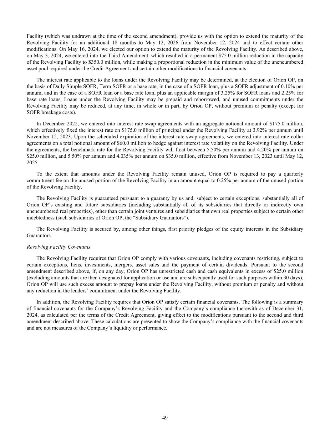 Facility (which was undrawn at the time of the second amendment), provide us with the option to extend the maturity of the Revolving Facility for an additional 18 months to May 12, 2026 from November 12, 2024 and to effect certain other modifications. On May 16, 2024, we elected our option to extend the maturity of the Revolving Facility. As described above, on May 3, 2024, we entered into the Third Amendment, which resulted in a permanent $75.0 million reduction in the capacity of the Revolving Facility to $350.0 million, while making a proportional reduction in the minimum value of the unencumbered asset pool required under the Credit Agreement and certain other modifications to financial covenants. The interest rate applicable to the loans under the Revolving Facility may be determined, at the election of Orion OP, on the basis of Daily Simple SOFR, Term SOFR or a base rate, in the case of a SOFR loan, plus a SOFR adjustment of 0.10% per annum, and in the case of a SOFR loan or a base rate loan, plus an applicable margin of 3.25% for SOFR loans and 2.25% for base rate loans. Loans under the Revolving Facility may be prepaid and reborrowed, and unused commitments under the Revolving Facility may be reduced, at any time, in whole or in part, by Orion OP, without premium or penalty (except for SOFR breakage costs). In December 2022, we entered into interest rate swap agreements with an aggregate notional amount of $175.0 million, which effectively fixed the interest rate on $175.0 million of principal under the Revolving Facility at 3.92% per annum until November 12, 2023. Upon the scheduled expiration of the interest rate swap agreements, we entered into interest rate collar agreements on a total notional amount of $60.0 million to hedge against interest rate volatility on the Revolving Facility. Under the agreements, the benchmark rate for the Revolving Facility will float between 5.50% per annum and 4.20% per annum on $25.0 million, and 5.50% per annum and 4.035% per annum on $35.0 million, effective from November 13, 2023 until May 12, 2025. To the extent that amounts under the Revolving Facility remain unused, Orion OP is required to pay a quarterly commitment fee on the unused portion of the Revolving Facility in an amount equal to 0.25% per annum of the unused portion of the Revolving Facility. The Revolving Facility is guaranteed pursuant to a guaranty by us and, subject to certain exceptions, substantially all of Orion OP’s existing and future subsidiaries (including substantially all of its subsidiaries that directly or indirectly own unencumbered real properties), other than certain joint ventures and subsidiaries that own real properties subject to certain other indebtedness (such subsidiaries of Orion OP, the “Subsidiary Guarantors”). The Revolving Facility is secured by, among other things, first priority pledges of the equity interests in the Subsidiary Guarantors. Revolving Facility Covenants The Revolving Facility requires that Orion OP comply with various covenants, including covenants restricting, subject to certain exceptions, liens, investments, mergers, asset sales and the payment of certain dividends. Pursuant to the second amendment described above, if, on any day, Orion OP has unrestricted cash and cash equivalents in excess of $25.0 million (excluding amounts that are then designated for application or use and are subsequently used for such purposes within 30 days), Orion OP will use such excess amount to prepay loans under the Revolving Facility, without premium or penalty and without any reduction in the lenders’ commitment under the Revolving Facility. In addition, the Revolving Facility requires that Orion OP satisfy certain financial covenants. The following is a summary of financial covenants for the Company’s Revolving Facility and the Company’s compliance therewith as of December 31, 2024, as calculated per the terms of the Credit Agreement, giving effect to the modifications pursuant to the second and third amendment described above. These calculations are presented to show the Company’s compliance with the financial covenants and are not measures of the Company’s liquidity or performance. 49