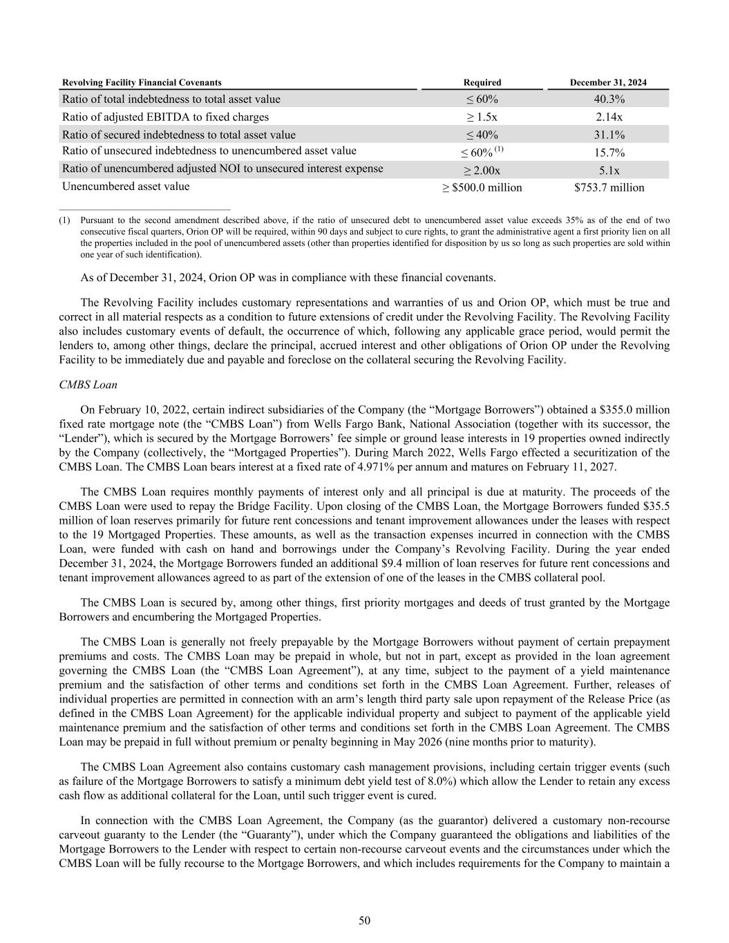 Revolving Facility Financial Covenants Required December 31, 2024 Ratio of total indebtedness to total asset value ≤ 60% 40.3% Ratio of adjusted EBITDA to fixed charges ≥ 1.5x 2.14x Ratio of secured indebtedness to total asset value ≤ 40% 31.1% Ratio of unsecured indebtedness to unencumbered asset value ≤ 60% (1) 15.7% Ratio of unencumbered adjusted NOI to unsecured interest expense ≥ 2.00x 5.1x Unencumbered asset value ≥ $500.0 million $753.7 million ____________________________________ (1) Pursuant to the second amendment described above, if the ratio of unsecured debt to unencumbered asset value exceeds 35% as of the end of two consecutive fiscal quarters, Orion OP will be required, within 90 days and subject to cure rights, to grant the administrative agent a first priority lien on all the properties included in the pool of unencumbered assets (other than properties identified for disposition by us so long as such properties are sold within one year of such identification). As of December 31, 2024, Orion OP was in compliance with these financial covenants. The Revolving Facility includes customary representations and warranties of us and Orion OP, which must be true and correct in all material respects as a condition to future extensions of credit under the Revolving Facility. The Revolving Facility also includes customary events of default, the occurrence of which, following any applicable grace period, would permit the lenders to, among other things, declare the principal, accrued interest and other obligations of Orion OP under the Revolving Facility to be immediately due and payable and foreclose on the collateral securing the Revolving Facility. CMBS Loan On February 10, 2022, certain indirect subsidiaries of the Company (the “Mortgage Borrowers”) obtained a $355.0 million fixed rate mortgage note (the “CMBS Loan”) from Wells Fargo Bank, National Association (together with its successor, the “Lender”), which is secured by the Mortgage Borrowers’ fee simple or ground lease interests in 19 properties owned indirectly by the Company (collectively, the “Mortgaged Properties”). During March 2022, Wells Fargo effected a securitization of the CMBS Loan. The CMBS Loan bears interest at a fixed rate of 4.971% per annum and matures on February 11, 2027. The CMBS Loan requires monthly payments of interest only and all principal is due at maturity. The proceeds of the CMBS Loan were used to repay the Bridge Facility. Upon closing of the CMBS Loan, the Mortgage Borrowers funded $35.5 million of loan reserves primarily for future rent concessions and tenant improvement allowances under the leases with respect to the 19 Mortgaged Properties. These amounts, as well as the transaction expenses incurred in connection with the CMBS Loan, were funded with cash on hand and borrowings under the Company’s Revolving Facility. During the year ended December 31, 2024, the Mortgage Borrowers funded an additional $9.4 million of loan reserves for future rent concessions and tenant improvement allowances agreed to as part of the extension of one of the leases in the CMBS collateral pool. The CMBS Loan is secured by, among other things, first priority mortgages and deeds of trust granted by the Mortgage Borrowers and encumbering the Mortgaged Properties. The CMBS Loan is generally not freely prepayable by the Mortgage Borrowers without payment of certain prepayment premiums and costs. The CMBS Loan may be prepaid in whole, but not in part, except as provided in the loan agreement governing the CMBS Loan (the “CMBS Loan Agreement”), at any time, subject to the payment of a yield maintenance premium and the satisfaction of other terms and conditions set forth in the CMBS Loan Agreement. Further, releases of individual properties are permitted in connection with an arm’s length third party sale upon repayment of the Release Price (as defined in the CMBS Loan Agreement) for the applicable individual property and subject to payment of the applicable yield maintenance premium and the satisfaction of other terms and conditions set forth in the CMBS Loan Agreement. The CMBS Loan may be prepaid in full without premium or penalty beginning in May 2026 (nine months prior to maturity). The CMBS Loan Agreement also contains customary cash management provisions, including certain trigger events (such as failure of the Mortgage Borrowers to satisfy a minimum debt yield test of 8.0%) which allow the Lender to retain any excess cash flow as additional collateral for the Loan, until such trigger event is cured. In connection with the CMBS Loan Agreement, the Company (as the guarantor) delivered a customary non-recourse carveout guaranty to the Lender (the “Guaranty”), under which the Company guaranteed the obligations and liabilities of the Mortgage Borrowers to the Lender with respect to certain non-recourse carveout events and the circumstances under which the CMBS Loan will be fully recourse to the Mortgage Borrowers, and which includes requirements for the Company to maintain a 50