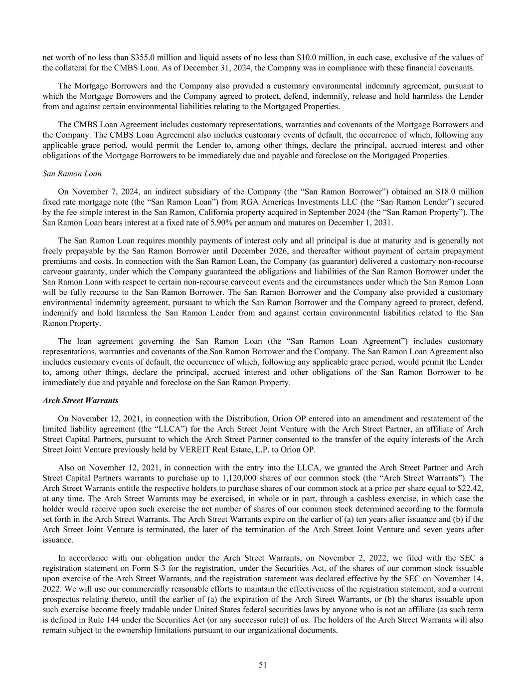 net worth of no less than $355.0 million and liquid assets of no less than $10.0 million, in each case, exclusive of the values of the collateral for the CMBS Loan. As of December 31, 2024, the Company was in compliance with these financial covenants. The Mortgage Borrowers and the Company also provided a customary environmental indemnity agreement, pursuant to which the Mortgage Borrowers and the Company agreed to protect, defend, indemnify, release and hold harmless the Lender from and against certain environmental liabilities relating to the Mortgaged Properties. The CMBS Loan Agreement includes customary representations, warranties and covenants of the Mortgage Borrowers and the Company. The CMBS Loan Agreement also includes customary events of default, the occurrence of which, following any applicable grace period, would permit the Lender to, among other things, declare the principal, accrued interest and other obligations of the Mortgage Borrowers to be immediately due and payable and foreclose on the Mortgaged Properties. San Ramon Loan On November 7, 2024, an indirect subsidiary of the Company (the “San Ramon Borrower”) obtained an $18.0 million fixed rate mortgage note (the “San Ramon Loan”) from RGA Americas Investments LLC (the “San Ramon Lender”) secured by the fee simple interest in the San Ramon, California property acquired in September 2024 (the “San Ramon Property”). The San Ramon Loan bears interest at a fixed rate of 5.90% per annum and matures on December 1, 2031. The San Ramon Loan requires monthly payments of interest only and all principal is due at maturity and is generally not freely prepayable by the San Ramon Borrower until December 2026, and thereafter without payment of certain prepayment premiums and costs. In connection with the San Ramon Loan, the Company (as guarantor) delivered a customary non-recourse carveout guaranty, under which the Company guaranteed the obligations and liabilities of the San Ramon Borrower under the San Ramon Loan with respect to certain non-recourse carveout events and the circumstances under which the San Ramon Loan will be fully recourse to the San Ramon Borrower. The San Ramon Borrower and the Company also provided a customary environmental indemnity agreement, pursuant to which the San Ramon Borrower and the Company agreed to protect, defend, indemnify and hold harmless the San Ramon Lender from and against certain environmental liabilities related to the San Ramon Property. The loan agreement governing the San Ramon Loan (the “San Ramon Loan Agreement”) includes customary representations, warranties and covenants of the San Ramon Borrower and the Company. The San Ramon Loan Agreement also includes customary events of default, the occurrence of which, following any applicable grace period, would permit the Lender to, among other things, declare the principal, accrued interest and other obligations of the San Ramon Borrower to be immediately due and payable and foreclose on the San Ramon Property. Arch Street Warrants On November 12, 2021, in connection with the Distribution, Orion OP entered into an amendment and restatement of the limited liability agreement (the “LLCA”) for the Arch Street Joint Venture with the Arch Street Partner, an affiliate of Arch Street Capital Partners, pursuant to which the Arch Street Partner consented to the transfer of the equity interests of the Arch Street Joint Venture previously held by VEREIT Real Estate, L.P. to Orion OP. Also on November 12, 2021, in connection with the entry into the LLCA, we granted the Arch Street Partner and Arch Street Capital Partners warrants to purchase up to 1,120,000 shares of our common stock (the “Arch Street Warrants”). The Arch Street Warrants entitle the respective holders to purchase shares of our common stock at a price per share equal to $22.42, at any time. The Arch Street Warrants may be exercised, in whole or in part, through a cashless exercise, in which case the holder would receive upon such exercise the net number of shares of our common stock determined according to the formula set forth in the Arch Street Warrants. The Arch Street Warrants expire on the earlier of (a) ten years after issuance and (b) if the Arch Street Joint Venture is terminated, the later of the termination of the Arch Street Joint Venture and seven years after issuance. In accordance with our obligation under the Arch Street Warrants, on November 2, 2022, we filed with the SEC a registration statement on Form S-3 for the registration, under the Securities Act, of the shares of our common stock issuable upon exercise of the Arch Street Warrants, and the registration statement was declared effective by the SEC on November 14, 2022. We will use our commercially reasonable efforts to maintain the effectiveness of the registration statement, and a current prospectus relating thereto, until the earlier of (a) the expiration of the Arch Street Warrants, or (b) the shares issuable upon such exercise become freely tradable under United States federal securities laws by anyone who is not an affiliate (as such term is defined in Rule 144 under the Securities Act (or any successor rule)) of us. The holders of the Arch Street Warrants will also remain subject to the ownership limitations pursuant to our organizational documents. 51