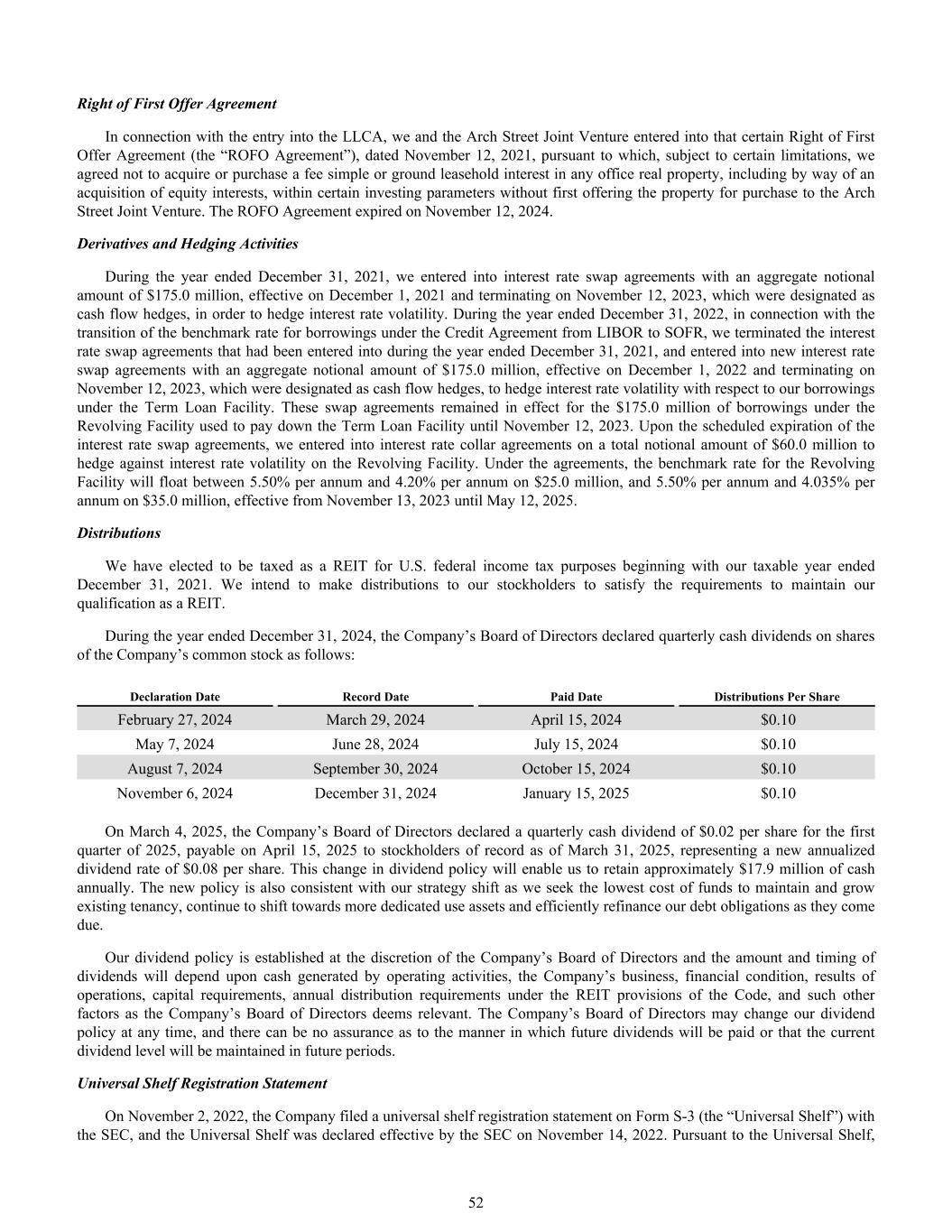 Right of First Offer Agreement In connection with the entry into the LLCA, we and the Arch Street Joint Venture entered into that certain Right of First Offer Agreement (the “ROFO Agreement”), dated November 12, 2021, pursuant to which, subject to certain limitations, we agreed not to acquire or purchase a fee simple or ground leasehold interest in any office real property, including by way of an acquisition of equity interests, within certain investing parameters without first offering the property for purchase to the Arch Street Joint Venture. The ROFO Agreement expired on November 12, 2024. Derivatives and Hedging Activities During the year ended December 31, 2021, we entered into interest rate swap agreements with an aggregate notional amount of $175.0 million, effective on December 1, 2021 and terminating on November 12, 2023, which were designated as cash flow hedges, in order to hedge interest rate volatility. During the year ended December 31, 2022, in connection with the transition of the benchmark rate for borrowings under the Credit Agreement from LIBOR to SOFR, we terminated the interest rate swap agreements that had been entered into during the year ended December 31, 2021, and entered into new interest rate swap agreements with an aggregate notional amount of $175.0 million, effective on December 1, 2022 and terminating on November 12, 2023, which were designated as cash flow hedges, to hedge interest rate volatility with respect to our borrowings under the Term Loan Facility. These swap agreements remained in effect for the $175.0 million of borrowings under the Revolving Facility used to pay down the Term Loan Facility until November 12, 2023. Upon the scheduled expiration of the interest rate swap agreements, we entered into interest rate collar agreements on a total notional amount of $60.0 million to hedge against interest rate volatility on the Revolving Facility. Under the agreements, the benchmark rate for the Revolving Facility will float between 5.50% per annum and 4.20% per annum on $25.0 million, and 5.50% per annum and 4.035% per annum on $35.0 million, effective from November 13, 2023 until May 12, 2025. Distributions We have elected to be taxed as a REIT for U.S. federal income tax purposes beginning with our taxable year ended December 31, 2021. We intend to make distributions to our stockholders to satisfy the requirements to maintain our qualification as a REIT. During the year ended December 31, 2024, the Company’s Board of Directors declared quarterly cash dividends on shares of the Company’s common stock as follows: Declaration Date Record Date Paid Date Distributions Per Share February 27, 2024 March 29, 2024 April 15, 2024 $0.10 May 7, 2024 June 28, 2024 July 15, 2024 $0.10 August 7, 2024 September 30, 2024 October 15, 2024 $0.10 November 6, 2024 December 31, 2024 January 15, 2025 $0.10 On March 4, 2025, the Company’s Board of Directors declared a quarterly cash dividend of $0.02 per share for the first quarter of 2025, payable on April 15, 2025 to stockholders of record as of March 31, 2025, representing a new annualized dividend rate of $0.08 per share. This change in dividend policy will enable us to retain approximately $17.9 million of cash annually. The new policy is also consistent with our strategy shift as we seek the lowest cost of funds to maintain and grow existing tenancy, continue to shift towards more dedicated use assets and efficiently refinance our debt obligations as they come due. Our dividend policy is established at the discretion of the Company’s Board of Directors and the amount and timing of dividends will depend upon cash generated by operating activities, the Company’s business, financial condition, results of operations, capital requirements, annual distribution requirements under the REIT provisions of the Code, and such other factors as the Company’s Board of Directors deems relevant. The Company’s Board of Directors may change our dividend policy at any time, and there can be no assurance as to the manner in which future dividends will be paid or that the current dividend level will be maintained in future periods. Universal Shelf Registration Statement On November 2, 2022, the Company filed a universal shelf registration statement on Form S-3 (the “Universal Shelf”) with the SEC, and the Universal Shelf was declared effective by the SEC on November 14, 2022. Pursuant to the Universal Shelf, 52