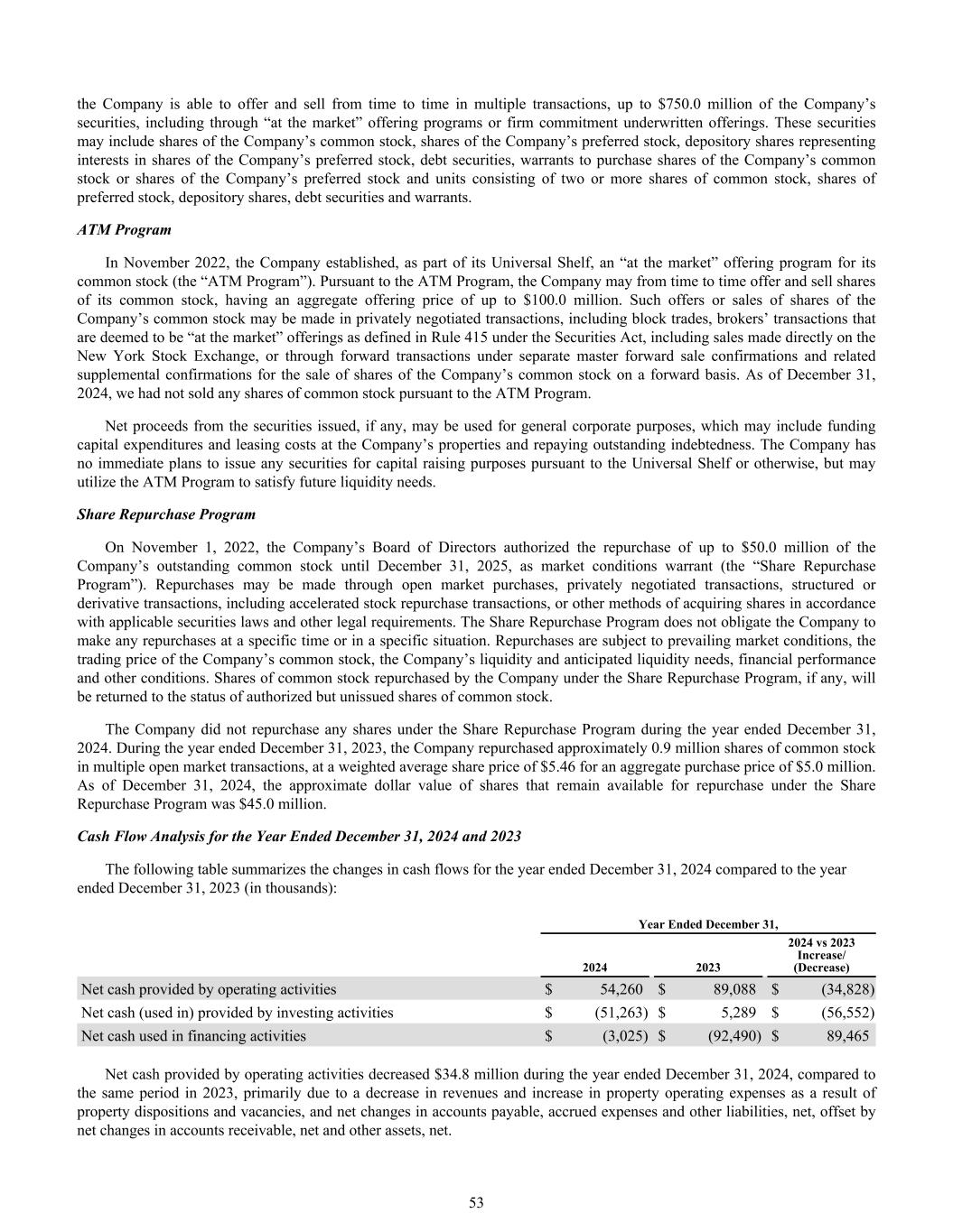 the Company is able to offer and sell from time to time in multiple transactions, up to $750.0 million of the Company’s securities, including through “at the market” offering programs or firm commitment underwritten offerings. These securities may include shares of the Company’s common stock, shares of the Company’s preferred stock, depository shares representing interests in shares of the Company’s preferred stock, debt securities, warrants to purchase shares of the Company’s common stock or shares of the Company’s preferred stock and units consisting of two or more shares of common stock, shares of preferred stock, depository shares, debt securities and warrants. ATM Program In November 2022, the Company established, as part of its Universal Shelf, an “at the market” offering program for its common stock (the “ATM Program”). Pursuant to the ATM Program, the Company may from time to time offer and sell shares of its common stock, having an aggregate offering price of up to $100.0 million. Such offers or sales of shares of the Company’s common stock may be made in privately negotiated transactions, including block trades, brokers’ transactions that are deemed to be “at the market” offerings as defined in Rule 415 under the Securities Act, including sales made directly on the New York Stock Exchange, or through forward transactions under separate master forward sale confirmations and related supplemental confirmations for the sale of shares of the Company’s common stock on a forward basis. As of December 31, 2024, we had not sold any shares of common stock pursuant to the ATM Program. Net proceeds from the securities issued, if any, may be used for general corporate purposes, which may include funding capital expenditures and leasing costs at the Company’s properties and repaying outstanding indebtedness. The Company has no immediate plans to issue any securities for capital raising purposes pursuant to the Universal Shelf or otherwise, but may utilize the ATM Program to satisfy future liquidity needs. Share Repurchase Program On November 1, 2022, the Company’s Board of Directors authorized the repurchase of up to $50.0 million of the Company’s outstanding common stock until December 31, 2025, as market conditions warrant (the “Share Repurchase Program”). Repurchases may be made through open market purchases, privately negotiated transactions, structured or derivative transactions, including accelerated stock repurchase transactions, or other methods of acquiring shares in accordance with applicable securities laws and other legal requirements. The Share Repurchase Program does not obligate the Company to make any repurchases at a specific time or in a specific situation. Repurchases are subject to prevailing market conditions, the trading price of the Company’s common stock, the Company’s liquidity and anticipated liquidity needs, financial performance and other conditions. Shares of common stock repurchased by the Company under the Share Repurchase Program, if any, will be returned to the status of authorized but unissued shares of common stock. The Company did not repurchase any shares under the Share Repurchase Program during the year ended December 31, 2024. During the year ended December 31, 2023, the Company repurchased approximately 0.9 million shares of common stock in multiple open market transactions, at a weighted average share price of $5.46 for an aggregate purchase price of $5.0 million. As of December 31, 2024, the approximate dollar value of shares that remain available for repurchase under the Share Repurchase Program was $45.0 million. Cash Flow Analysis for the Year Ended December 31, 2024 and 2023 The following table summarizes the changes in cash flows for the year ended December 31, 2024 compared to the year ended December 31, 2023 (in thousands): Year Ended December 31, 2024 2023 2024 vs 2023 Increase/ (Decrease) Net cash provided by operating activities $ 54,260 $ 89,088 $ (34,828) Net cash (used in) provided by investing activities $ (51,263) $ 5,289 $ (56,552) Net cash used in financing activities $ (3,025) $ (92,490) $ 89,465 Net cash provided by operating activities decreased $34.8 million during the year ended December 31, 2024, compared to the same period in 2023, primarily due to a decrease in revenues and increase in property operating expenses as a result of property dispositions and vacancies, and net changes in accounts payable, accrued expenses and other liabilities, net, offset by net changes in accounts receivable, net and other assets, net. 53
