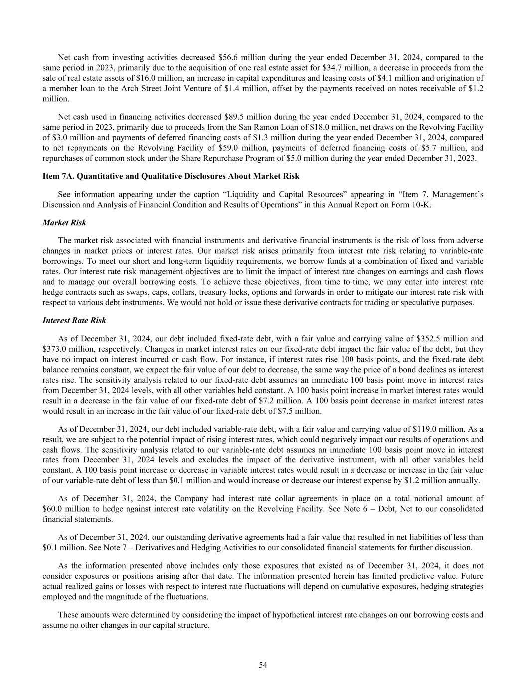 Net cash from investing activities decreased $56.6 million during the year ended December 31, 2024, compared to the same period in 2023, primarily due to the acquisition of one real estate asset for $34.7 million, a decrease in proceeds from the sale of real estate assets of $16.0 million, an increase in capital expenditures and leasing costs of $4.1 million and origination of a member loan to the Arch Street Joint Venture of $1.4 million, offset by the payments received on notes receivable of $1.2 million. Net cash used in financing activities decreased $89.5 million during the year ended December 31, 2024, compared to the same period in 2023, primarily due to proceeds from the San Ramon Loan of $18.0 million, net draws on the Revolving Facility of $3.0 million and payments of deferred financing costs of $1.3 million during the year ended December 31, 2024, compared to net repayments on the Revolving Facility of $59.0 million, payments of deferred financing costs of $5.7 million, and repurchases of common stock under the Share Repurchase Program of $5.0 million during the year ended December 31, 2023. Item 7A. Quantitative and Qualitative Disclosures About Market Risk See information appearing under the caption “Liquidity and Capital Resources” appearing in “Item 7. Management’s Discussion and Analysis of Financial Condition and Results of Operations” in this Annual Report on Form 10-K. Market Risk The market risk associated with financial instruments and derivative financial instruments is the risk of loss from adverse changes in market prices or interest rates. Our market risk arises primarily from interest rate risk relating to variable-rate borrowings. To meet our short and long-term liquidity requirements, we borrow funds at a combination of fixed and variable rates. Our interest rate risk management objectives are to limit the impact of interest rate changes on earnings and cash flows and to manage our overall borrowing costs. To achieve these objectives, from time to time, we may enter into interest rate hedge contracts such as swaps, caps, collars, treasury locks, options and forwards in order to mitigate our interest rate risk with respect to various debt instruments. We would not hold or issue these derivative contracts for trading or speculative purposes. Interest Rate Risk As of December 31, 2024, our debt included fixed-rate debt, with a fair value and carrying value of $352.5 million and $373.0 million, respectively. Changes in market interest rates on our fixed-rate debt impact the fair value of the debt, but they have no impact on interest incurred or cash flow. For instance, if interest rates rise 100 basis points, and the fixed-rate debt balance remains constant, we expect the fair value of our debt to decrease, the same way the price of a bond declines as interest rates rise. The sensitivity analysis related to our fixed-rate debt assumes an immediate 100 basis point move in interest rates from December 31, 2024 levels, with all other variables held constant. A 100 basis point increase in market interest rates would result in a decrease in the fair value of our fixed-rate debt of $7.2 million. A 100 basis point decrease in market interest rates would result in an increase in the fair value of our fixed-rate debt of $7.5 million. As of December 31, 2024, our debt included variable-rate debt, with a fair value and carrying value of $119.0 million. As a result, we are subject to the potential impact of rising interest rates, which could negatively impact our results of operations and cash flows. The sensitivity analysis related to our variable-rate debt assumes an immediate 100 basis point move in interest rates from December 31, 2024 levels and excludes the impact of the derivative instrument, with all other variables held constant. A 100 basis point increase or decrease in variable interest rates would result in a decrease or increase in the fair value of our variable-rate debt of less than $0.1 million and would increase or decrease our interest expense by $1.2 million annually. As of December 31, 2024, the Company had interest rate collar agreements in place on a total notional amount of $60.0 million to hedge against interest rate volatility on the Revolving Facility. See Note 6 – Debt, Net to our consolidated financial statements. As of December 31, 2024, our outstanding derivative agreements had a fair value that resulted in net liabilities of less than $0.1 million. See Note 7 – Derivatives and Hedging Activities to our consolidated financial statements for further discussion. As the information presented above includes only those exposures that existed as of December 31, 2024, it does not consider exposures or positions arising after that date. The information presented herein has limited predictive value. Future actual realized gains or losses with respect to interest rate fluctuations will depend on cumulative exposures, hedging strategies employed and the magnitude of the fluctuations. These amounts were determined by considering the impact of hypothetical interest rate changes on our borrowing costs and assume no other changes in our capital structure. 54