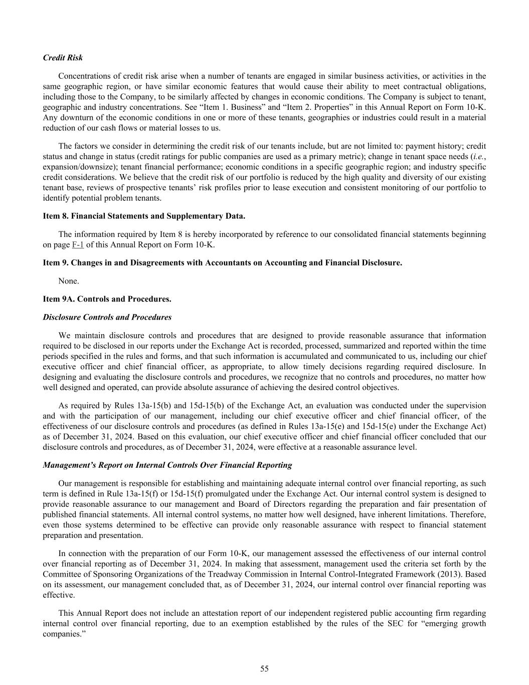 Credit Risk Concentrations of credit risk arise when a number of tenants are engaged in similar business activities, or activities in the same geographic region, or have similar economic features that would cause their ability to meet contractual obligations, including those to the Company, to be similarly affected by changes in economic conditions. The Company is subject to tenant, geographic and industry concentrations. See “Item 1. Business” and “Item 2. Properties” in this Annual Report on Form 10-K. Any downturn of the economic conditions in one or more of these tenants, geographies or industries could result in a material reduction of our cash flows or material losses to us. The factors we consider in determining the credit risk of our tenants include, but are not limited to: payment history; credit status and change in status (credit ratings for public companies are used as a primary metric); change in tenant space needs (i.e., expansion/downsize); tenant financial performance; economic conditions in a specific geographic region; and industry specific credit considerations. We believe that the credit risk of our portfolio is reduced by the high quality and diversity of our existing tenant base, reviews of prospective tenants’ risk profiles prior to lease execution and consistent monitoring of our portfolio to identify potential problem tenants. Item 8. Financial Statements and Supplementary Data. The information required by Item 8 is hereby incorporated by reference to our consolidated financial statements beginning on page F-1 of this Annual Report on Form 10-K. Item 9. Changes in and Disagreements with Accountants on Accounting and Financial Disclosure. None. Item 9A. Controls and Procedures. Disclosure Controls and Procedures We maintain disclosure controls and procedures that are designed to provide reasonable assurance that information required to be disclosed in our reports under the Exchange Act is recorded, processed, summarized and reported within the time periods specified in the rules and forms, and that such information is accumulated and communicated to us, including our chief executive officer and chief financial officer, as appropriate, to allow timely decisions regarding required disclosure. In designing and evaluating the disclosure controls and procedures, we recognize that no controls and procedures, no matter how well designed and operated, can provide absolute assurance of achieving the desired control objectives. As required by Rules 13a-15(b) and 15d-15(b) of the Exchange Act, an evaluation was conducted under the supervision and with the participation of our management, including our chief executive officer and chief financial officer, of the effectiveness of our disclosure controls and procedures (as defined in Rules 13a-15(e) and 15d-15(e) under the Exchange Act) as of December 31, 2024. Based on this evaluation, our chief executive officer and chief financial officer concluded that our disclosure controls and procedures, as of December 31, 2024, were effective at a reasonable assurance level. Management’s Report on Internal Controls Over Financial Reporting Our management is responsible for establishing and maintaining adequate internal control over financial reporting, as such term is defined in Rule 13a-15(f) or 15d-15(f) promulgated under the Exchange Act. Our internal control system is designed to provide reasonable assurance to our management and Board of Directors regarding the preparation and fair presentation of published financial statements. All internal control systems, no matter how well designed, have inherent limitations. Therefore, even those systems determined to be effective can provide only reasonable assurance with respect to financial statement preparation and presentation. In connection with the preparation of our Form 10-K, our management assessed the effectiveness of our internal control over financial reporting as of December 31, 2024. In making that assessment, management used the criteria set forth by the Committee of Sponsoring Organizations of the Treadway Commission in Internal Control-Integrated Framework (2013). Based on its assessment, our management concluded that, as of December 31, 2024, our internal control over financial reporting was effective. This Annual Report does not include an attestation report of our independent registered public accounting firm regarding internal control over financial reporting, due to an exemption established by the rules of the SEC for “emerging growth companies.” 55