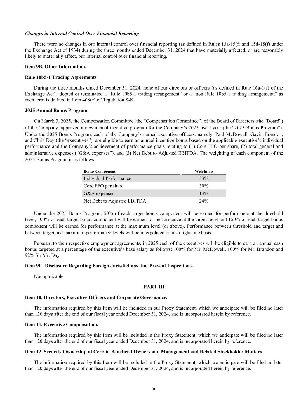 Changes in Internal Control Over Financial Reporting There were no changes in our internal control over financial reporting (as defined in Rules 13a-15(f) and 15d-15(f) under the Exchange Act of 1934) during the three months ended December 31, 2024 that have materially affected, or are reasonably likely to materially affect, our internal control over financial reporting. Item 9B. Other Information. Rule 10b5-1 Trading Agreements During the three months ended December 31, 2024, none of our directors or officers (as defined in Rule 16a-1(f) of the Exchange Act) adopted or terminated a “Rule 10b5-1 trading arrangement” or a “non-Rule 10b5-1 trading arrangement,” as each term is defined in Item 408(c) of Regulation S-K. 2025 Annual Bonus Program On March 3, 2025, the Compensation Committee (the “Compensation Committee”) of the Board of Directors (the “Board”) of the Company, approved a new annual incentive program for the Company’s 2025 fiscal year (the “2025 Bonus Program”). Under the 2025 Bonus Program, each of the Company’s named executive officers, namely, Paul McDowell, Gavin Brandon, and Chris Day (the “executives”), are eligible to earn an annual incentive bonus based on the applicable executive’s individual performance and the Company’s achievement of performance goals relating to (1) Core FFO per share, (2) total general and administrative expenses (“G&A expenses”), and (3) Net Debt to Adjusted EBITDA. The weighting of each component of the 2025 Bonus Program is as follows: Bonus Component Weighting Individual Performance 33% Core FFO per share 30% G&A expenses 13% Net Debt to Adjusted EBITDA 24% Under the 2025 Bonus Program, 50% of each target bonus component will be earned for performance at the threshold level, 100% of each target bonus component will be earned for performance at the target level and 150% of each target bonus component will be earned for performance at the maximum level (or above). Performance between threshold and target and between target and maximum performance levels will be interpolated on a straight-line basis. Pursuant to their respective employment agreements, in 2025 each of the executives will be eligible to earn an annual cash bonus targeted at a percentage of the executive’s base salary as follows: 100% for Mr. McDowell, 100% for Mr. Brandon and 92% for Mr. Day. Item 9C. Disclosure Regarding Foreign Jurisdictions that Prevent Inspections. Not applicable. PART III Item 10. Directors, Executive Officers and Corporate Governance. The information required by this Item will be included in our Proxy Statement, which we anticipate will be filed no later than 120 days after the end of our fiscal year ended December 31, 2024, and is incorporated herein by reference. Item 11. Executive Compensation. The information required by this Item will be included in the Proxy Statement, which we anticipate will be filed no later than 120 days after the end of our fiscal year ended December 31, 2024, and is incorporated herein by reference. Item 12. Security Ownership of Certain Beneficial Owners and Management and Related Stockholder Matters. The information required by this Item will be included in the Proxy Statement, which we anticipate will be filed no later than 120 days after the end of our fiscal year ended December 31, 2024, and is incorporated herein by reference. 56
